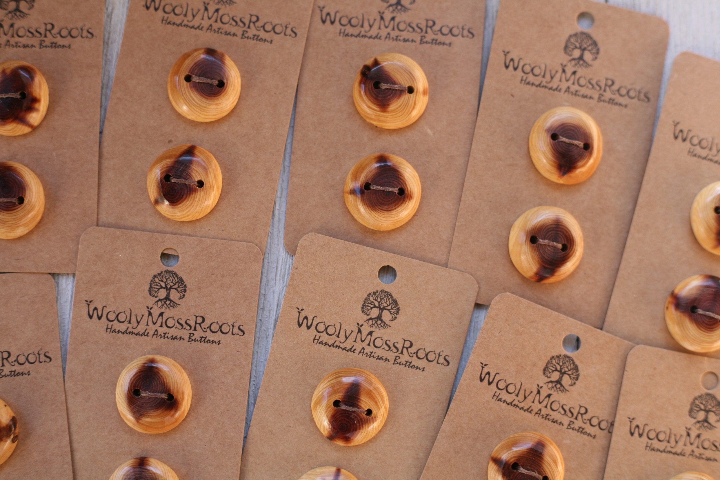 These wooden buttons were created by my husband Jeff in red cedar wood. I love this wood! For one, I am a cedar fan and then you add that gorgeous deep red tone in the center of the western red cedar and I'm smitten. It's so beautiful with the reddish hue in the center, surrounded by lighter. He sands and polishes these buttons so smooth, you'll love the way they feel. All the sanding and polishing also brings out the beauty of the wood, and makes it glow.