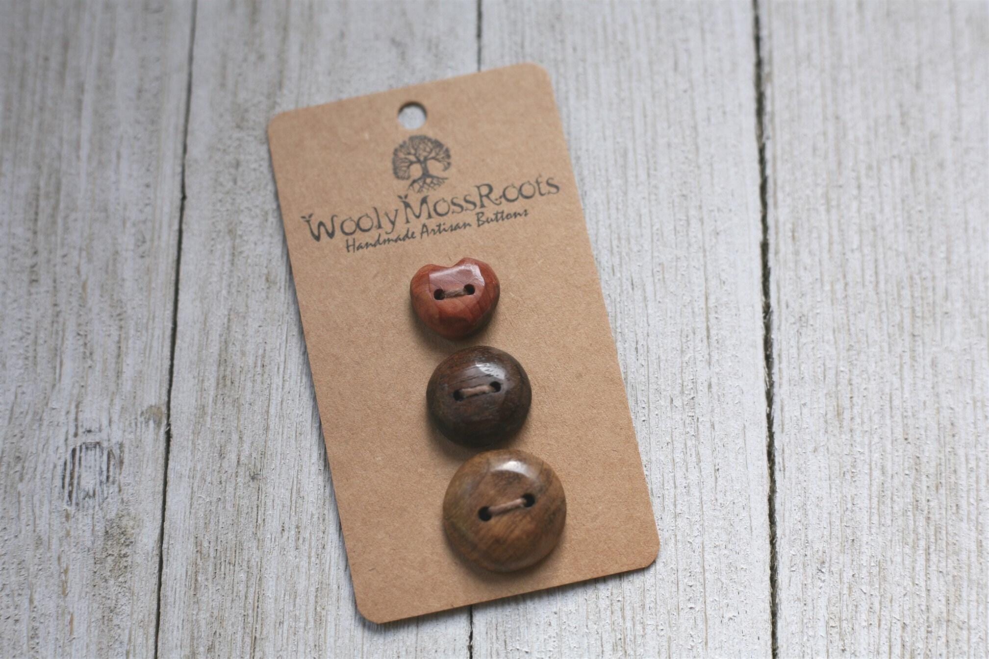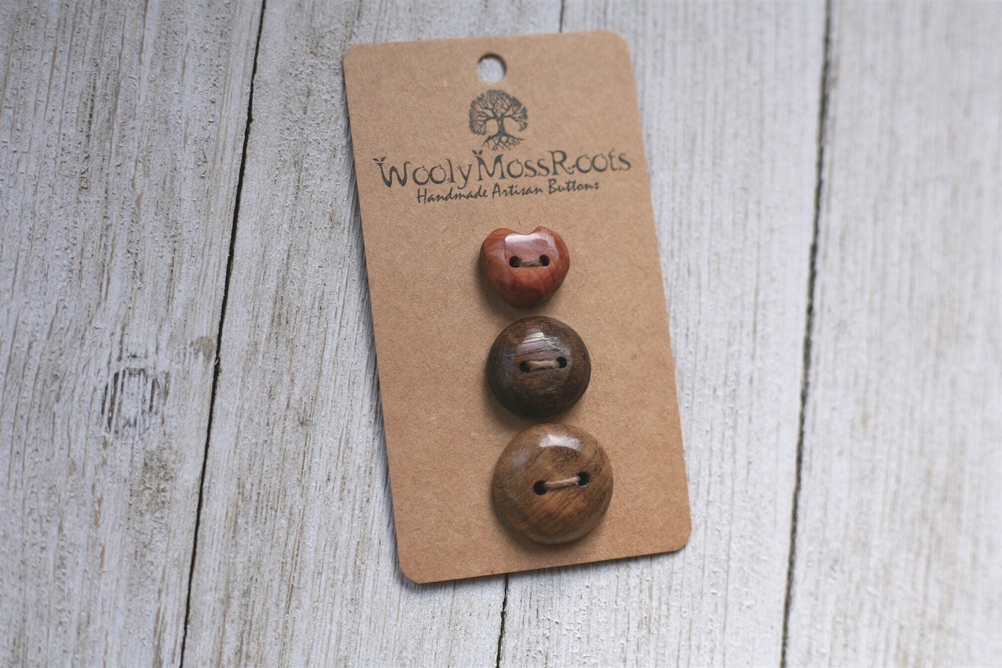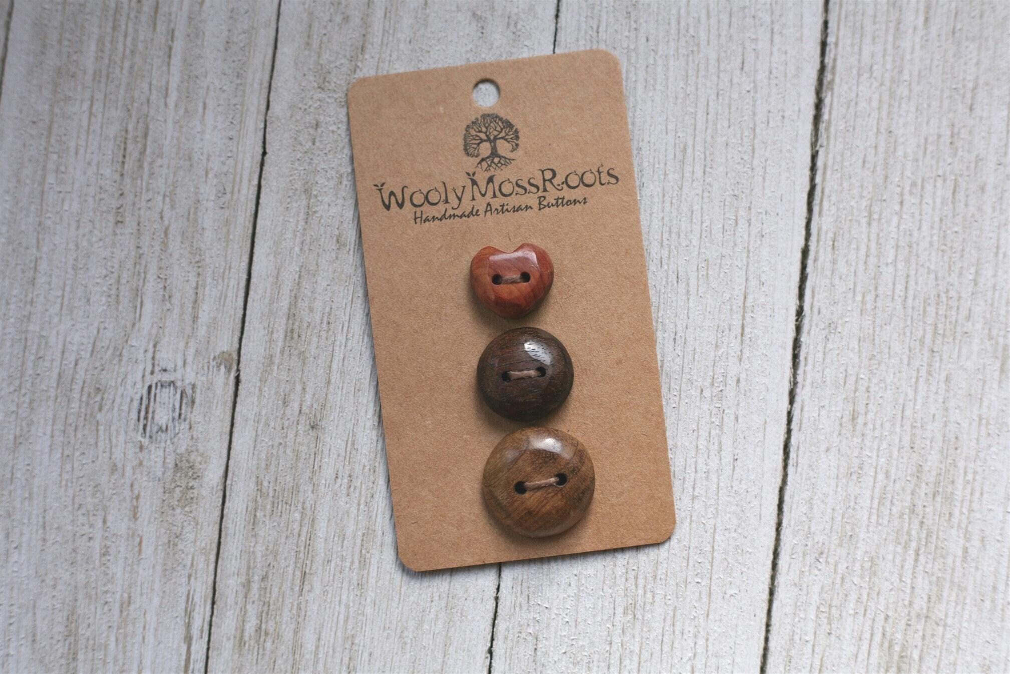 These buttons were created by my husband Jeff in a variety of woods. This set includes one carved heart button in red cedar wood, one button in black walnut wood, and one button in Oregon myrtlewood. There are some gorgeous buttons in this set!