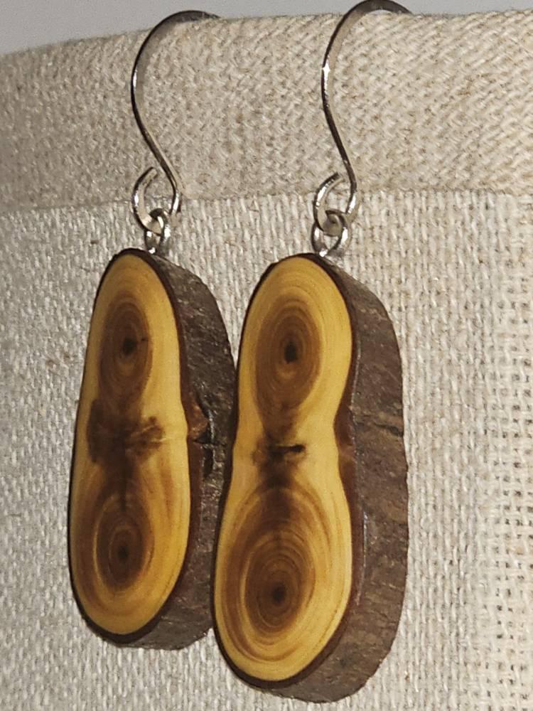 These earrings were created by my husband Jeff in Oregon yew wood. Can you believe how beautiful this wood is? We love it so much! The deep reddish hue in the center, surrounded by the light warm hue, and then the darker border of the natural bark around the edges- it makes for the most incredible contrast and the most stunning earrings! Also this particular part in the branch had two rings centers, and made the coolest design. All the sanding and polishing also brings out the beauty of the wood, and makes it glow. These earrings come on sterling silver plated ear wires. I love the rings of growth and the unique designs in the grain- these earrings are truly one of a kind! You'll notice that each earring in this pair is different- they are not a "perfect" match- they are nature made, and I love that about them.