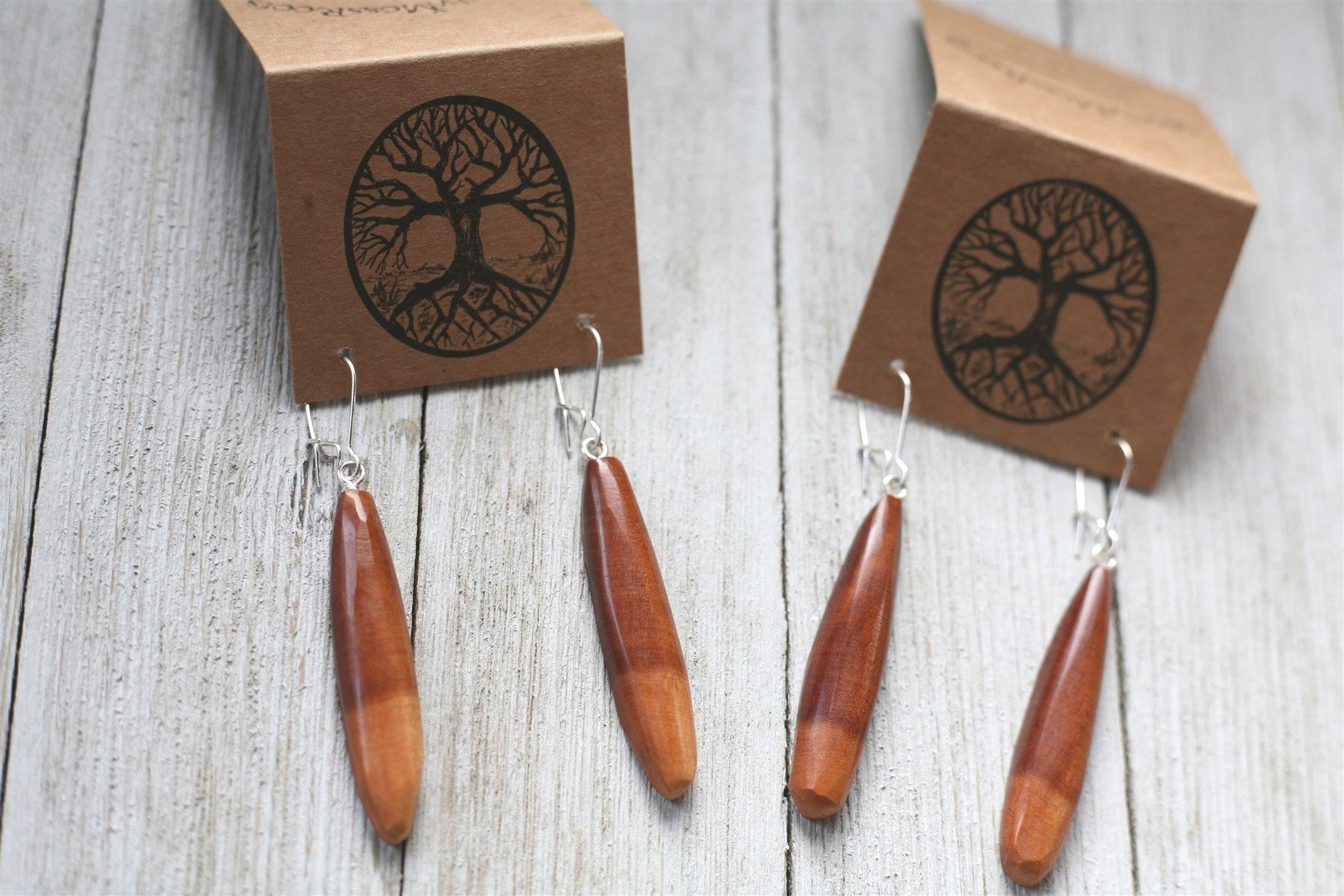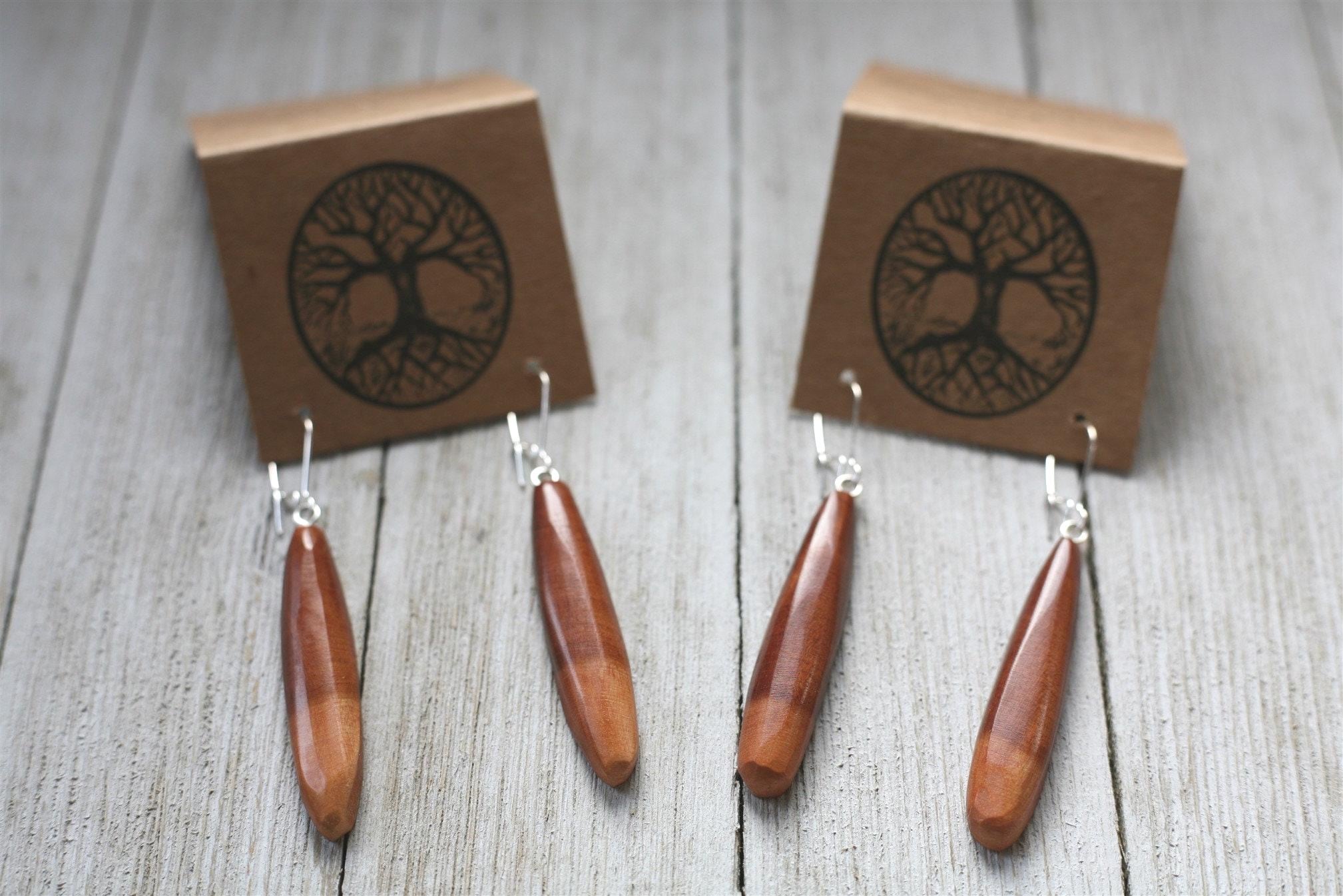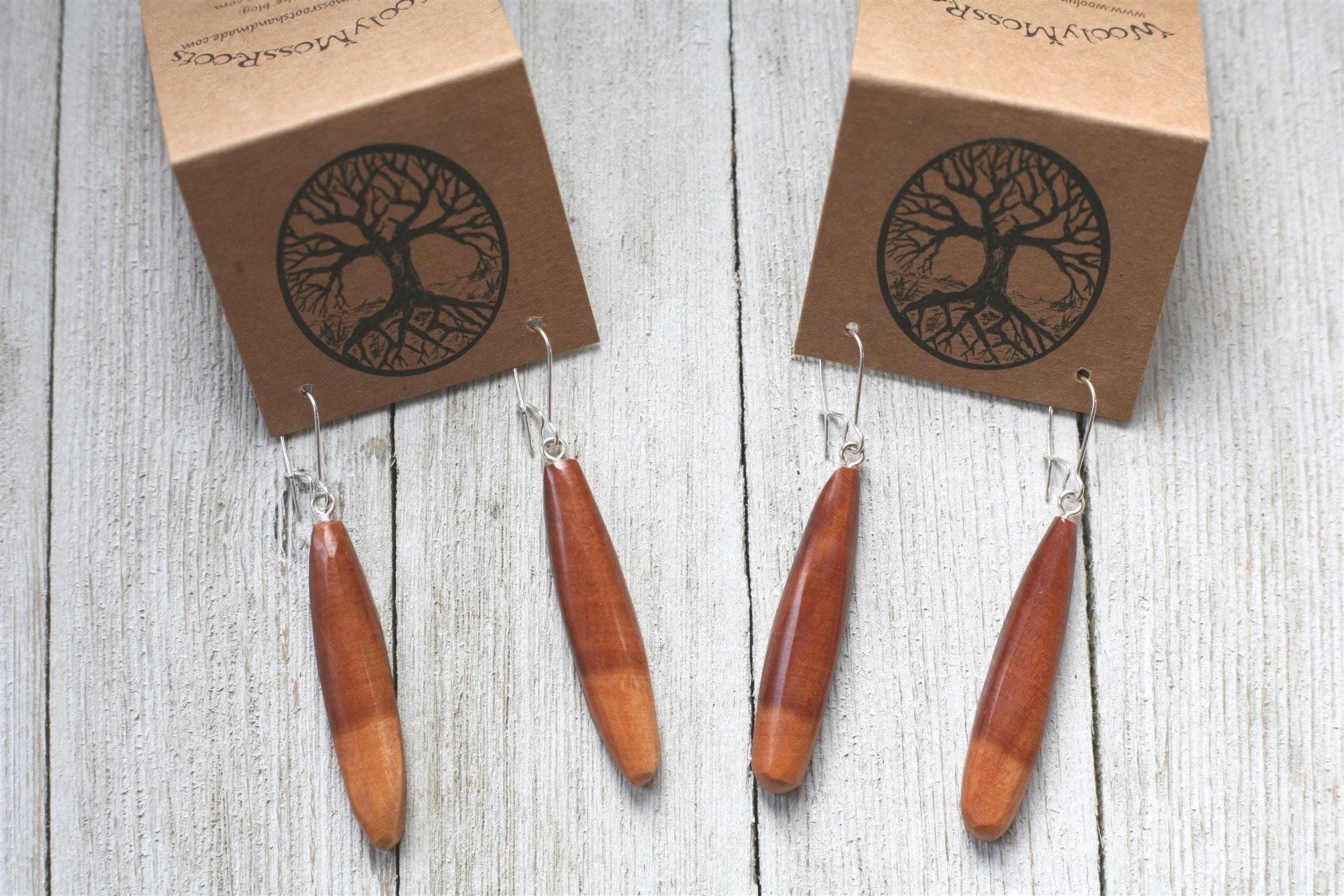 Many of our earrings are surprisingly lightweight, even with the denser woods, but if you are looking for our most lightweight earrings- cedar is the way to go. These earrings come on sterling silver plated ear wires.