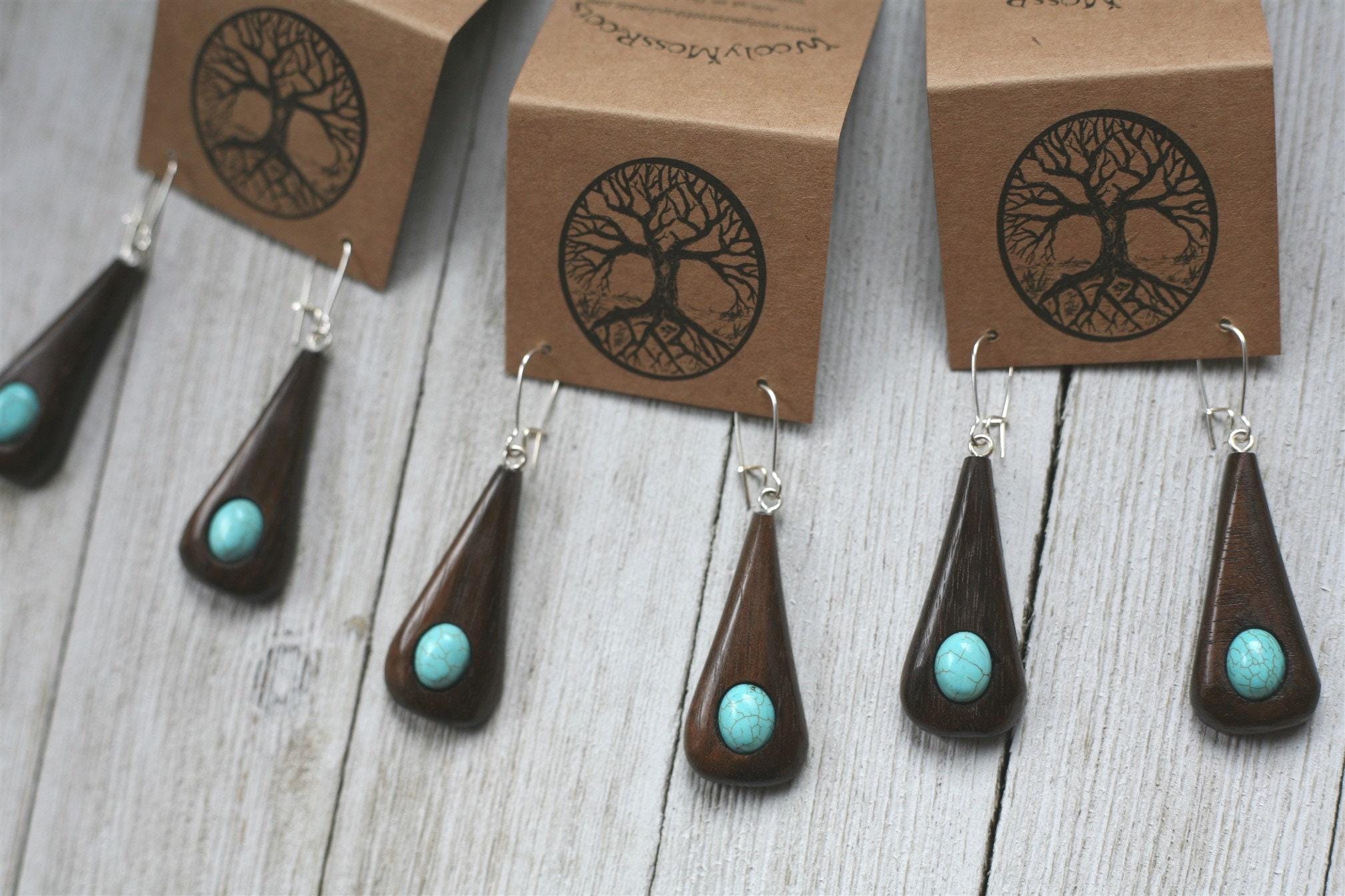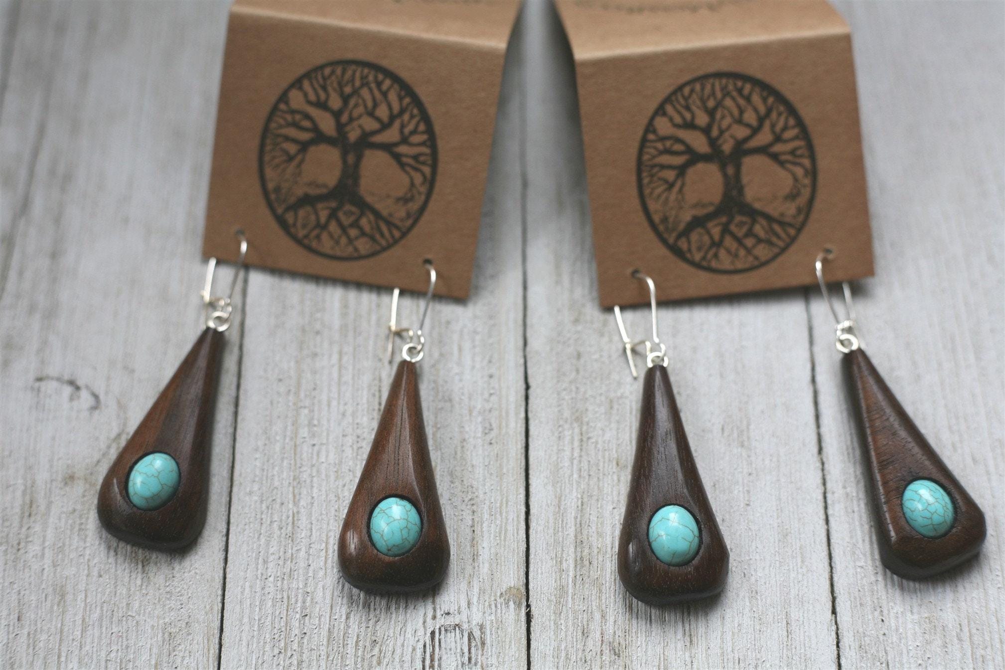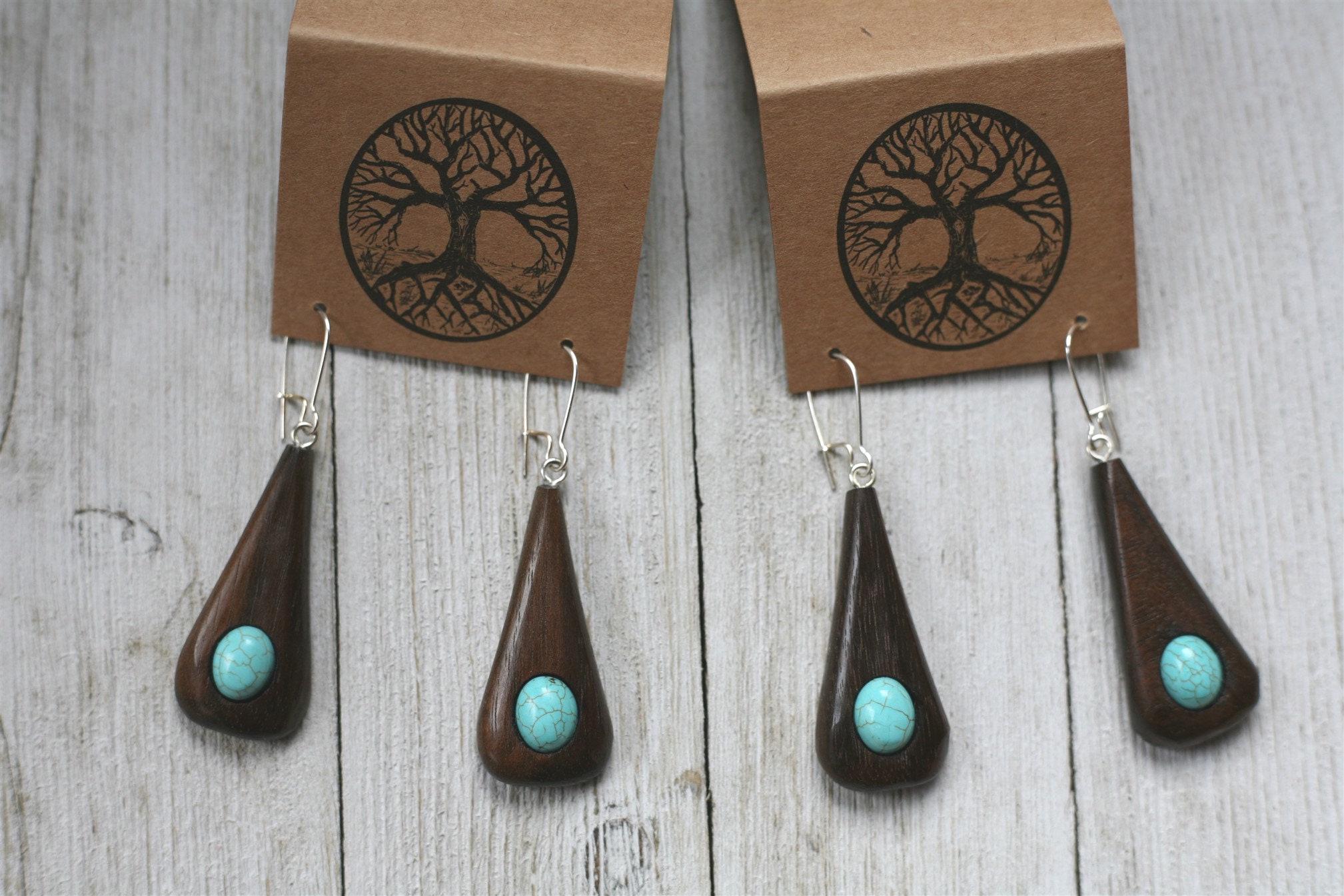 These wood & turquoise earrings were created by my husband Jeff in black walnut wood. Isn't the deep hue of the black walnut wood beautiful? I love the shape of these earrings, and the beautiful blue turquoise stones.