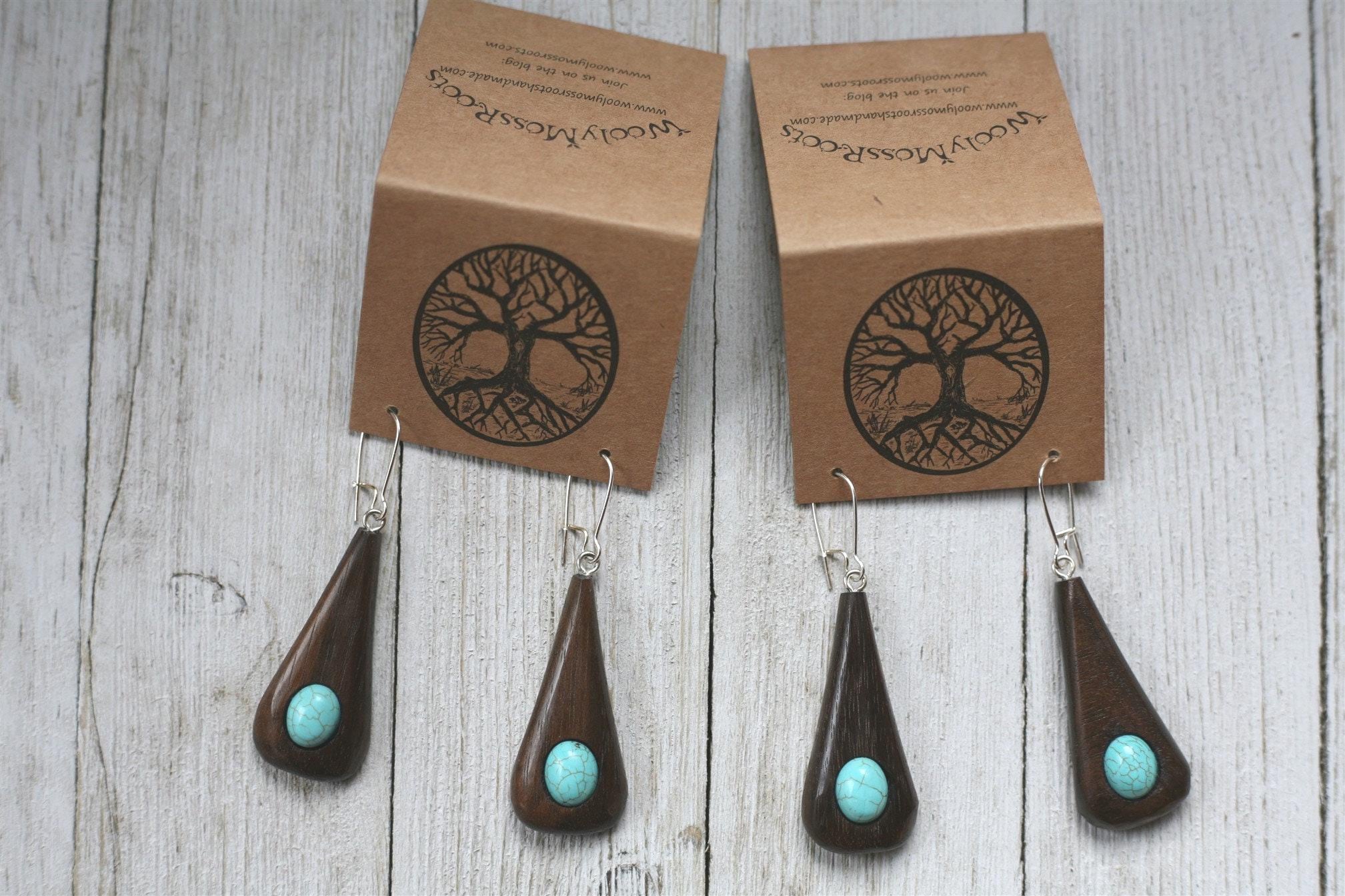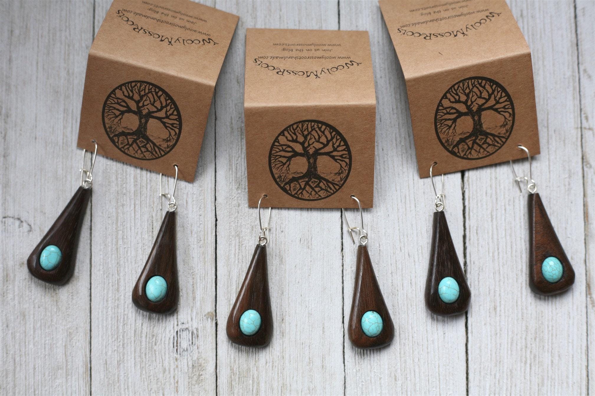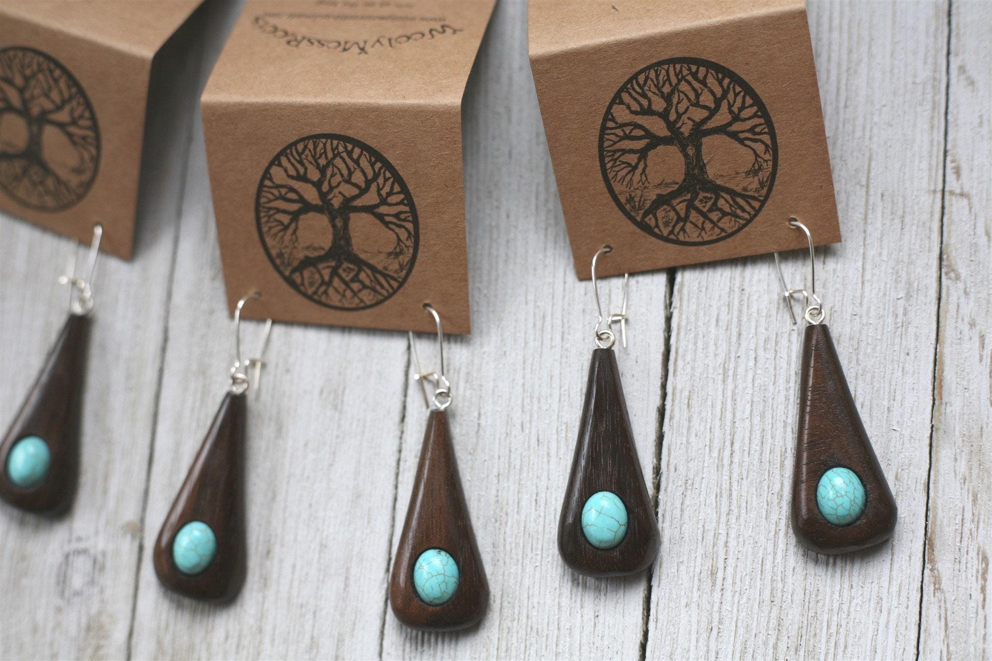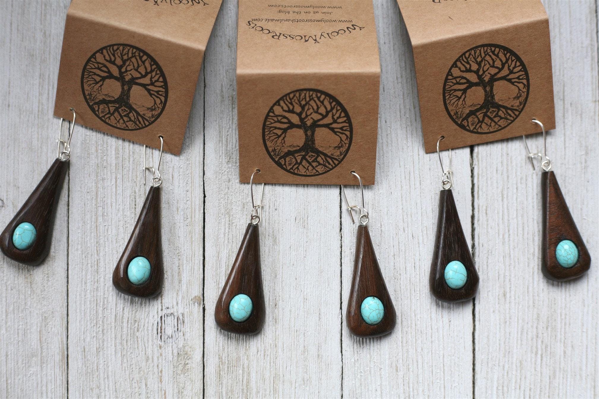 These wood & turquoise earrings were created by my husband Jeff in black walnut wood. Isn't the deep hue of the black walnut wood beautiful? I love the shape of these earrings, and the beautiful blue turquoise stones.
