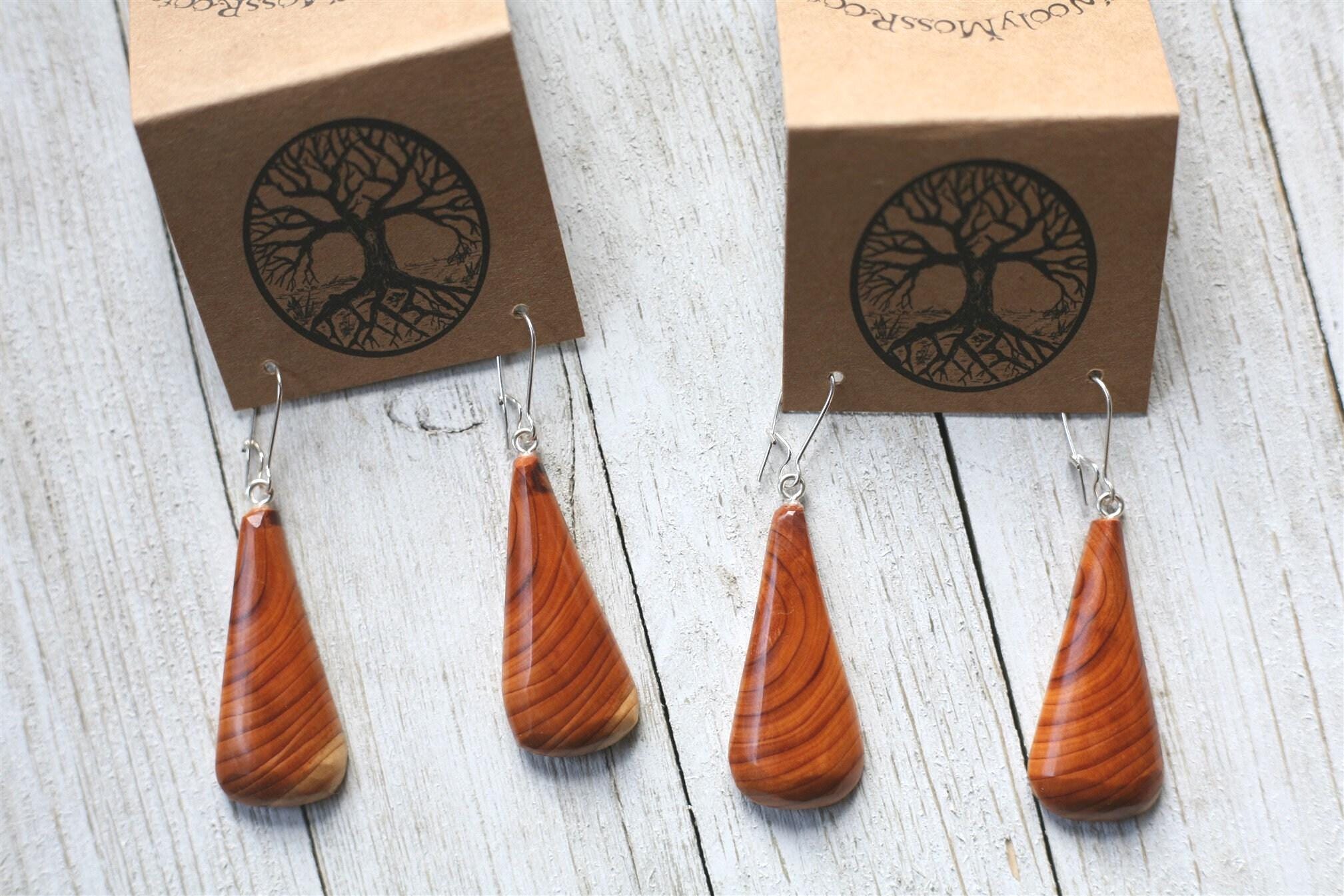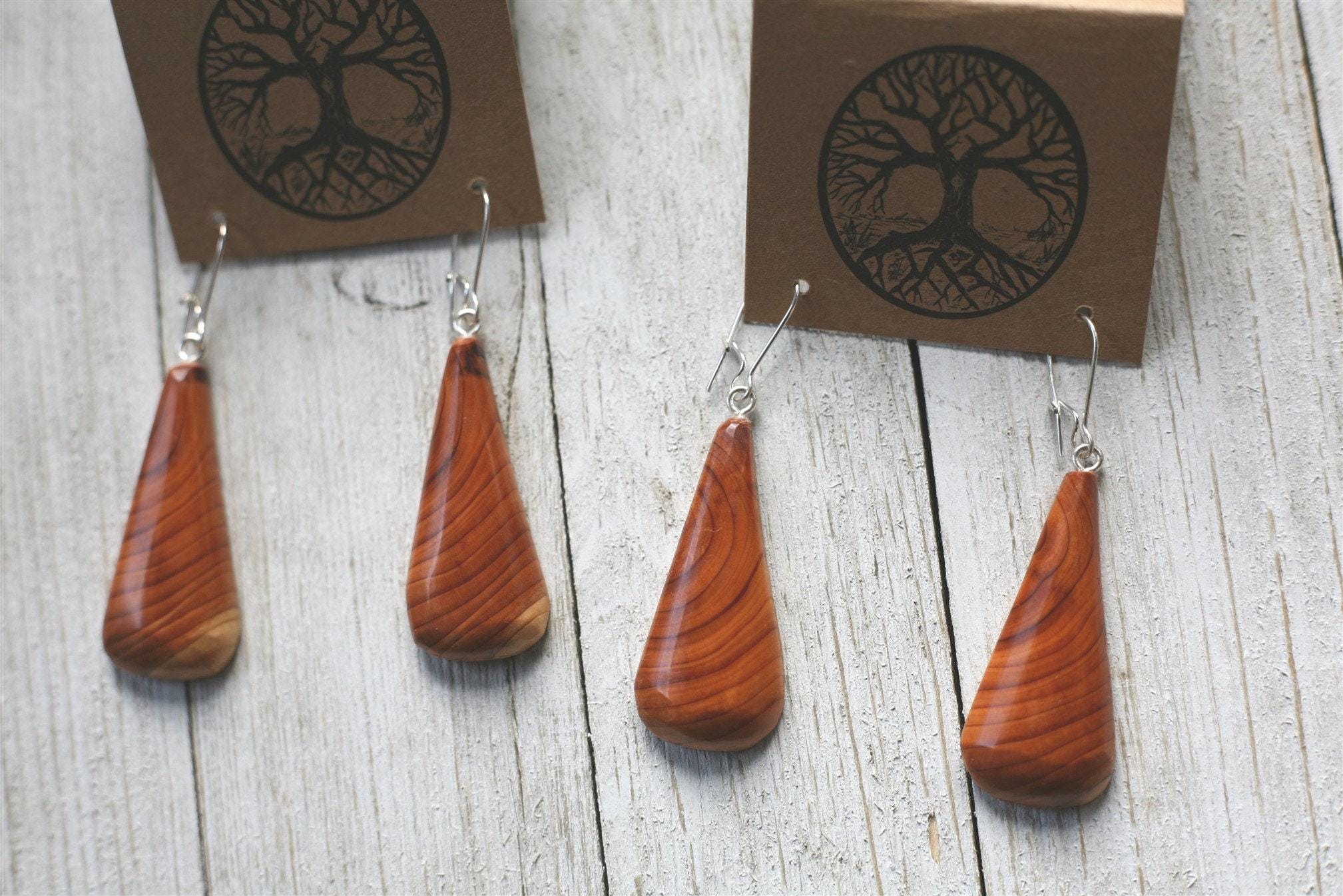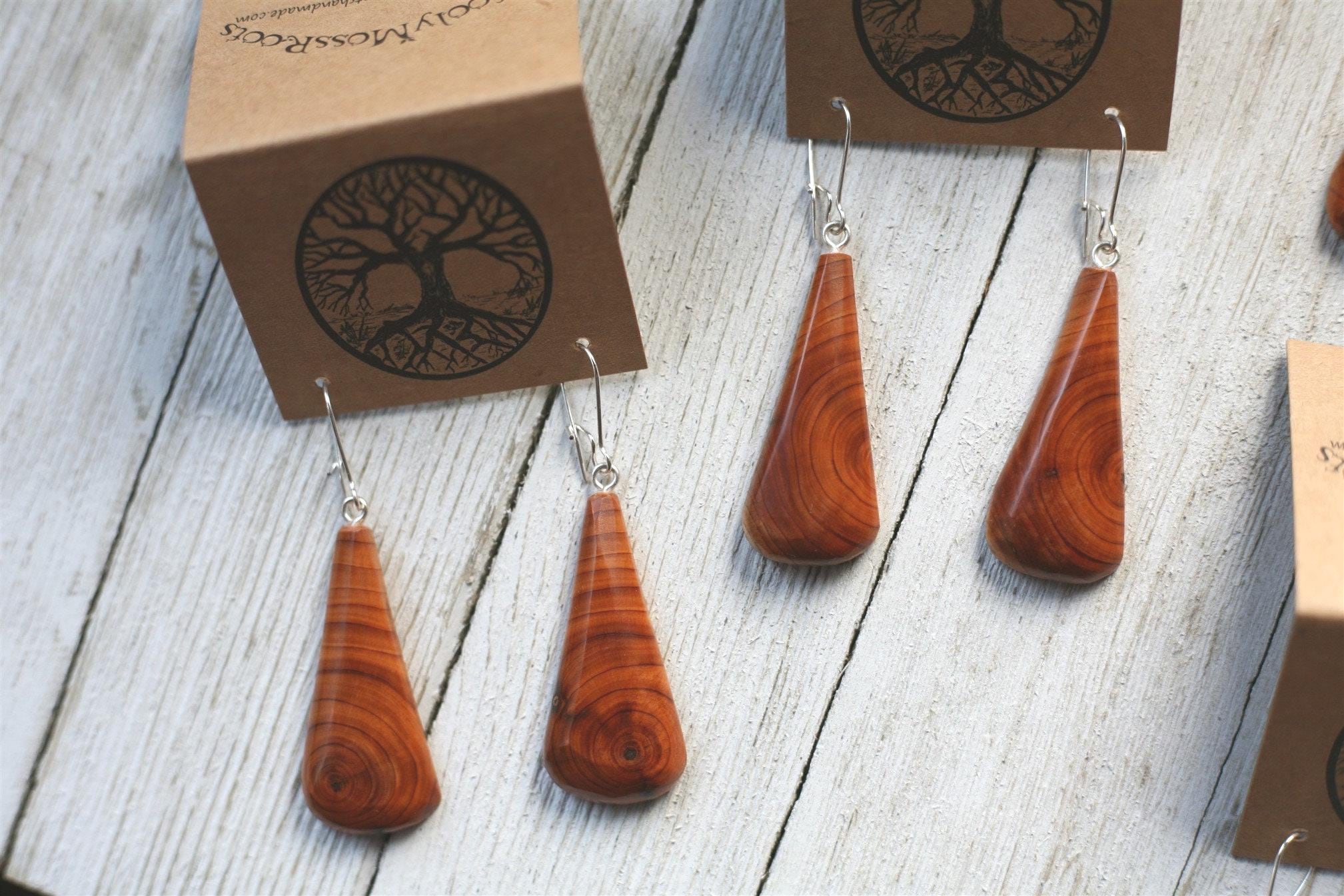 Beautiful wood + lots of sanding + natural oil finish + polishing on the buffing wheel + a whole lotta love = some gorgeous and unique jewelry for you to enjoy. With so many fun designs and variations to choose from, we hope you'll find something you'll love!