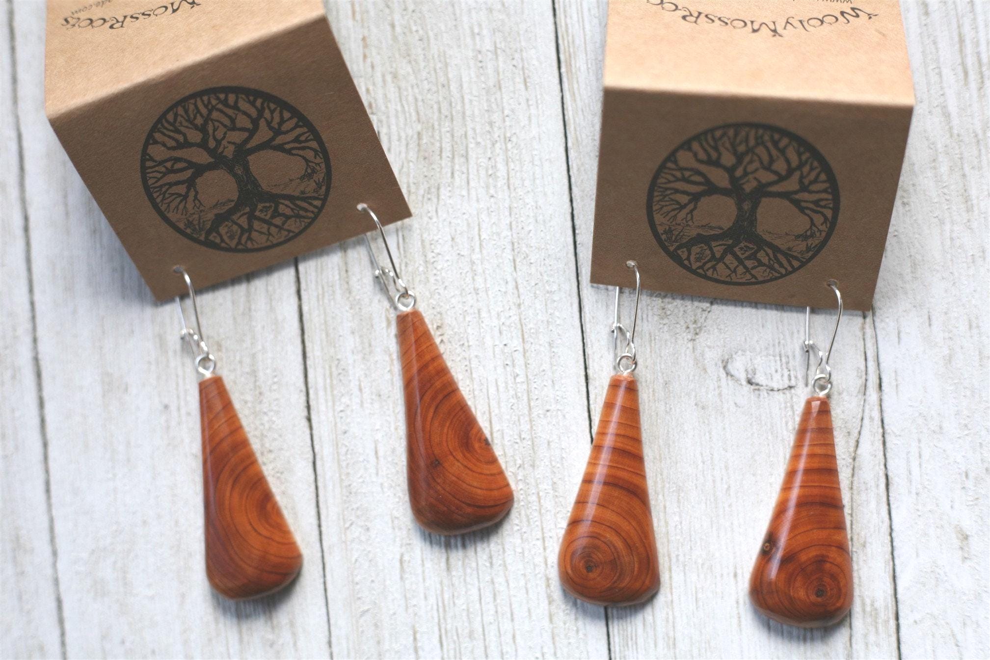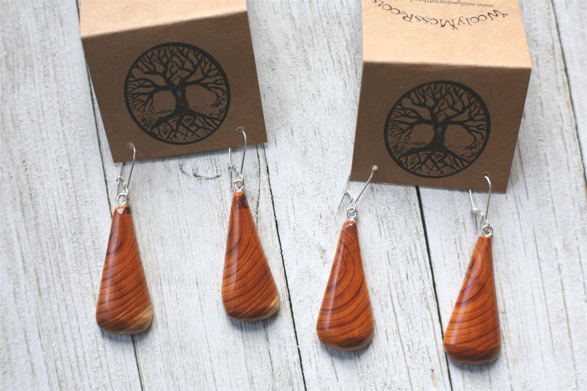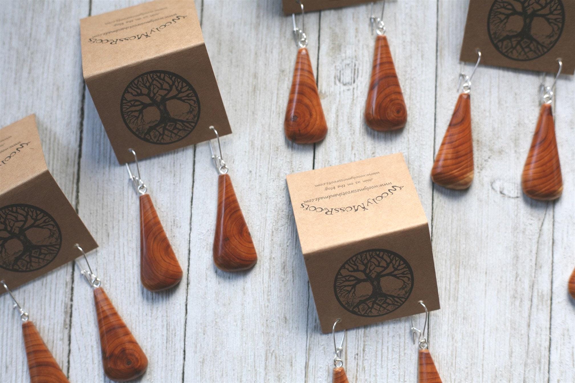 Beautiful wood + lots of sanding + natural oil finish + polishing on the buffing wheel + a whole lotta love = some gorgeous and unique jewelry for you to enjoy. With so many fun designs and variations to choose from, we hope you'll find something you'll love!