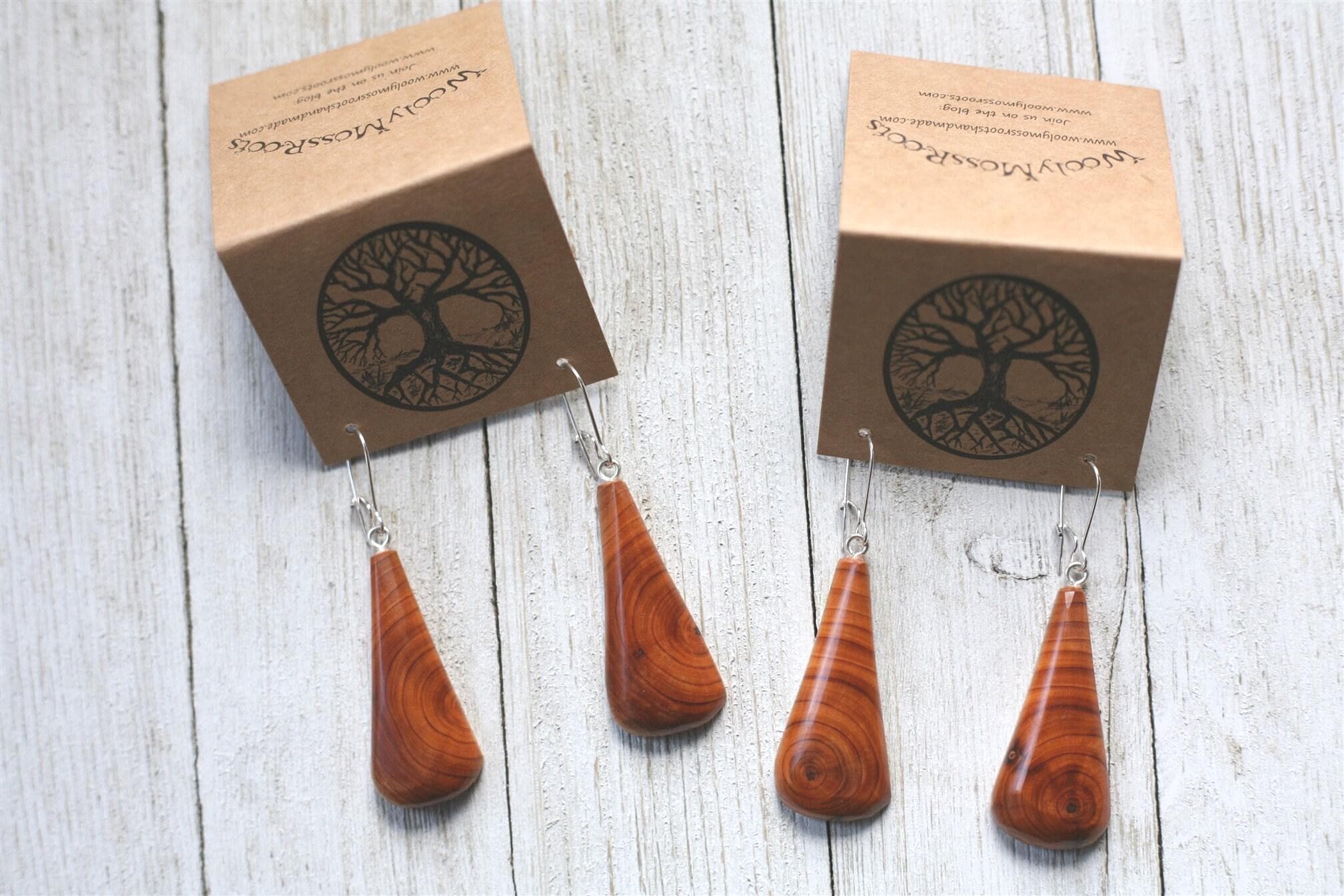 These earrings were created by my husband Jeff in Oregon yew wood. Yew is such a gorgeous wood! I love it's warm hue. There is a different pattern in the grain of each earring, and they are all so beautiful! I absolutely love the rings of growth, and so enjoy looking at the unique beauty in each and every pair.