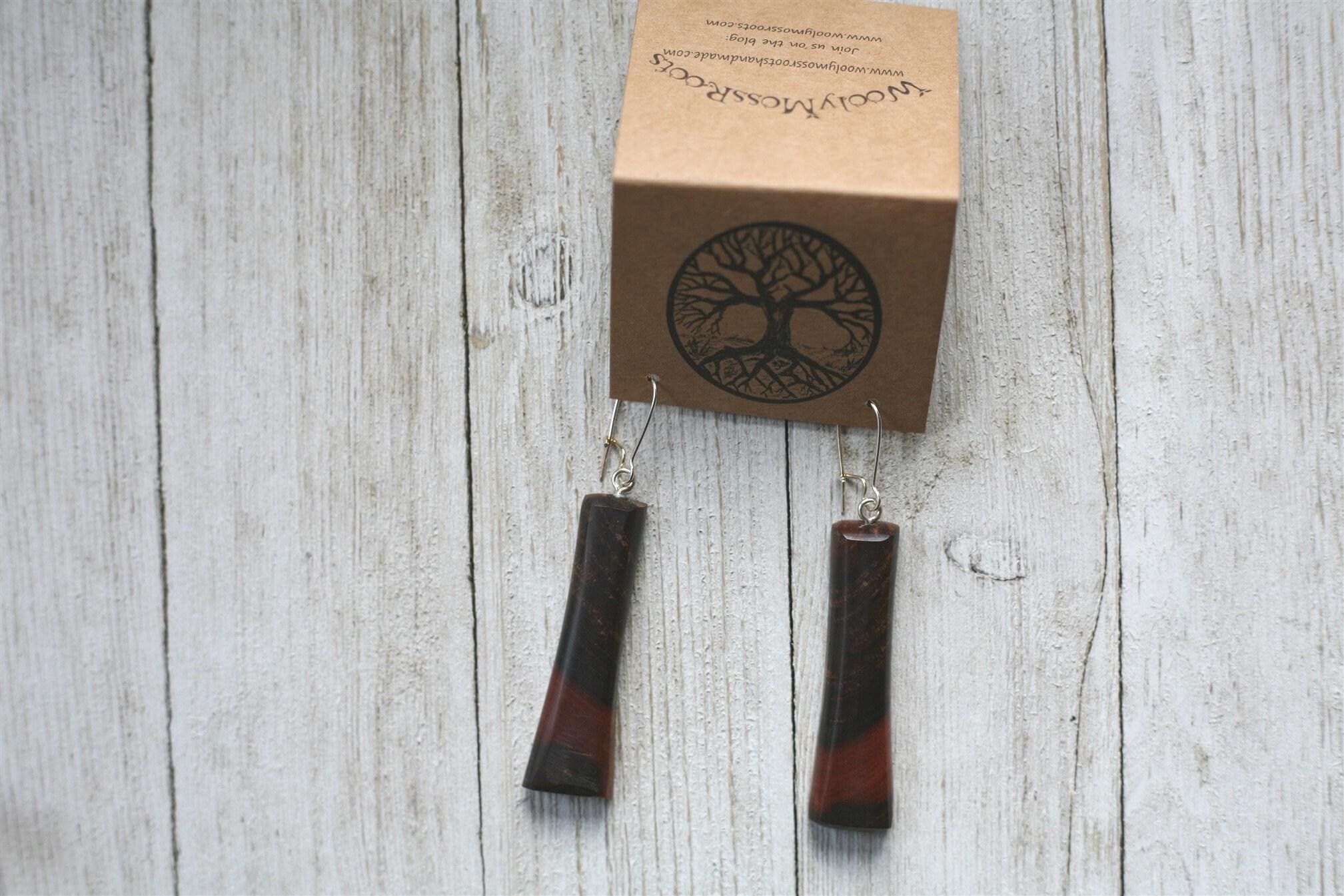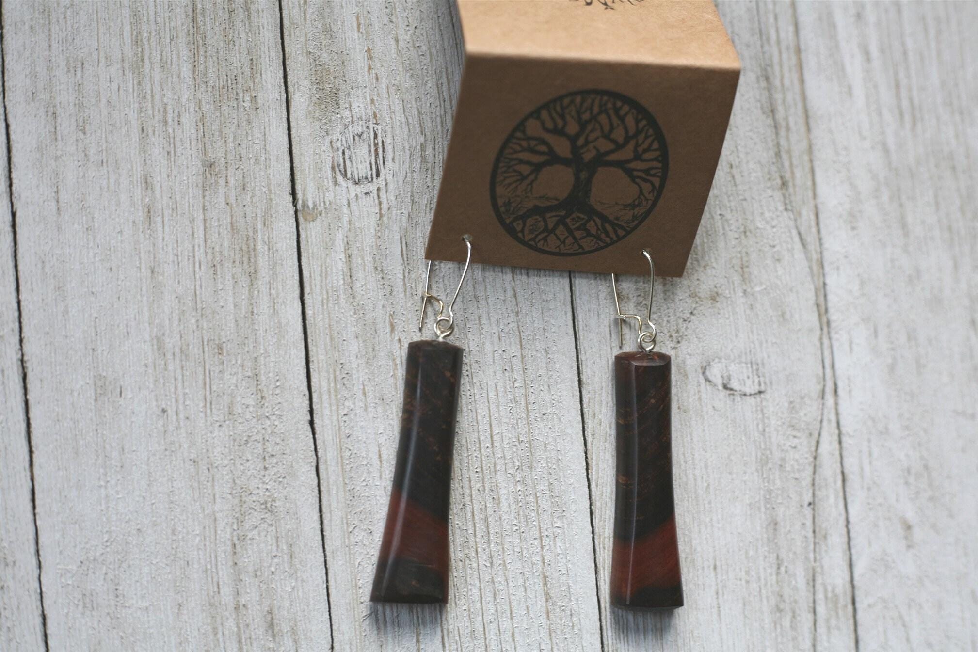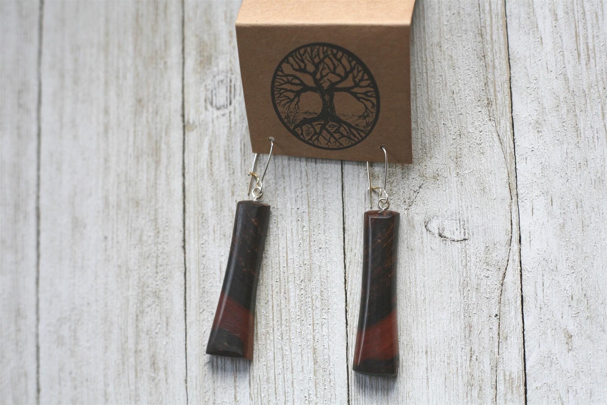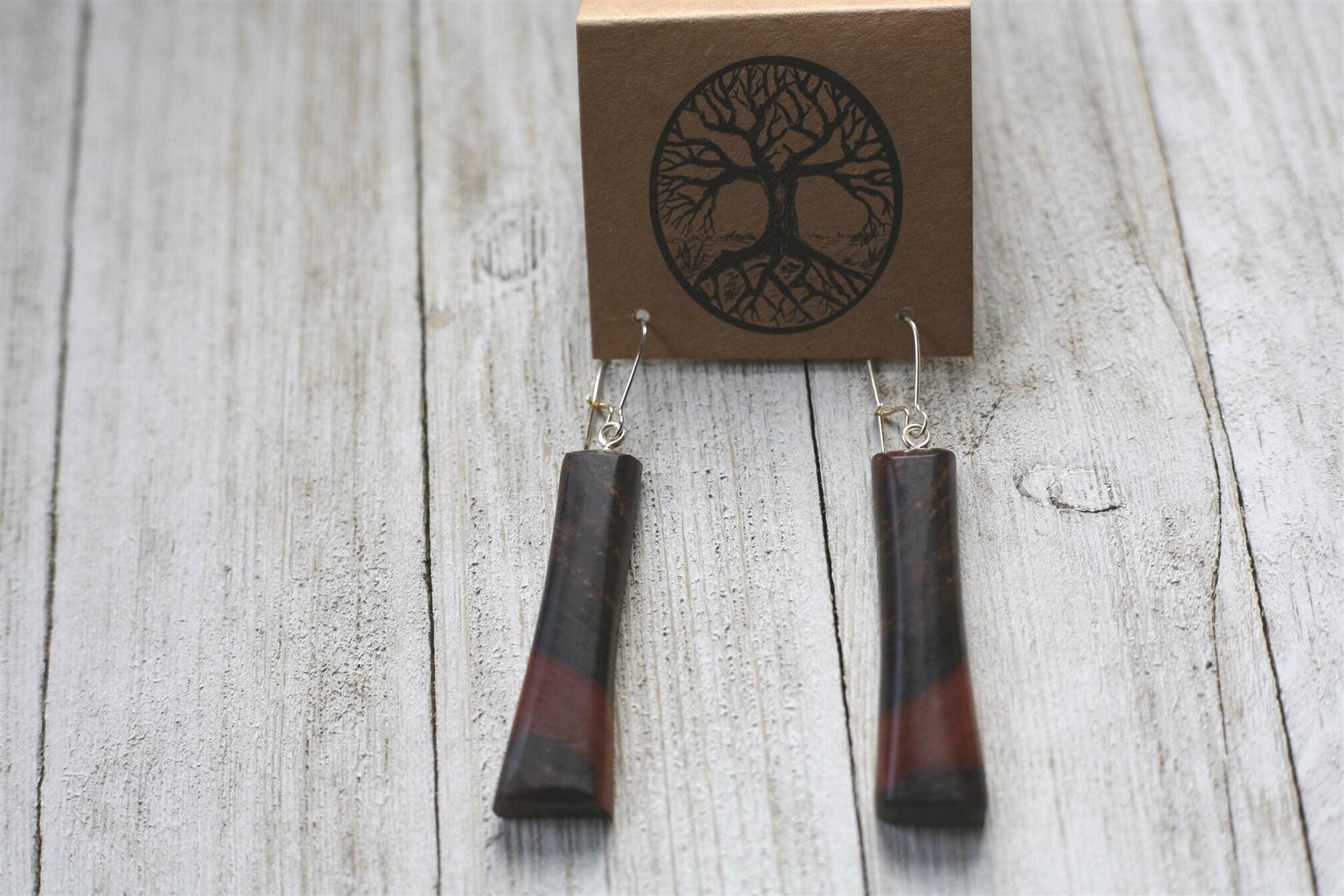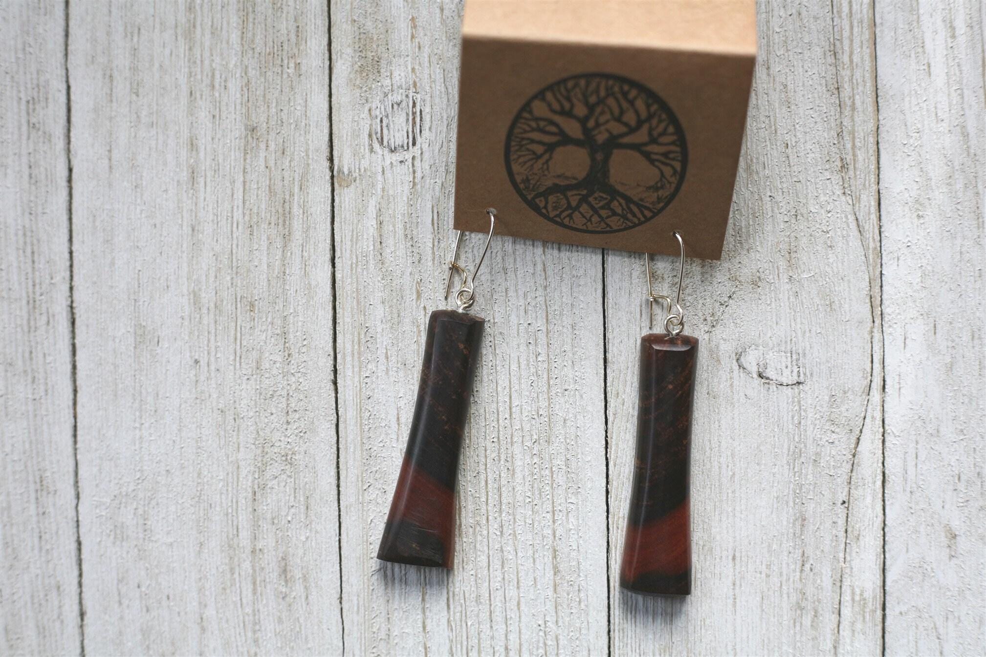 These earrings were created by my husband Jeff in one of our very favorite woods of all time- mountain mahogany. Mountain mahogany is just gorgeous. The colors can have such a wide range, and I love the deep hue of these earrings, with the streak of deep red near the bottom. I also love the shape of these, and the feel. They just feel good to hold!