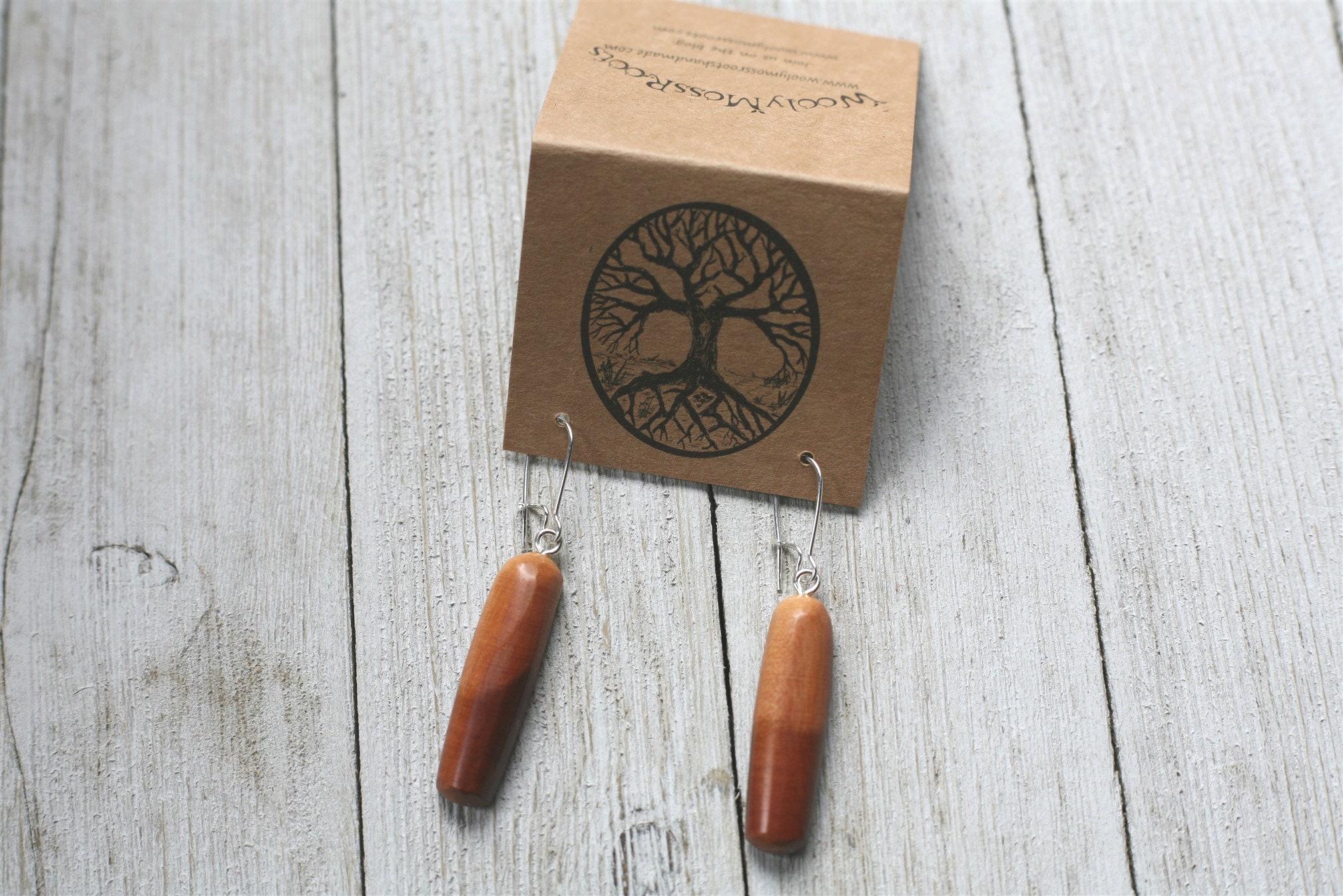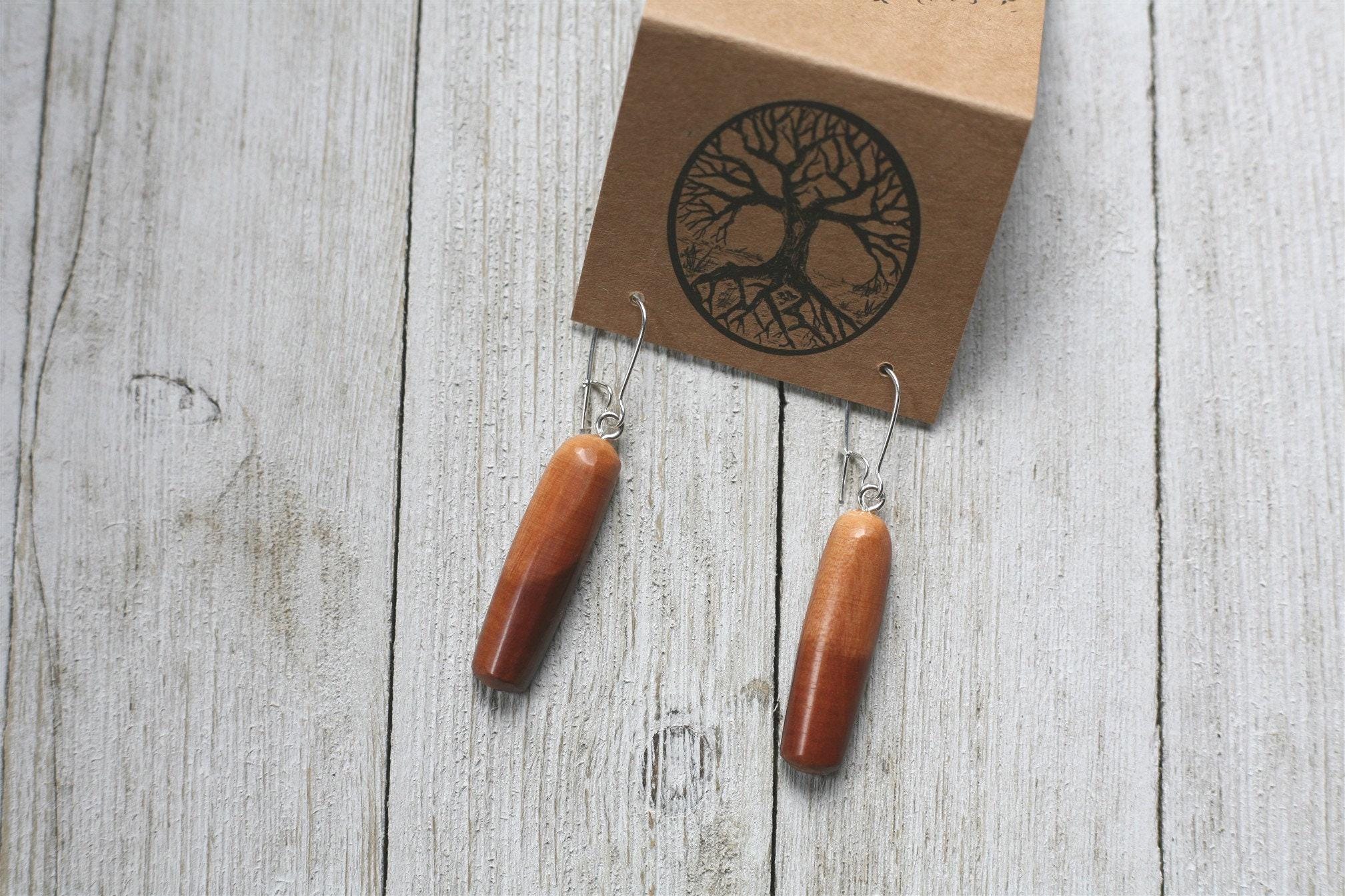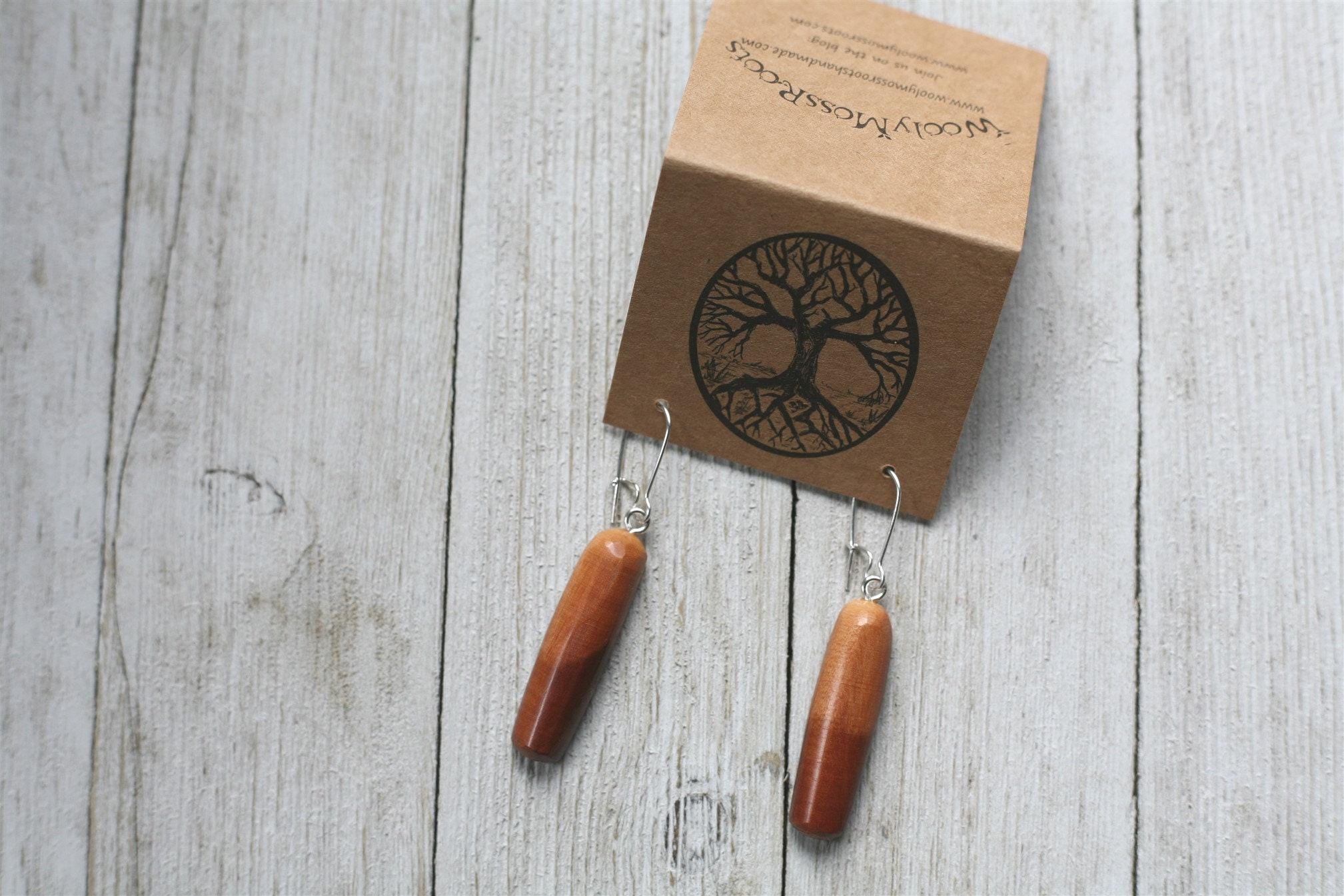 (Many of our earrings are surprisingly lightweight, even in the denser woods. If you are looking for our most lightweight earrings, the smaller size earrings and earrings in cedar wood are a good option.) These earrings come on sterling silver plated ear wires.