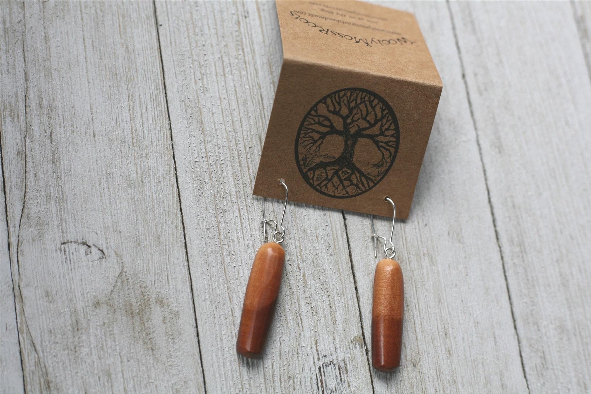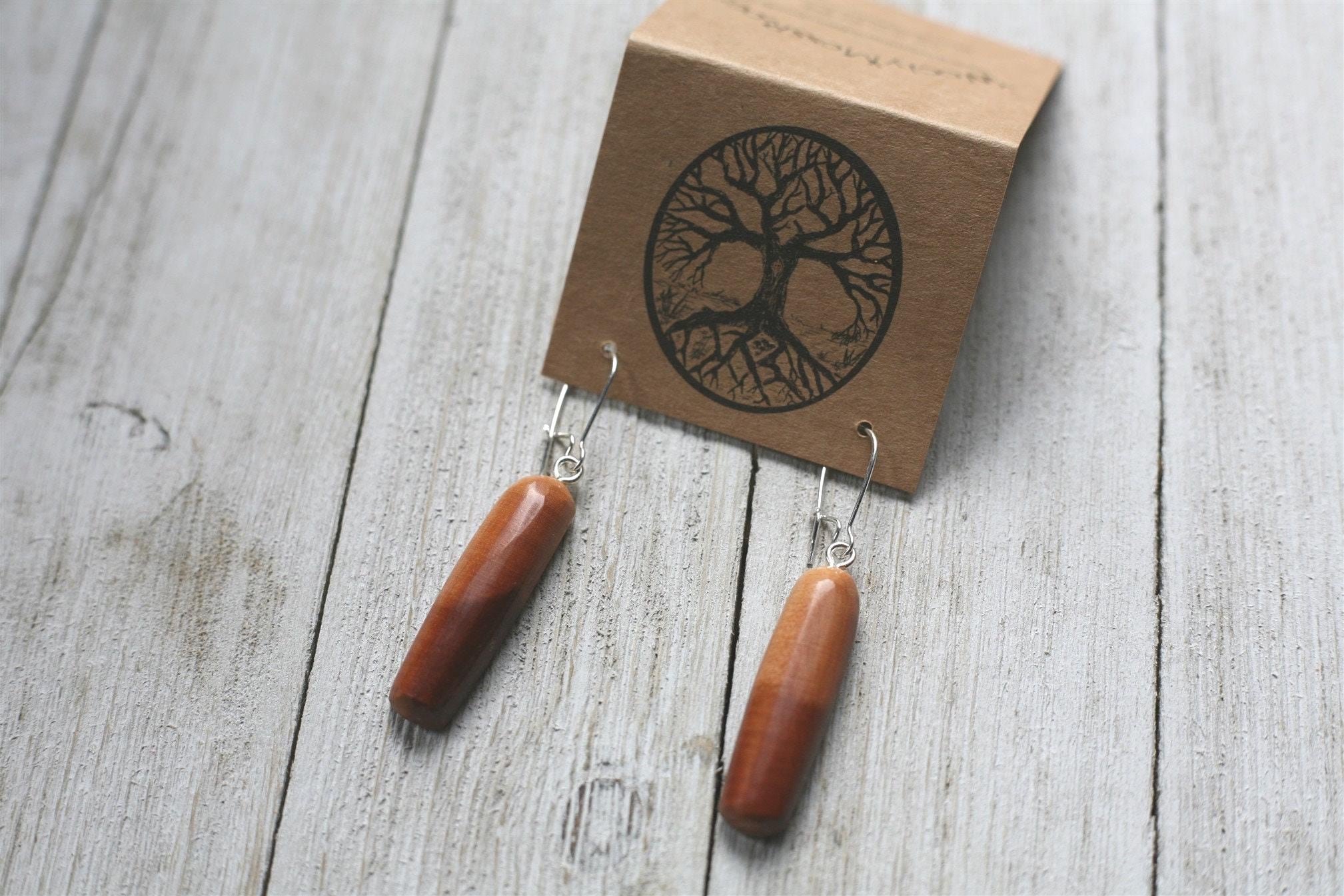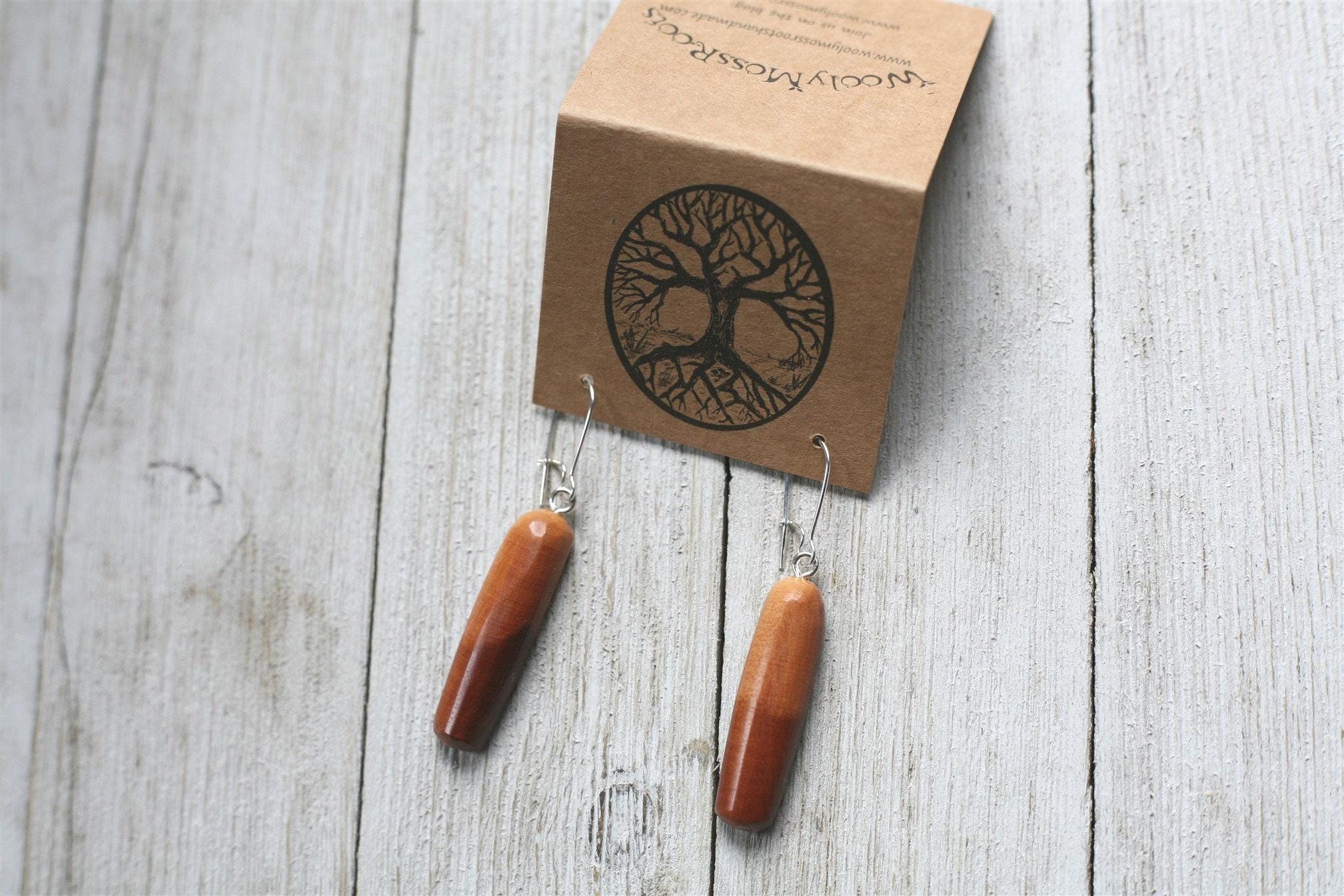 (Many of our earrings are surprisingly lightweight, even in the denser woods. If you are looking for our most lightweight earrings, the smaller size earrings and earrings in cedar wood are a good option.) These earrings come on sterling silver plated ear wires.