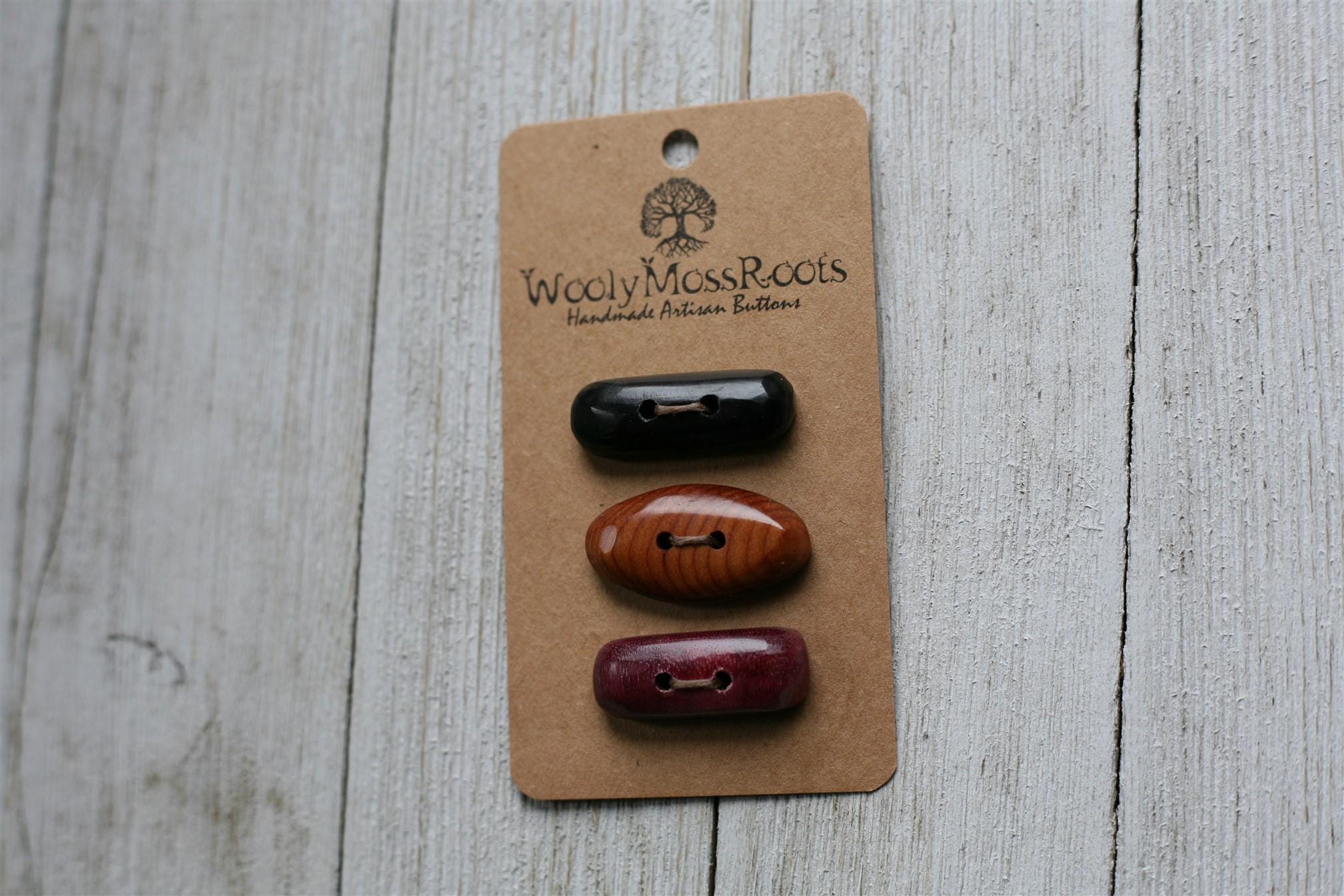 He sands and polishes the buttons so smooth, you'll love the way they feel. All the sanding and polishing also brings out the beauty of the wood, and makes it glow. Full of handmade character, these unique toggles will make a fun addition to garments!
