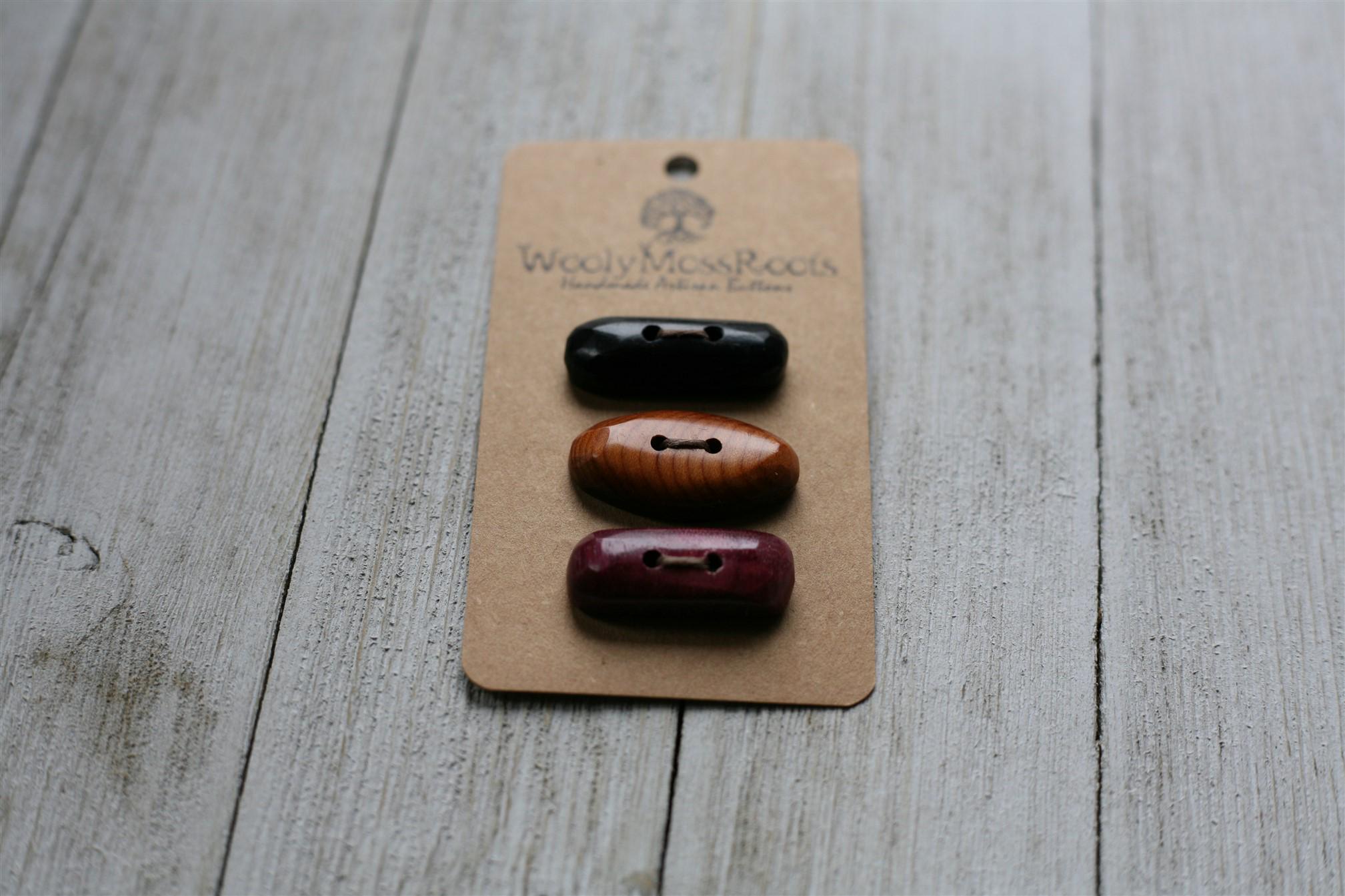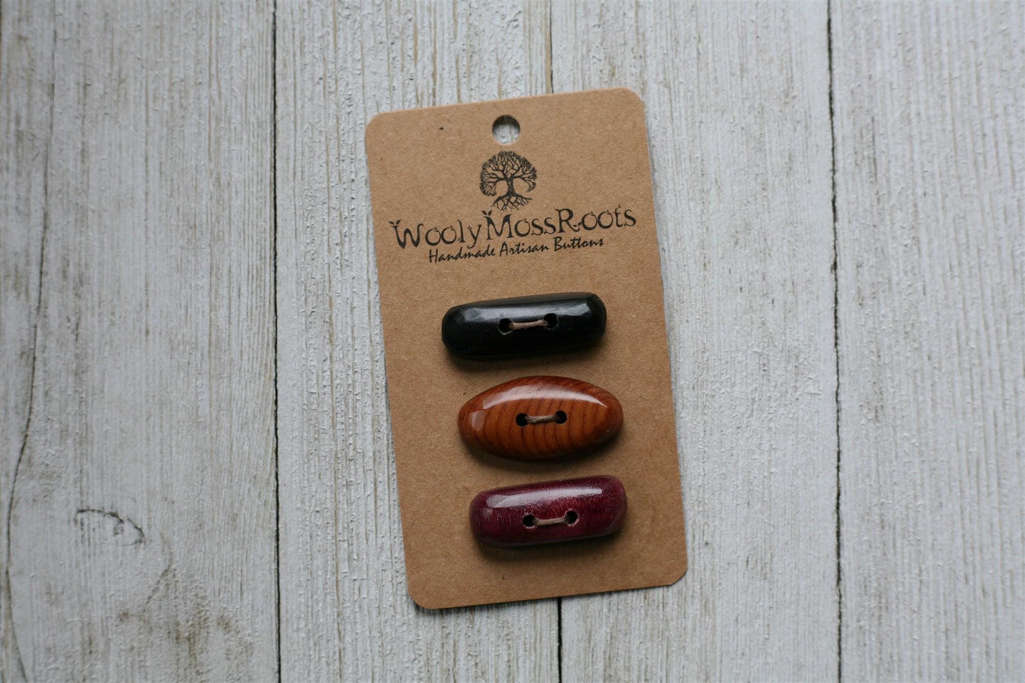 These toggle buttons were created by my husband Jeff in reclaimed ebony wood, Oregon yew wood, and reclaimed purpleheart wood. All beautiful woods that go together to make a fun mix!
