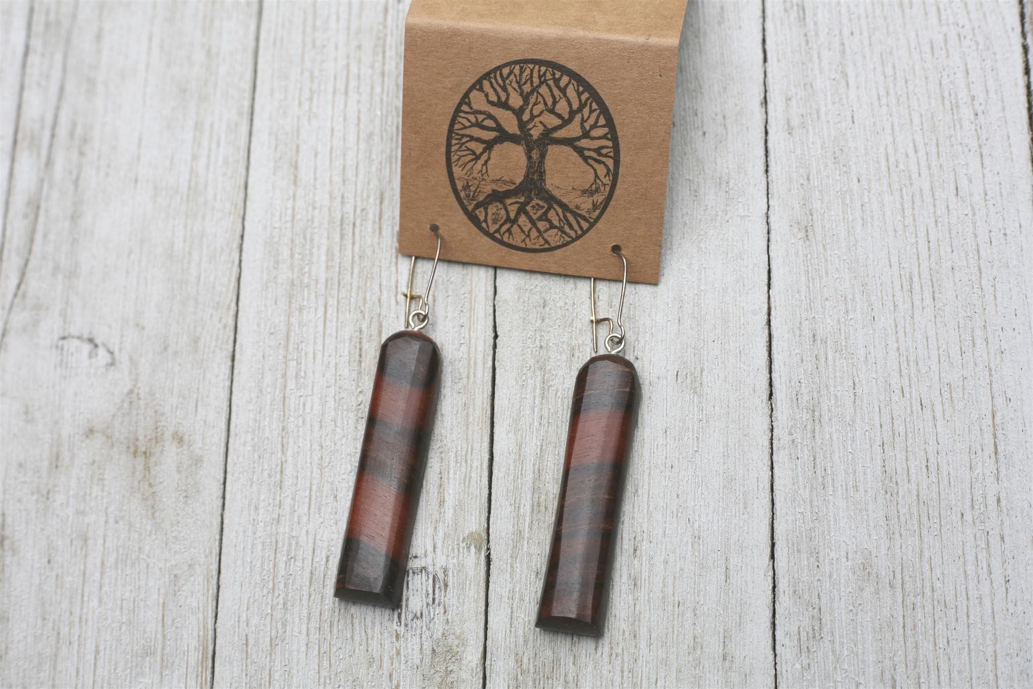 These earrings feel like polished stone. Jeff sands and polishes the earrings so smooth, you'll love the way they feel. All the sanding and polishing also brings out the beauty of the wood, and makes it glow.
