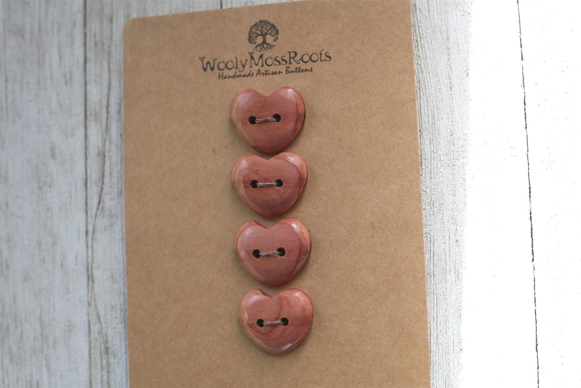 These handmade wooden heart buttons were created by my husband Jeff in red cedar wood. I love the rosy hue of red cedar. And I love the hearts!