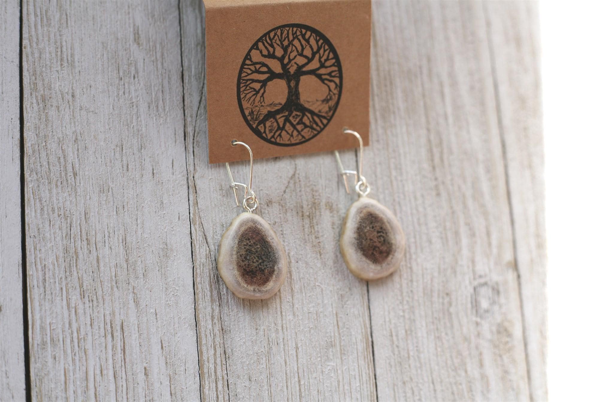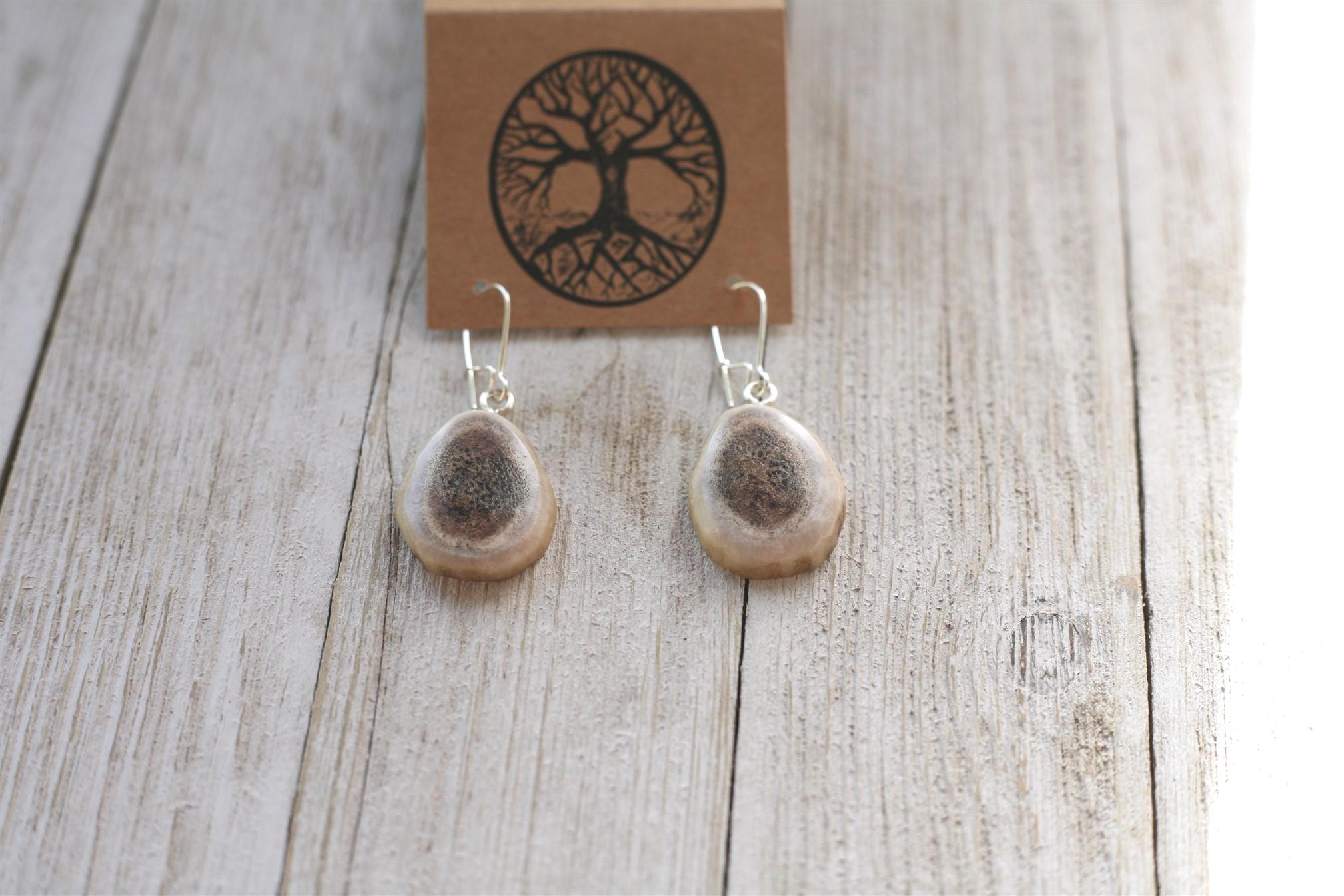 This particular pair of earrings has gone through a process to stabilize the antler. This is a write-up from Jeff about the process to keep the bark on certain woods, which is the same process. A note from Jeff: "A lot of folks like the look of buttons with the bark still on them, but this isn't possible with most woods because the bark will come off right away. So I came up with a method of adhering the bark with a special inert (non-toxic) adhesive that permeates the bark then holds it to the main wood. Any adhesive on the surface of the button is then sanded and polished off. This gives a really nice look especially with Hemlock and Sassafras."