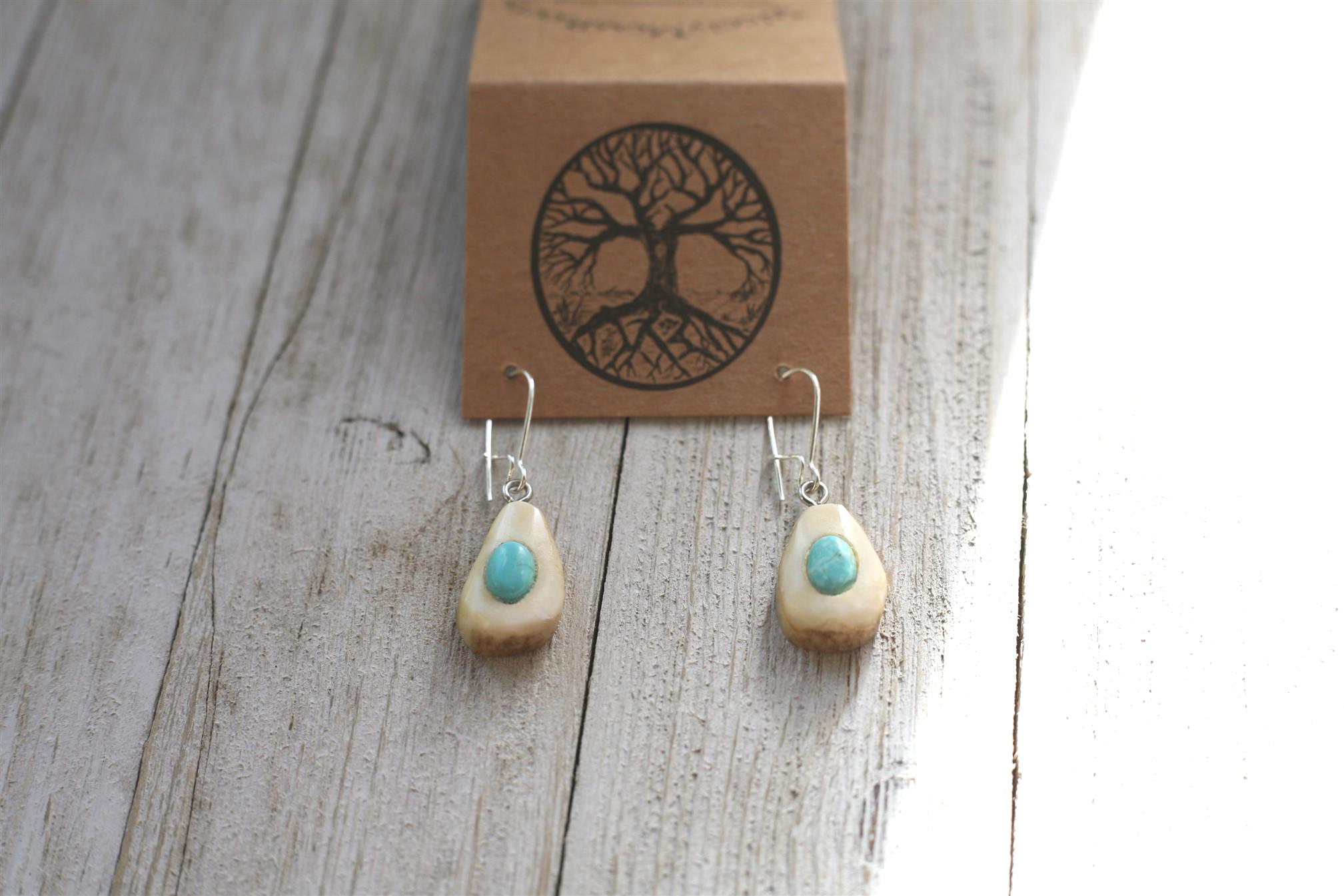 Jeff set a beautiful blue turquoise stone in the center of each, which really shines out. This pair of earrings is one of the smallest and most adorable ones he has made with the turquoise in antler yet.