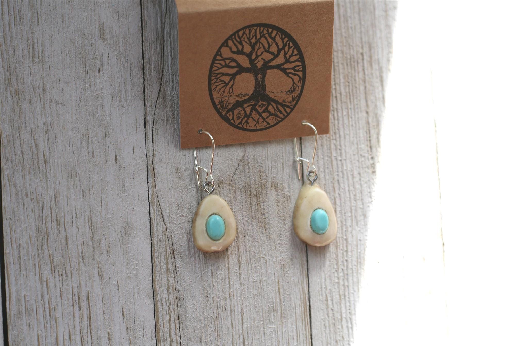 I love the natural shape of these earrings, and how each one is completely unique and yet they pair together beautifully. Full of handmade character. Jeff set a beautiful blue turquoise stone in the center of each, which really shines out.