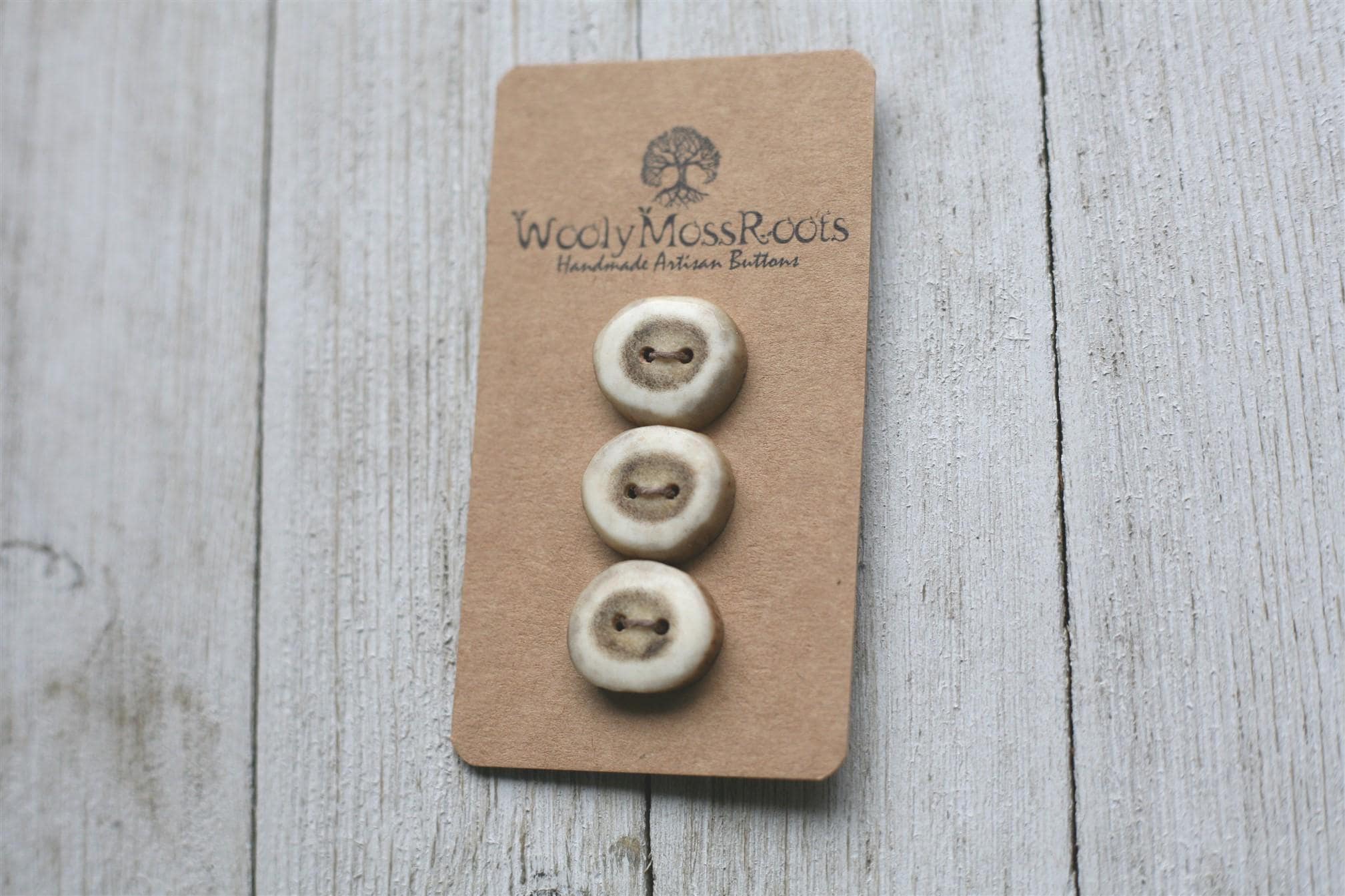 I absolutely love our antler buttons! These buttons were created by my husband Jeff in shed deer antler. Male deer shed their antlers once a year and grow back new ones. The antlers make incredible buttons, not only for how well they hold up, but also for how beautiful they are.