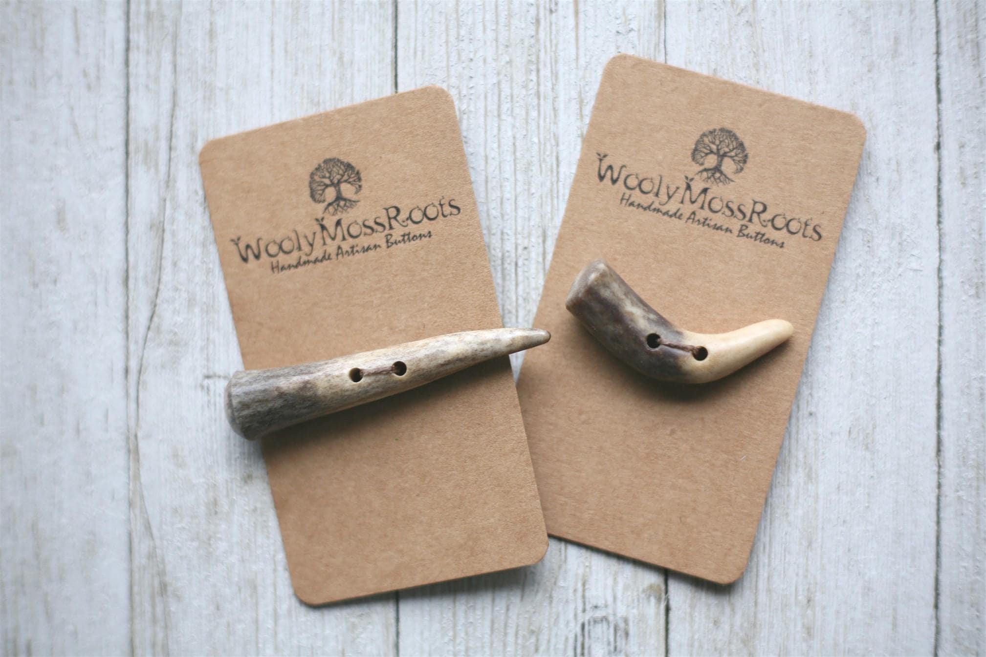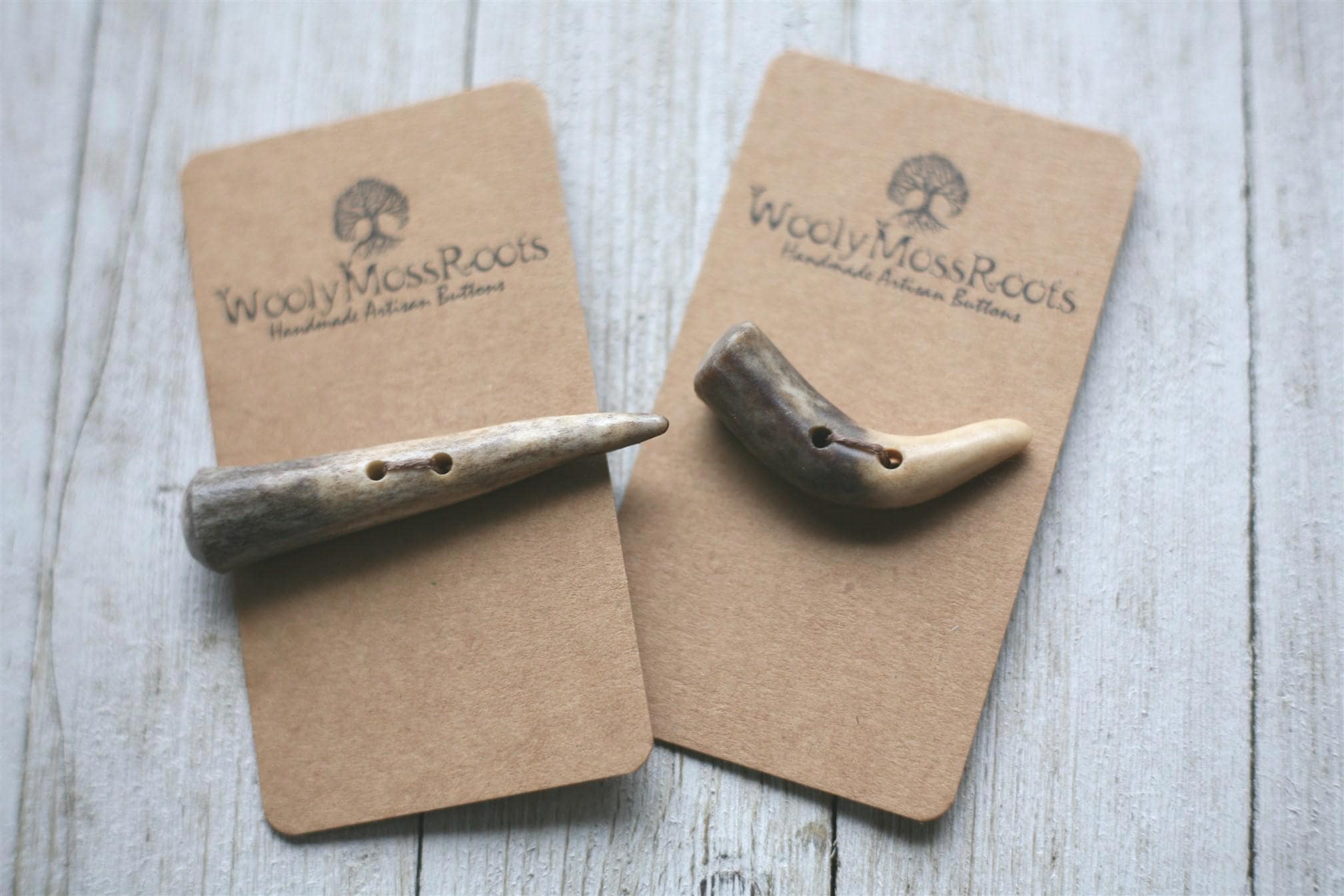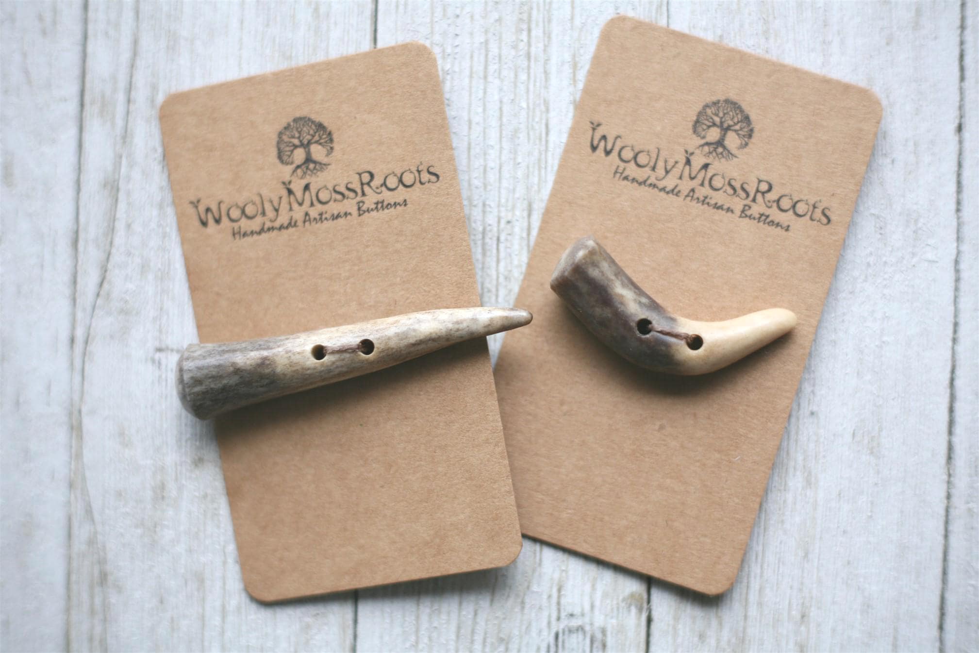 My husband Jeff and I (Taryn) create these toggles together in shed deer antler. Male deer shed their antlers once a year and grow back new ones. The antlers make incredible buttons, not only for how well they hold up, but also for how beautiful they are.