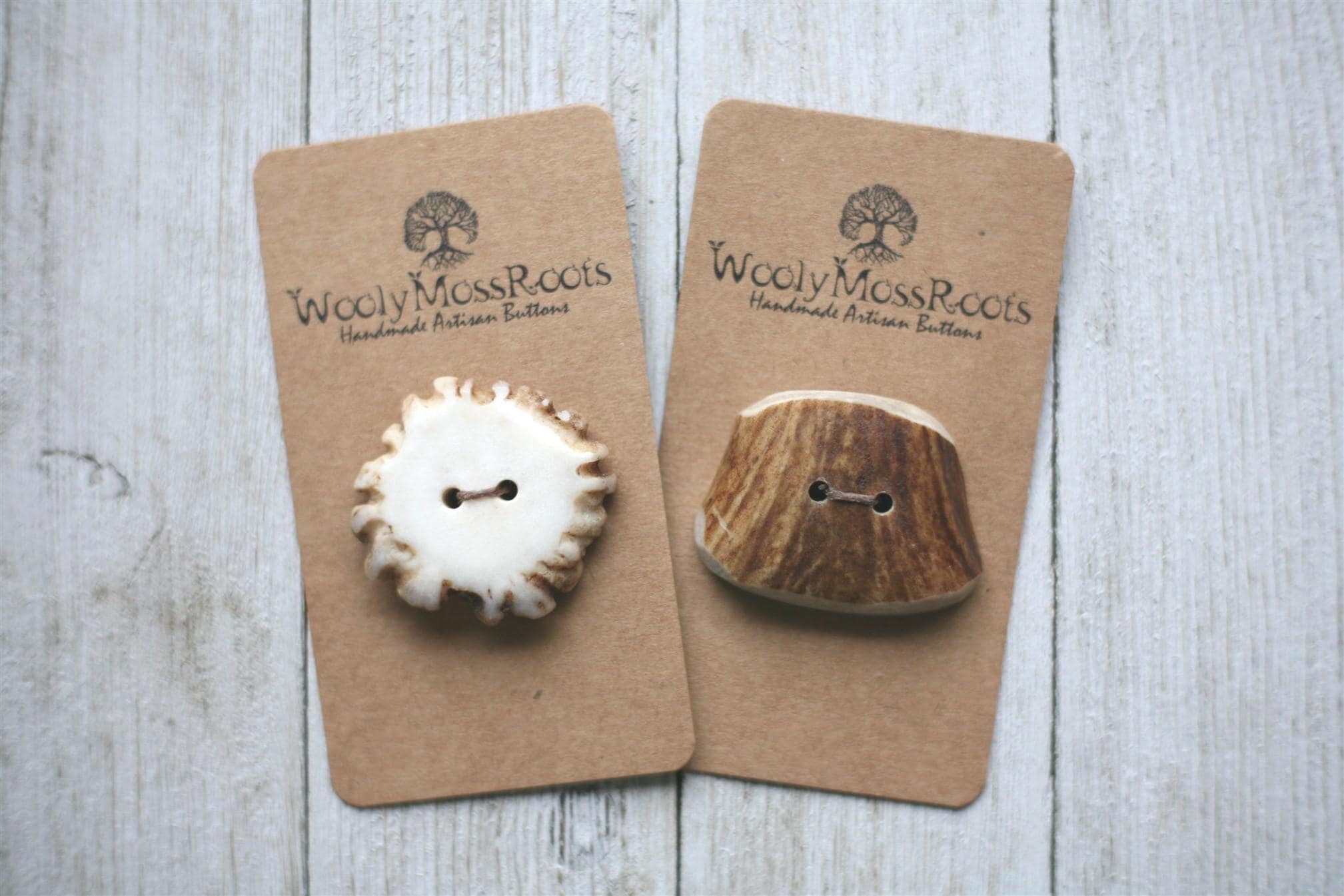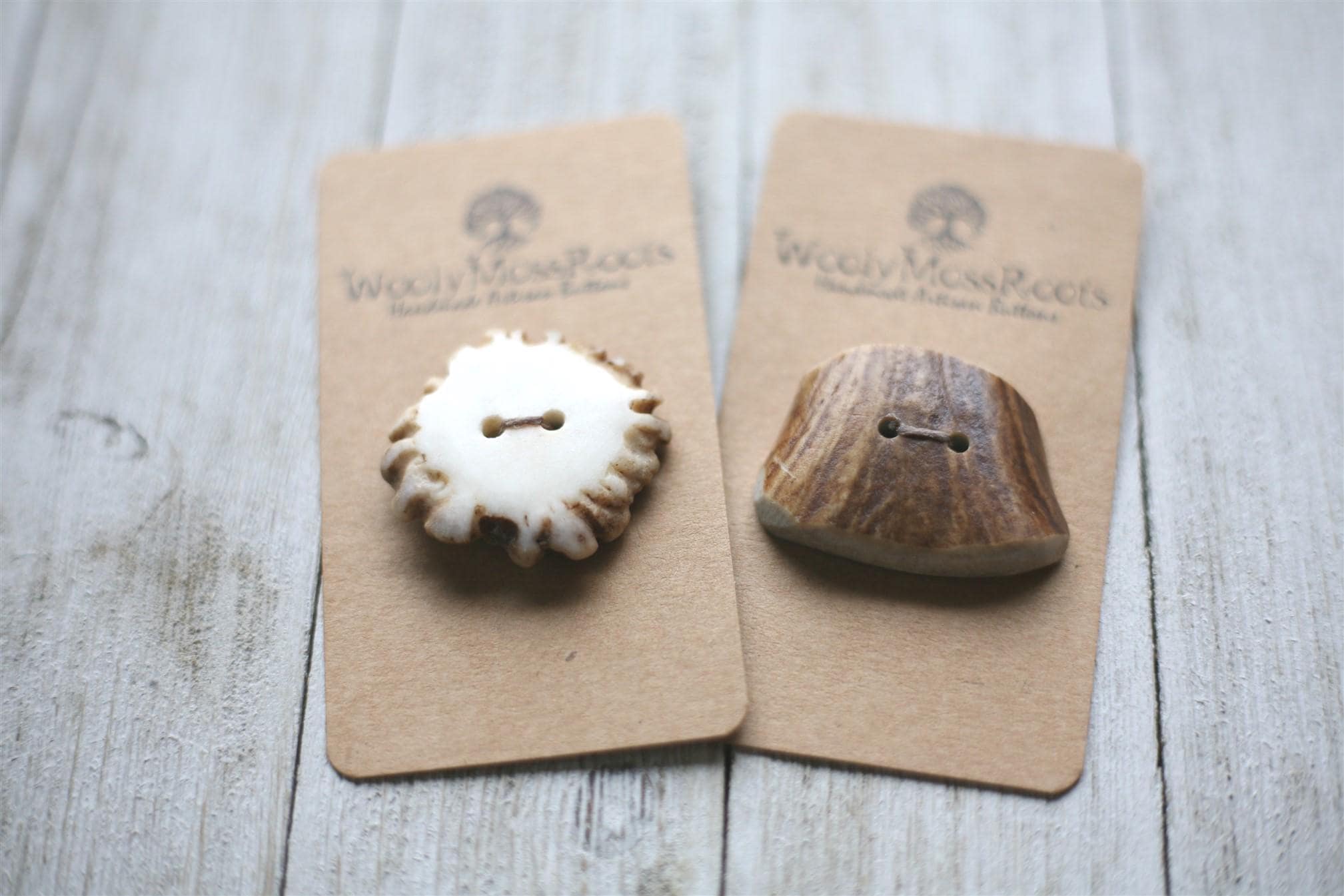 This set is unique because one of the buttons is an antler base and the other is an antler side slice. Both of these offerings are rare in our shop, making them even more special!