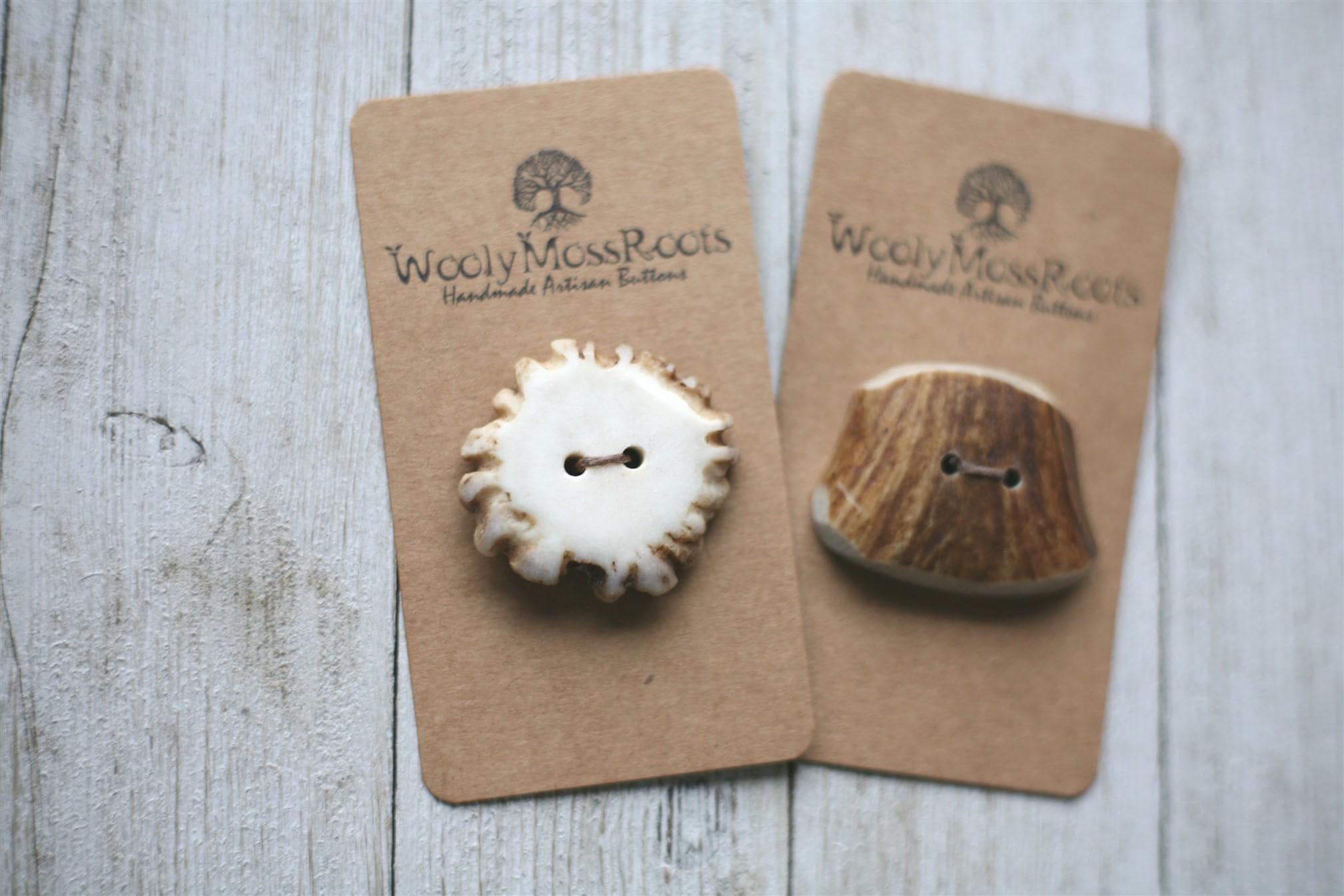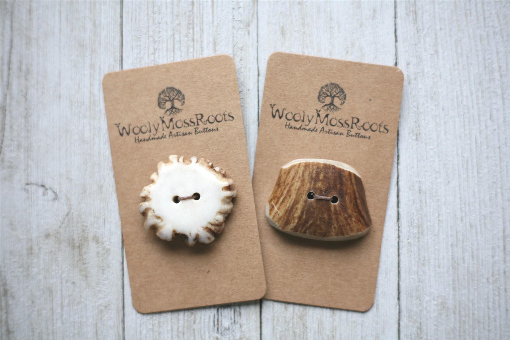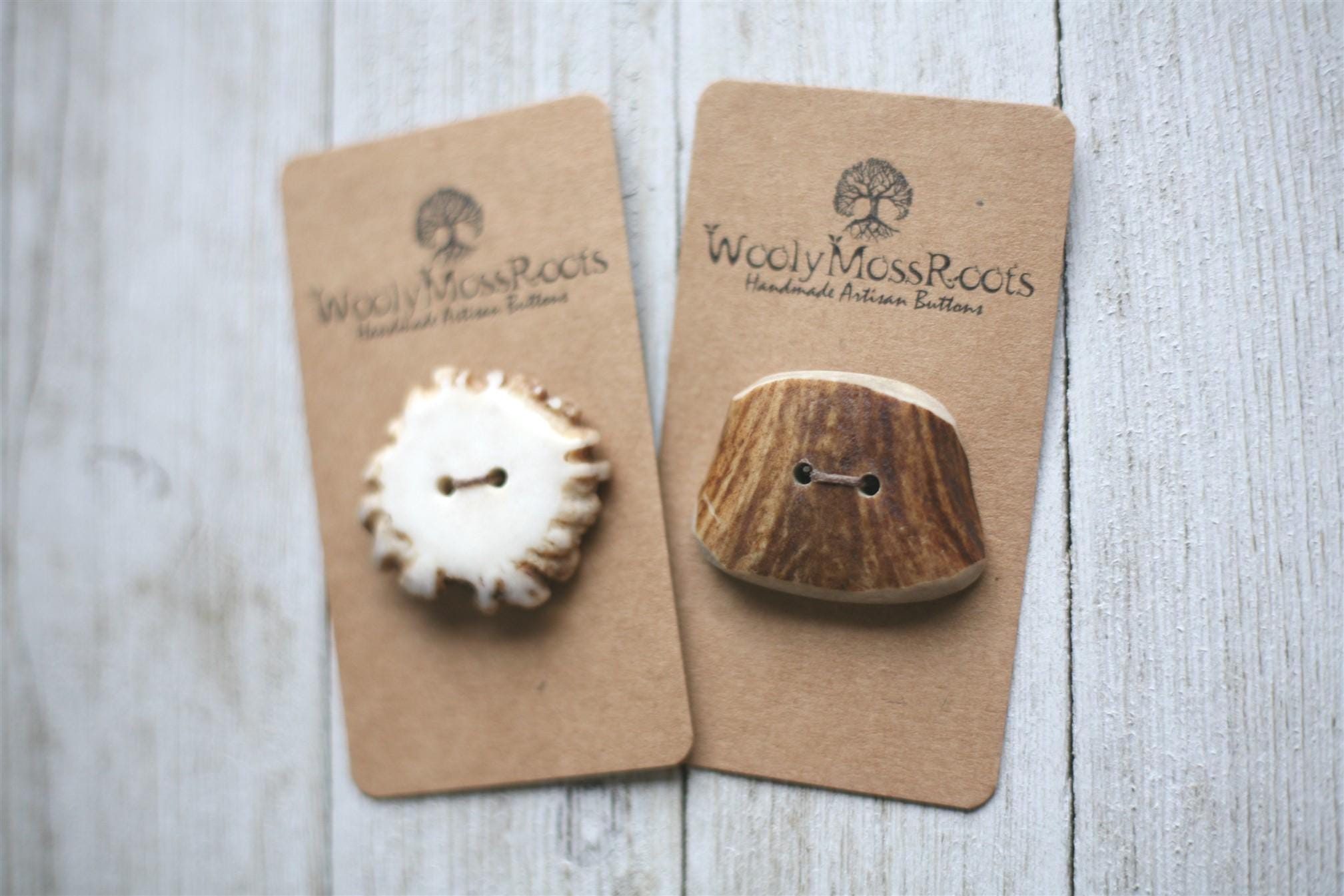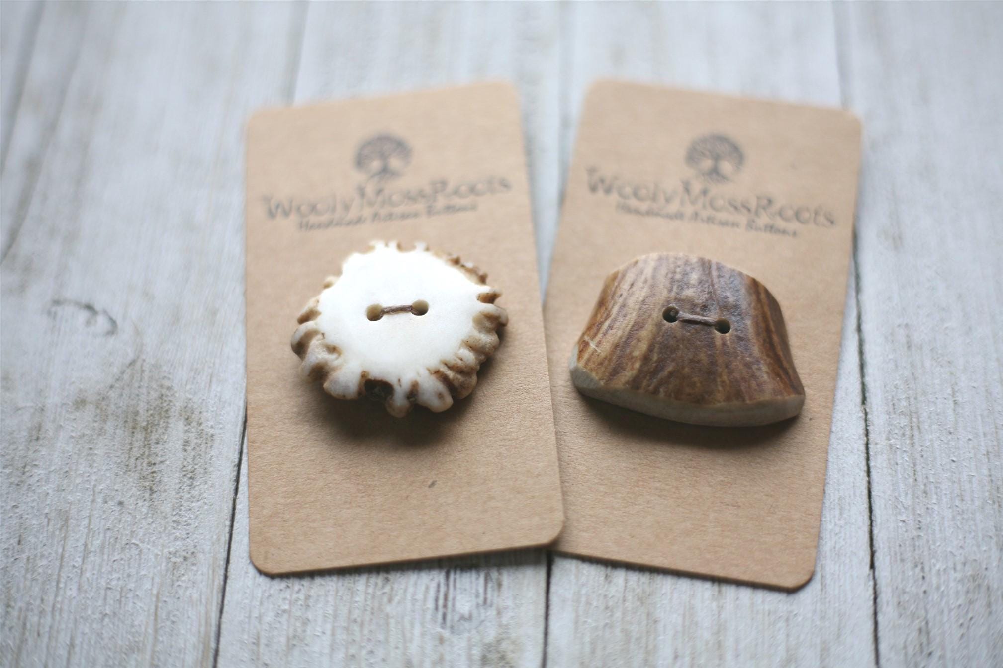 We absolutely love our antler buttons! These buttons were created by my husband Jeff in shed deer antler. Male deer shed their antlers once a year and grow back new ones. The antlers make incredible buttons, not only for how well they hold up, but also for how beautiful they are.
