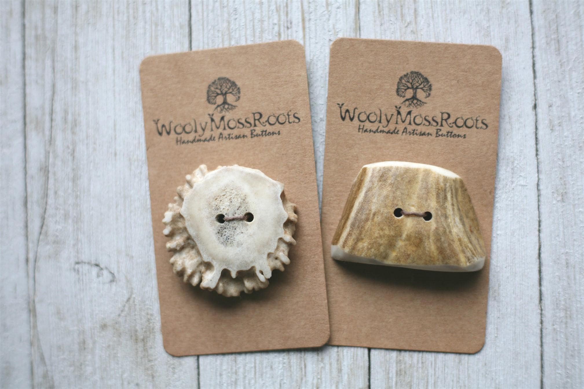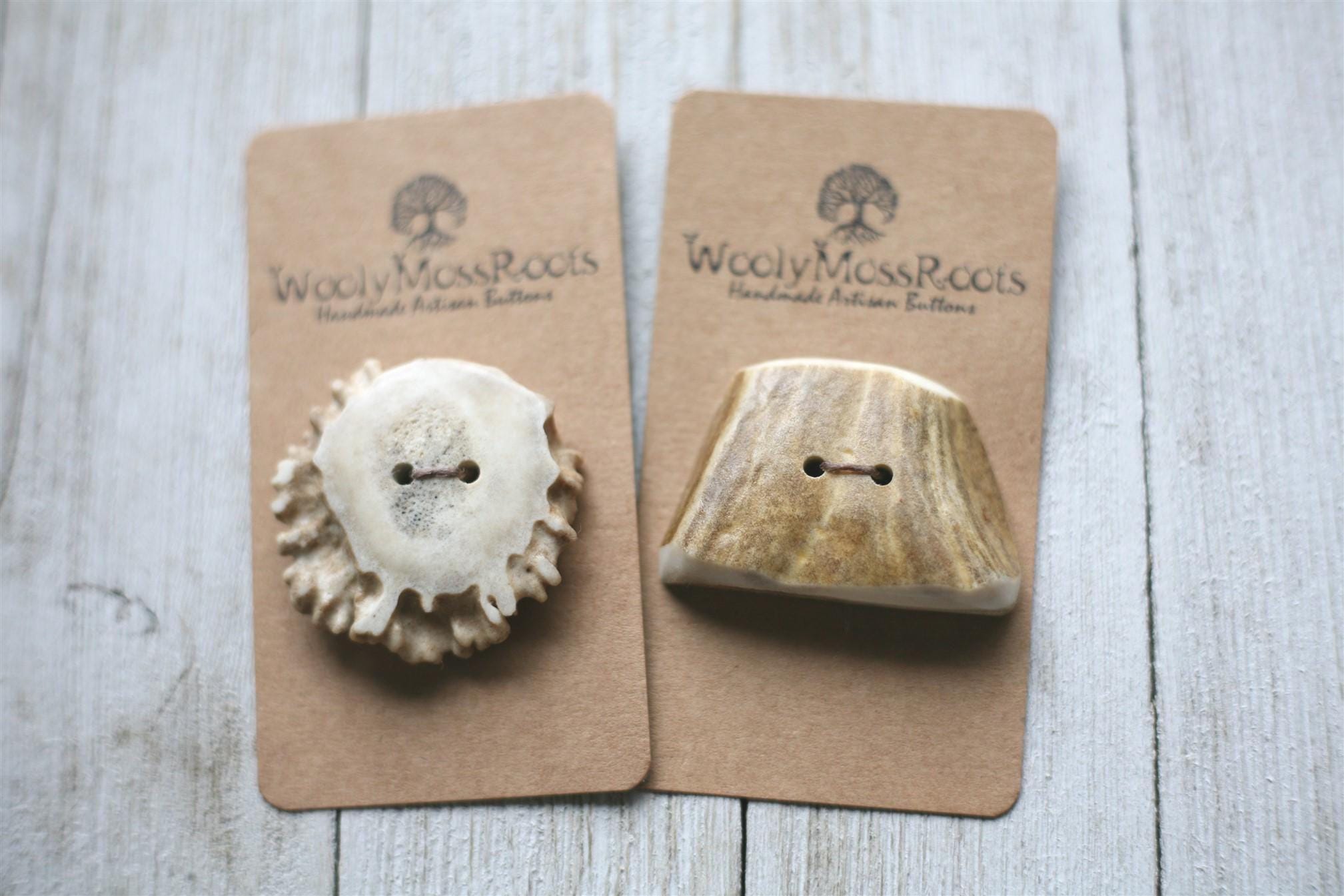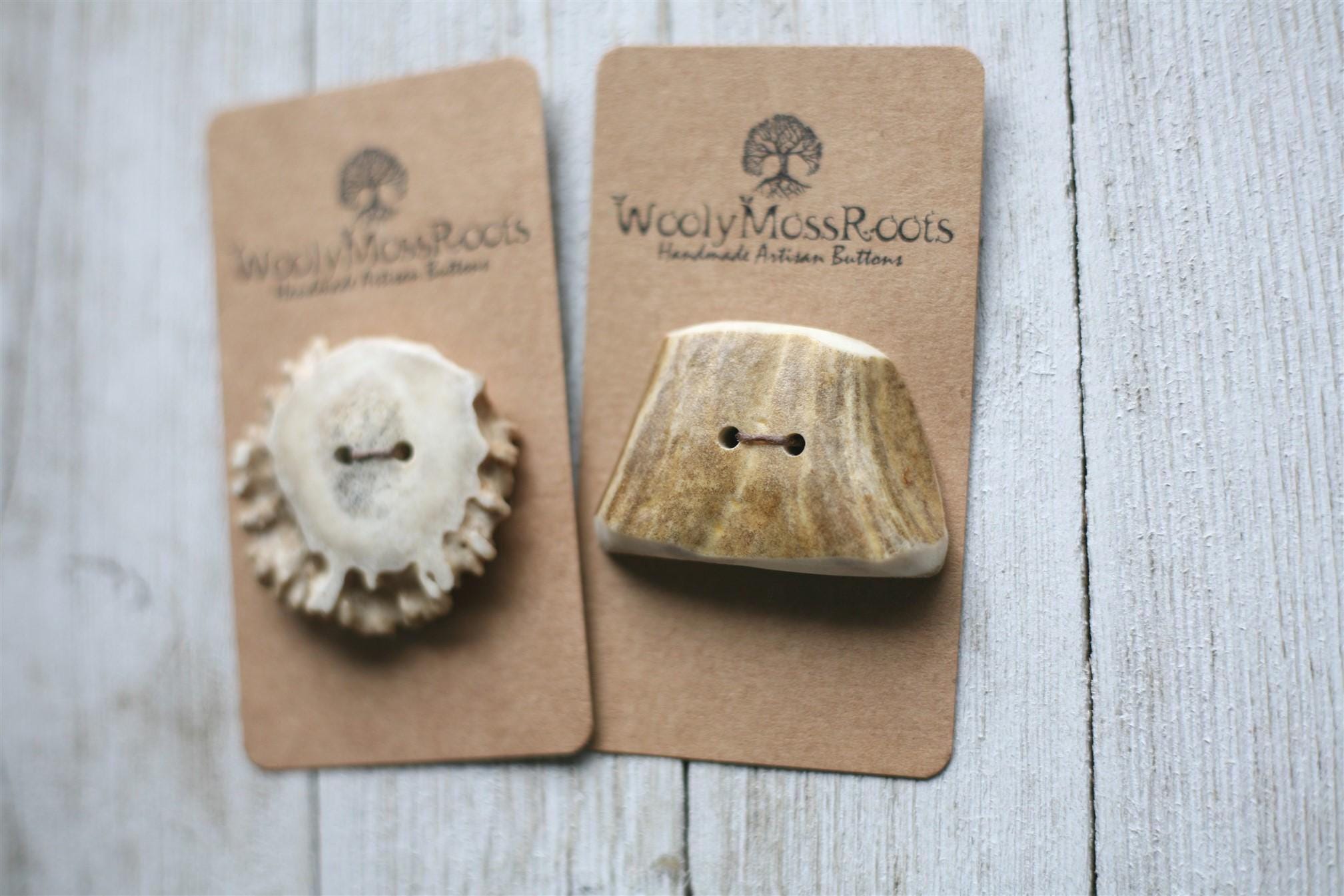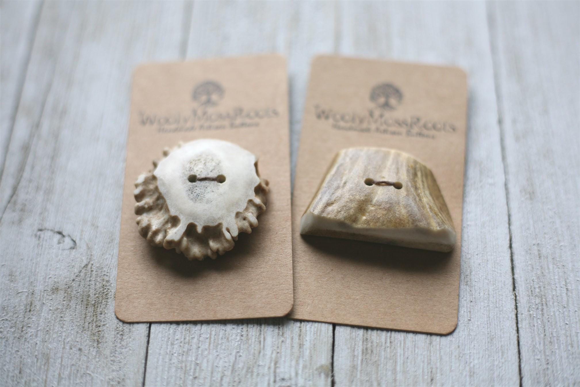 This set is unique because one of the buttons is an antler base and the other is an antler side slice. Both of these offerings are rare in our shop, making them even more special!