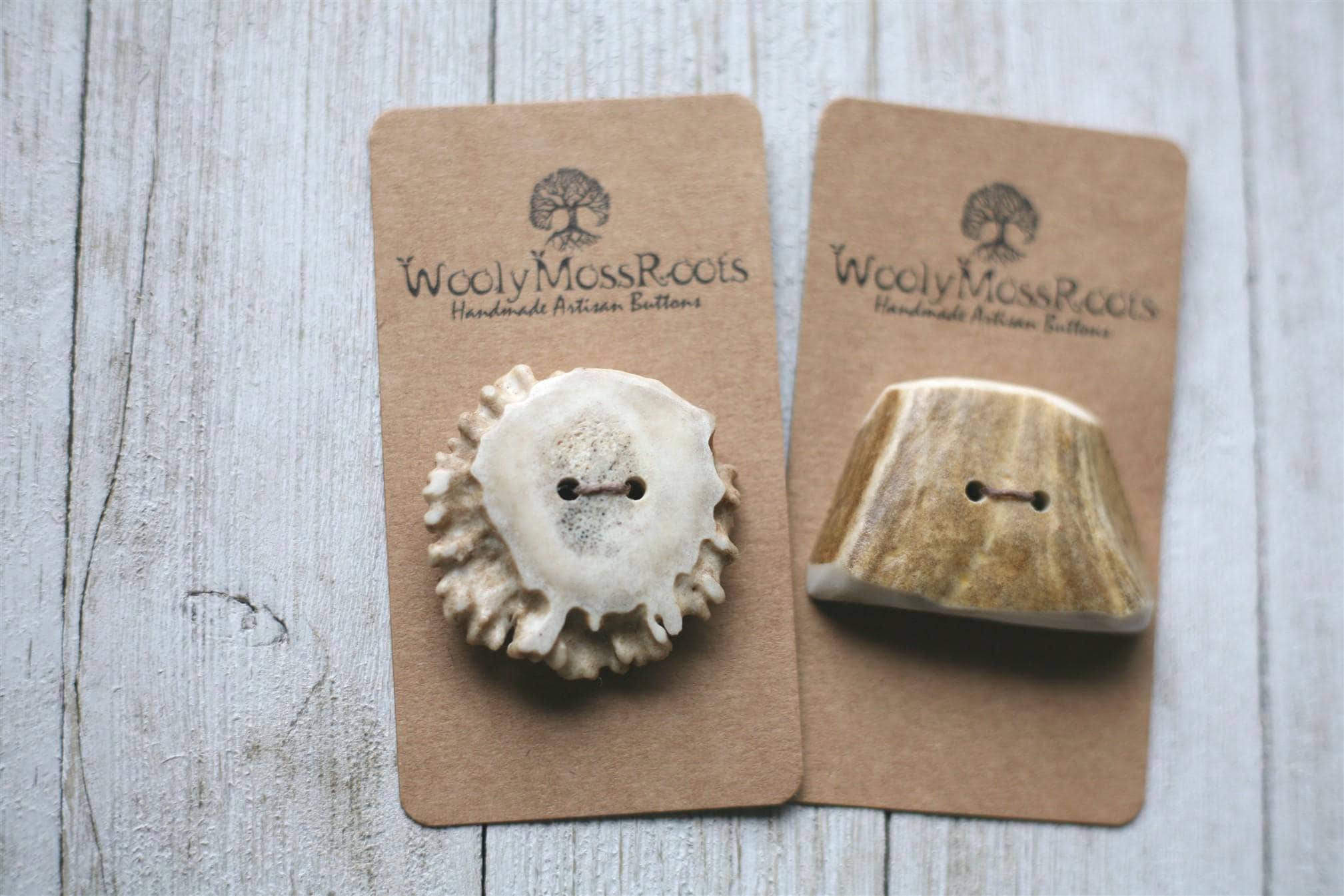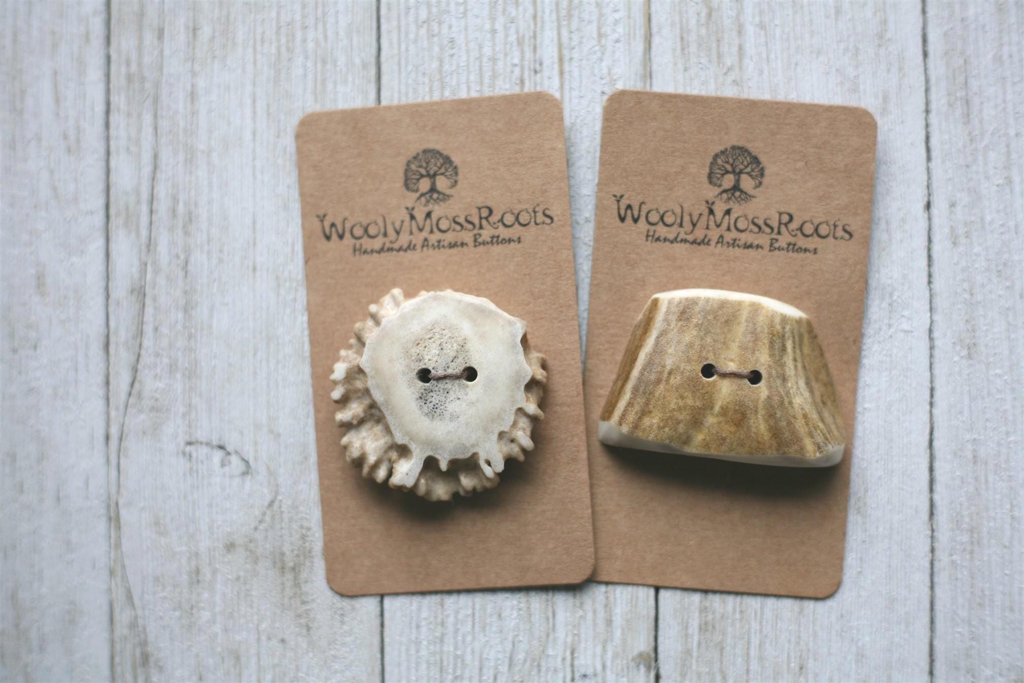 We absolutely love our antler buttons! These buttons were created by my husband Jeff in shed deer antler. Male deer shed their antlers once a year and grow back new ones. The antlers make incredible buttons, not only for how well they hold up, but also for how beautiful they are.