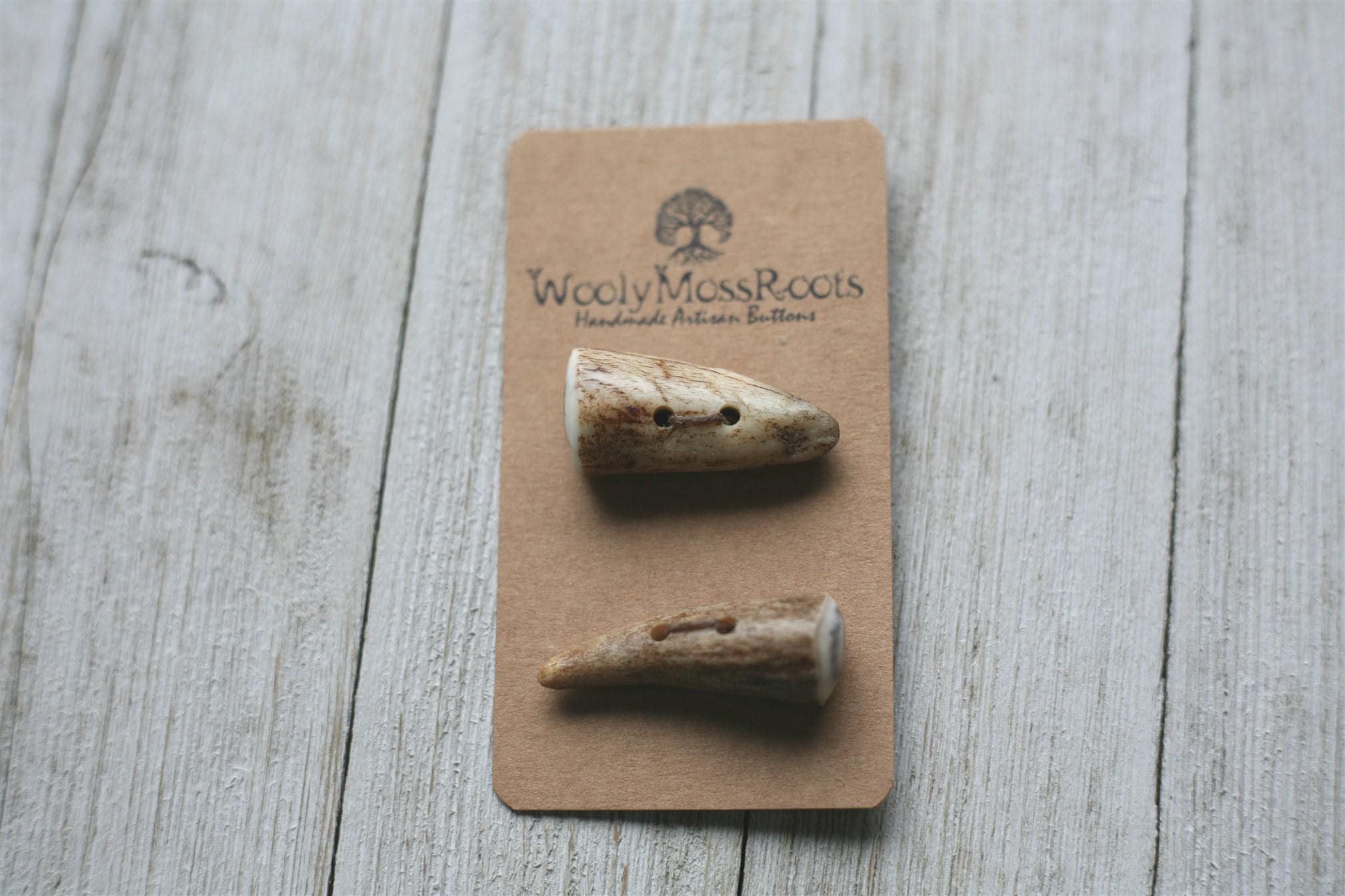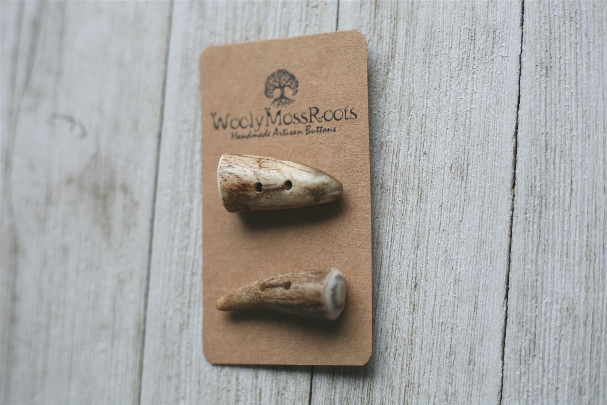 We absolutely love the antler toggle buttons we offer! My husband Jeff and I (Taryn) create these toggles together in shed deer antler. Male deer shed their antlers once a year and grow back new ones. The antlers make incredible buttons, not only for how well they hold up, but also for how beautiful they are.