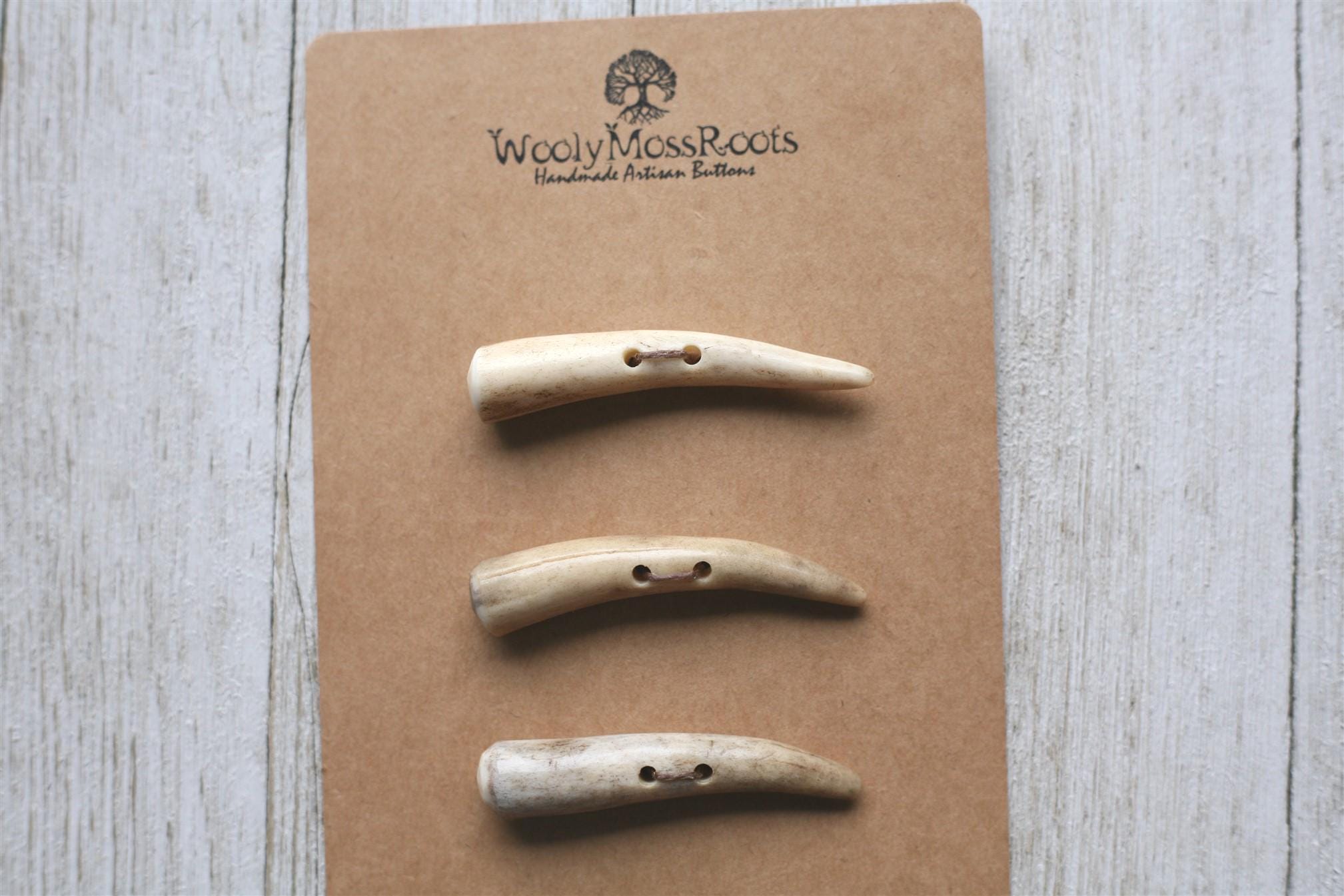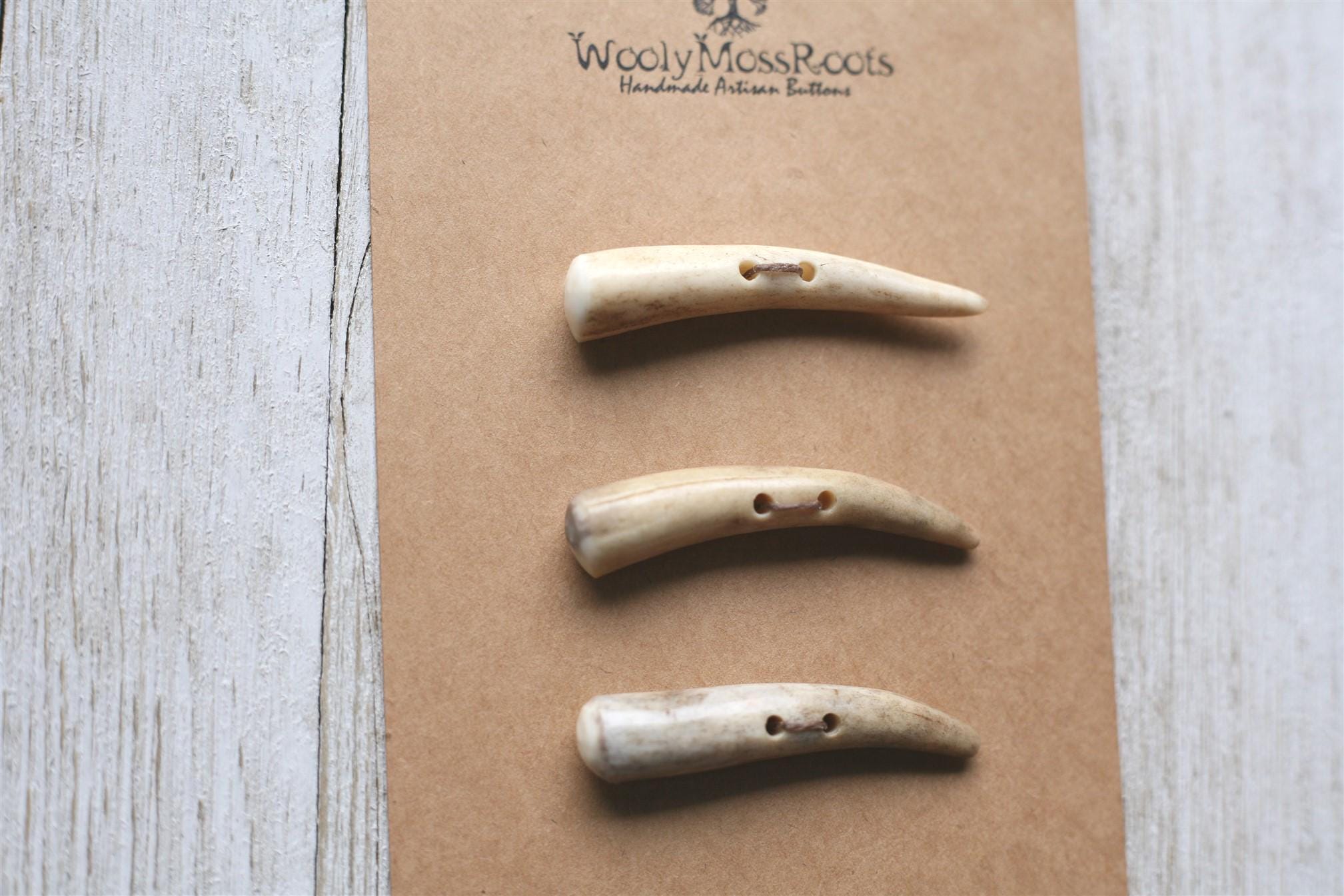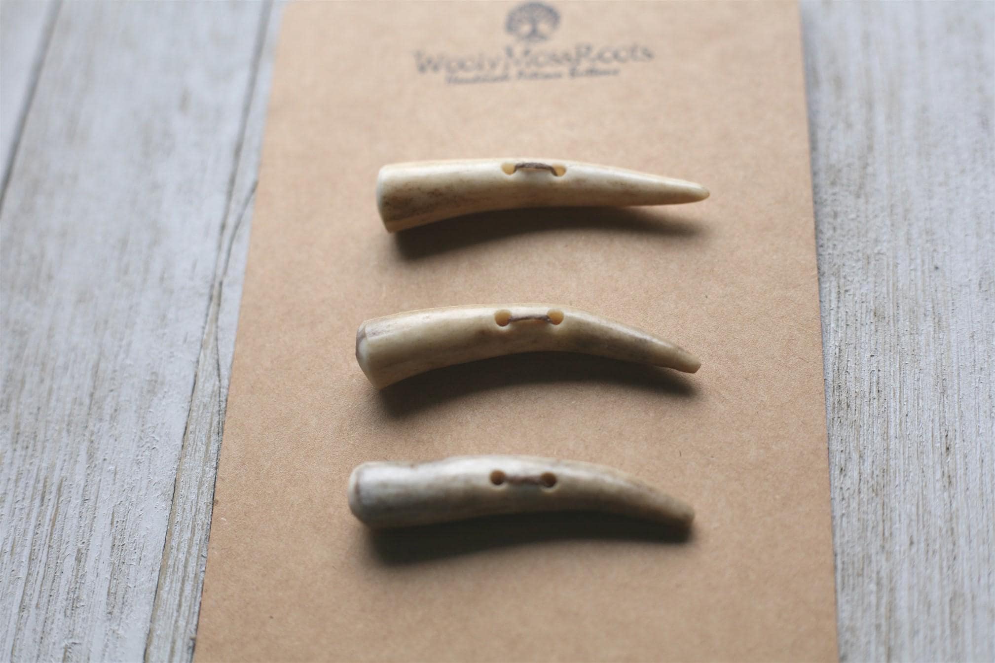 We absolutely love the antler toggle buttons we offer! My husband Jeff and I (Taryn) create these toggles together in shed deer antler. Male deer shed their antlers once a year and grow back new ones. The antlers make incredible buttons, not only for how well they hold up, but also for how beautiful they are.
