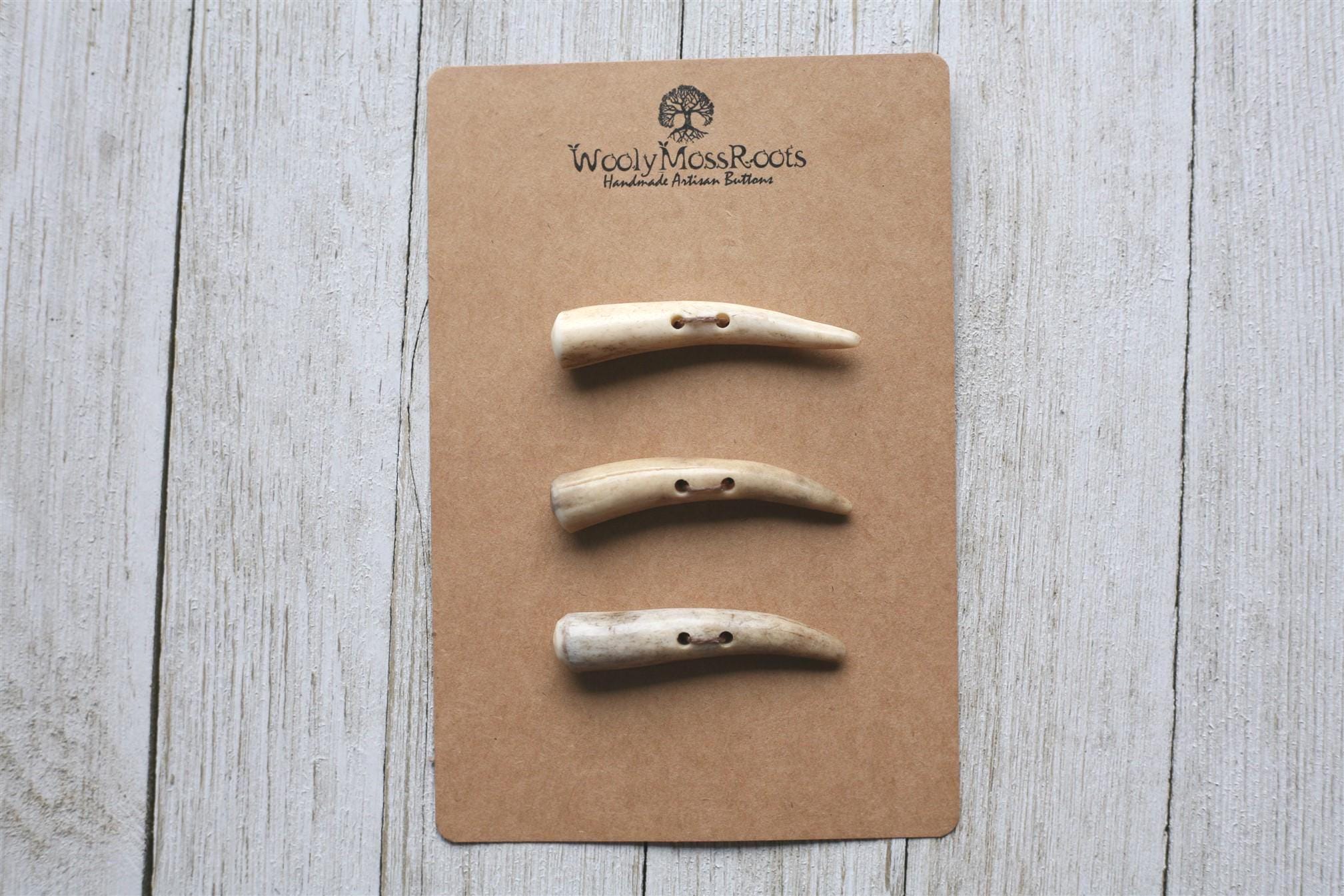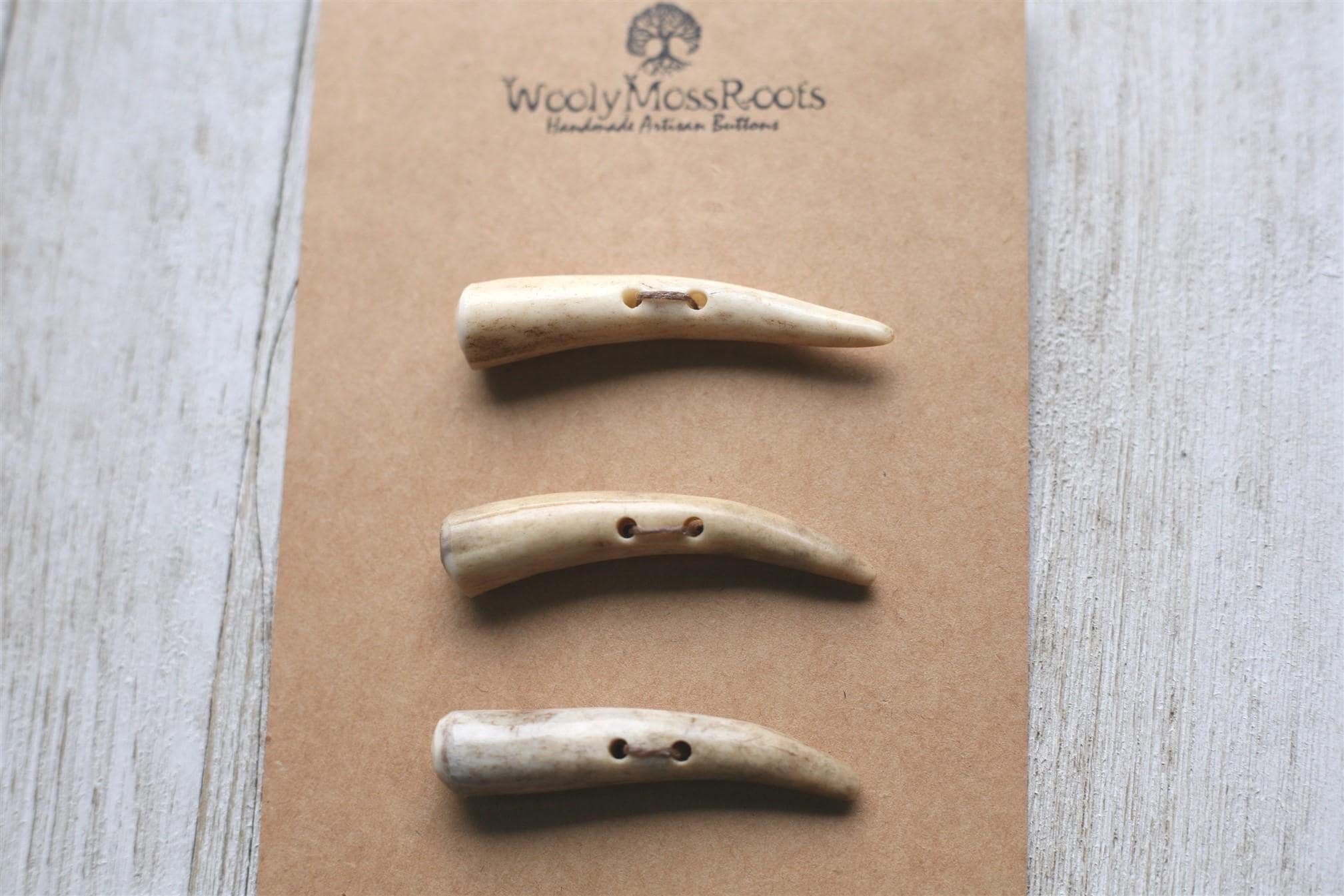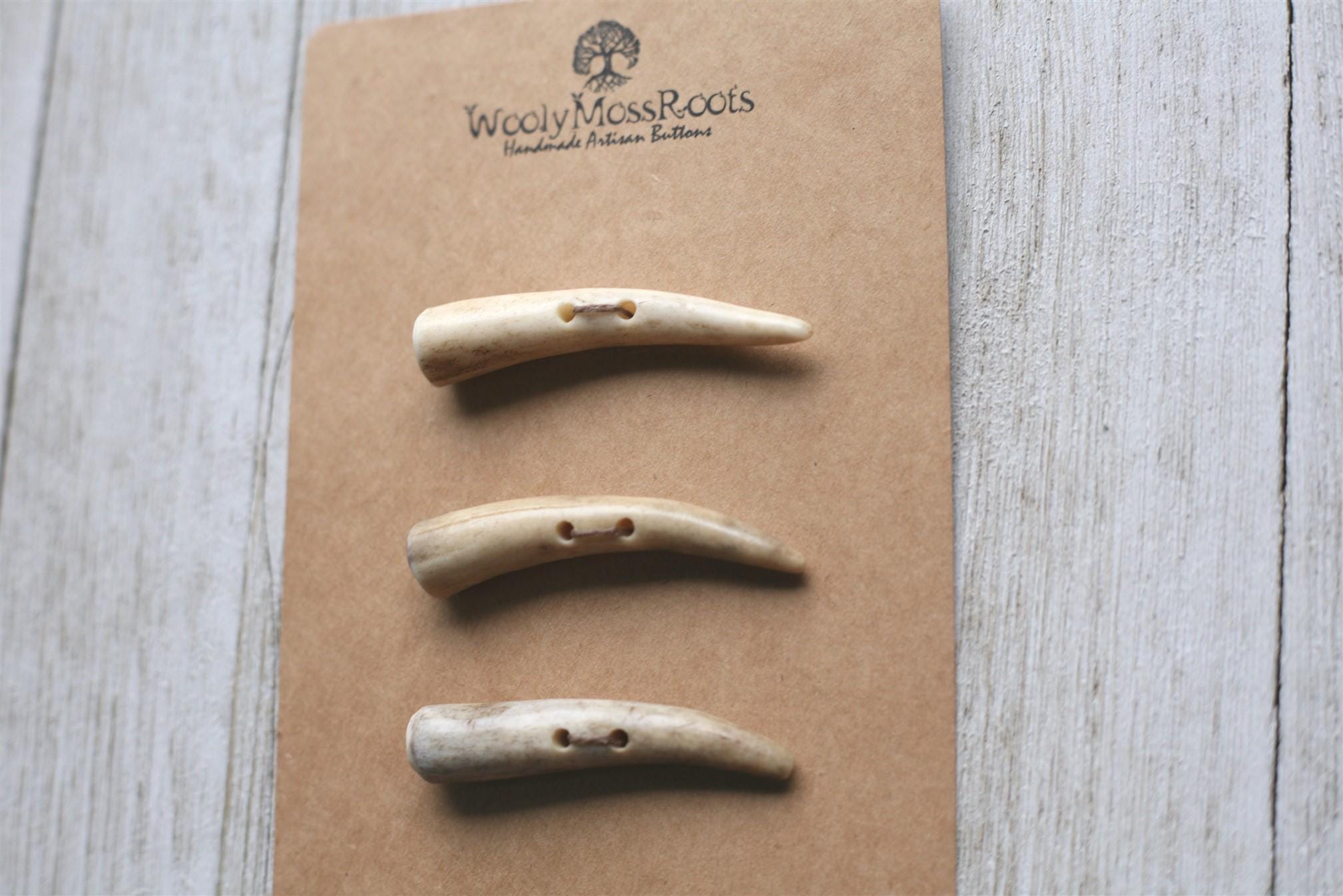 We absolutely love the antler toggle buttons we offer! My husband Jeff and I (Taryn) create these toggles together in shed deer antler. Male deer shed their antlers once a year and grow back new ones. The antlers make incredible buttons, not only for how well they hold up, but also for how beautiful they are.