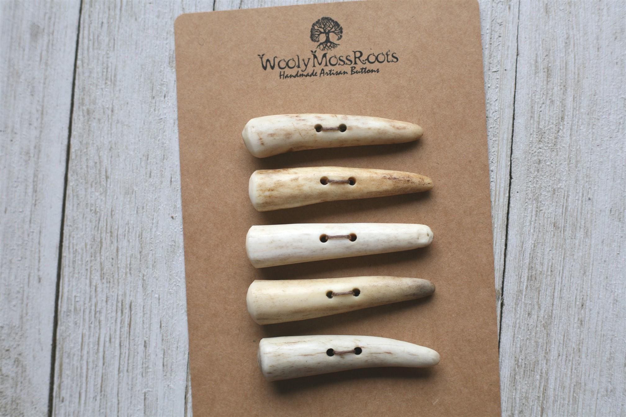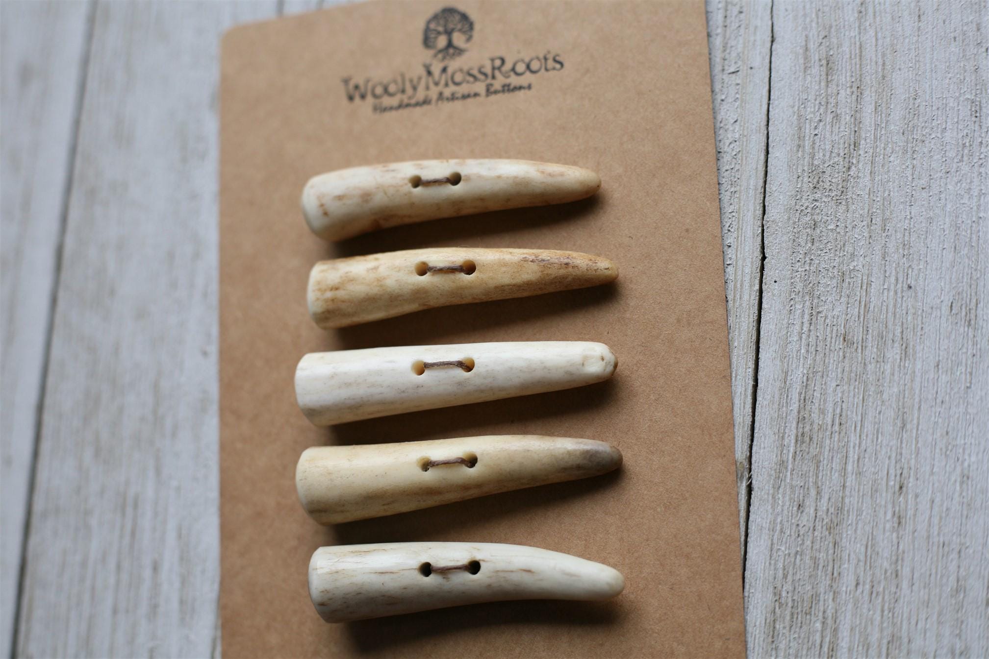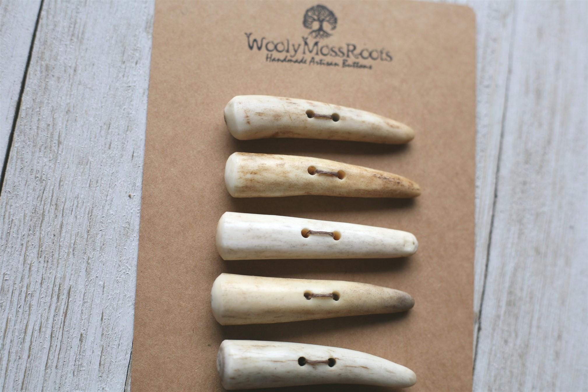 We absolutely love the antler toggle buttons we offer! My husband Jeff and I (Taryn) create these toggles together in shed deer antler. Male deer shed their antlers once a year and grow back new ones. The antlers make incredible buttons, not only for how well they hold up, but also for how beautiful they are.