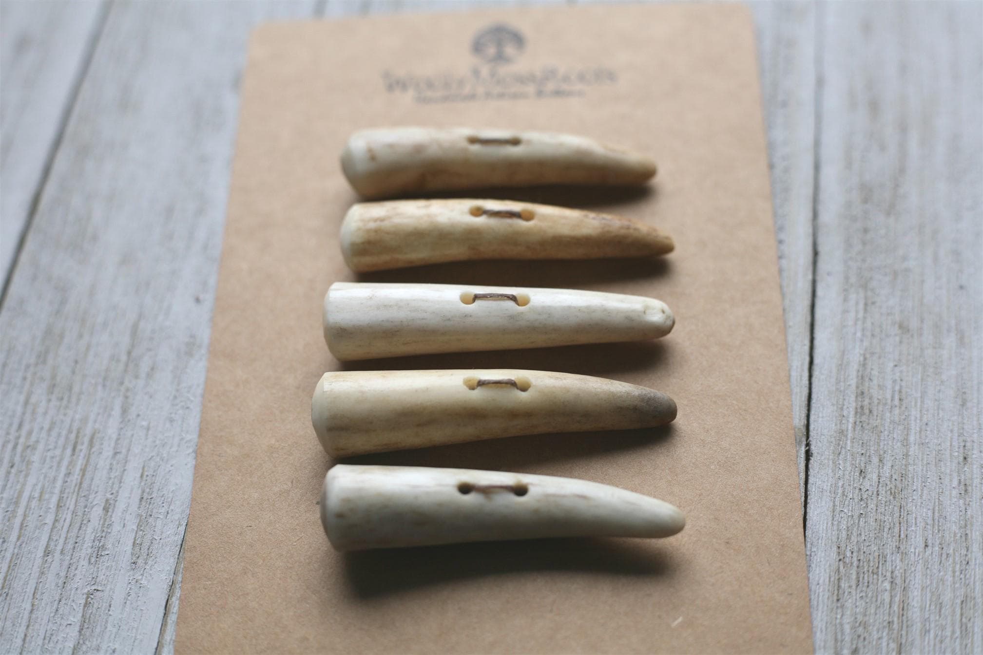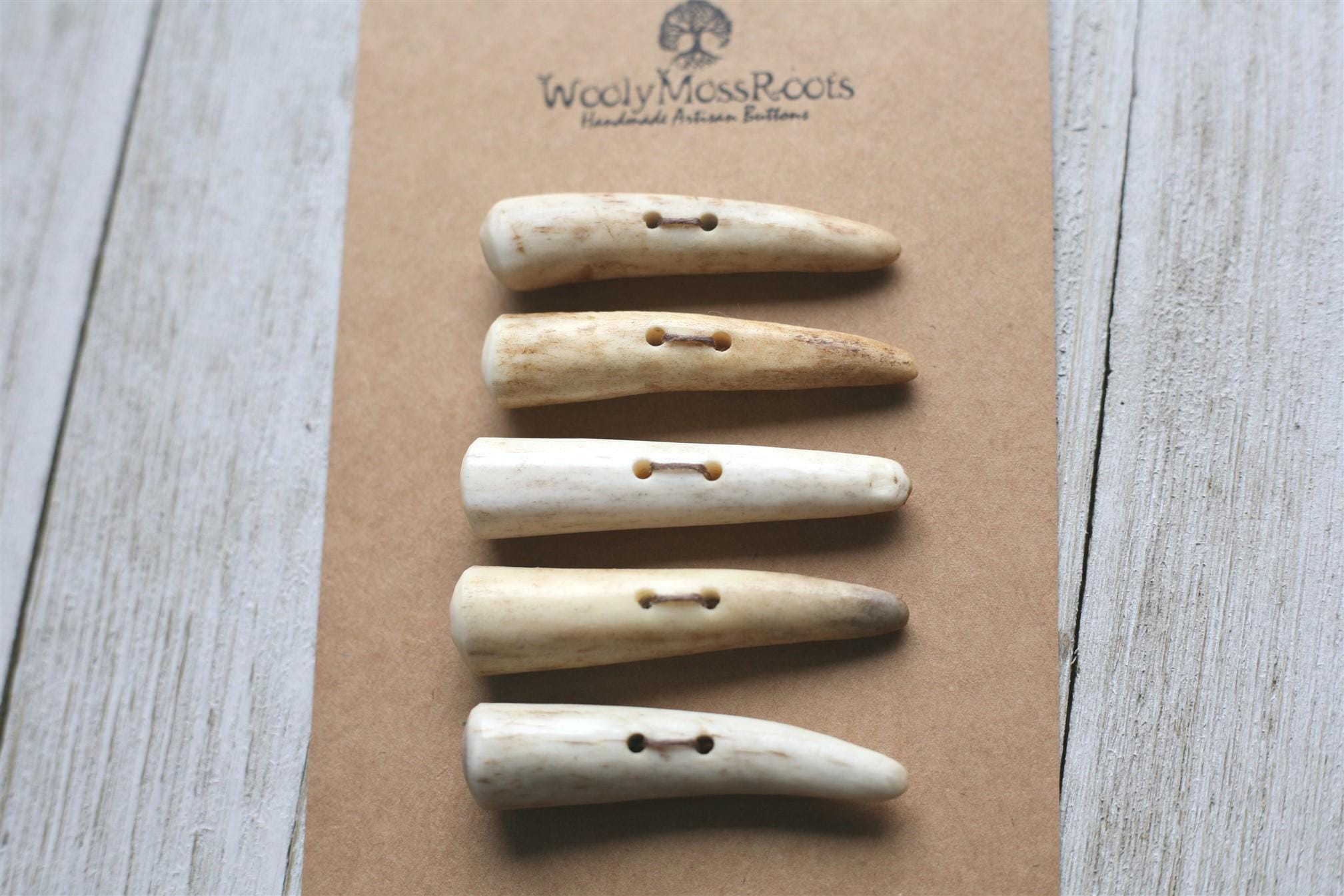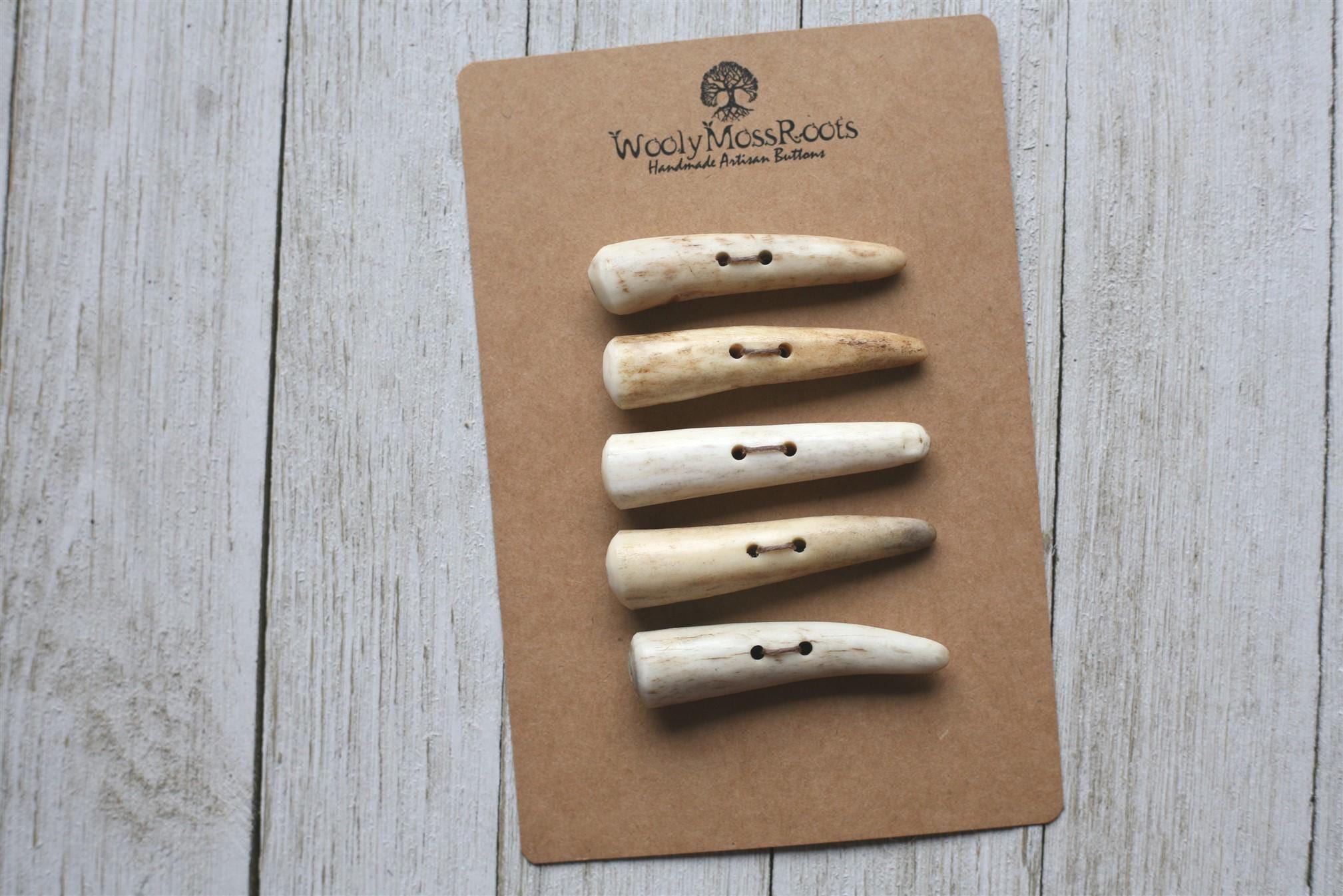 We absolutely love the antler toggle buttons we offer! My husband Jeff and I (Taryn) create these toggles together in shed deer antler. Male deer shed their antlers once a year and grow back new ones. The antlers make incredible buttons, not only for how well they hold up, but also for how beautiful they are.