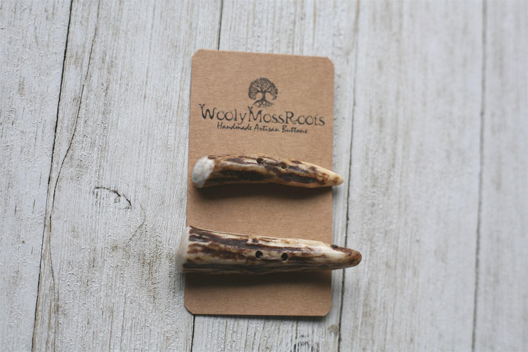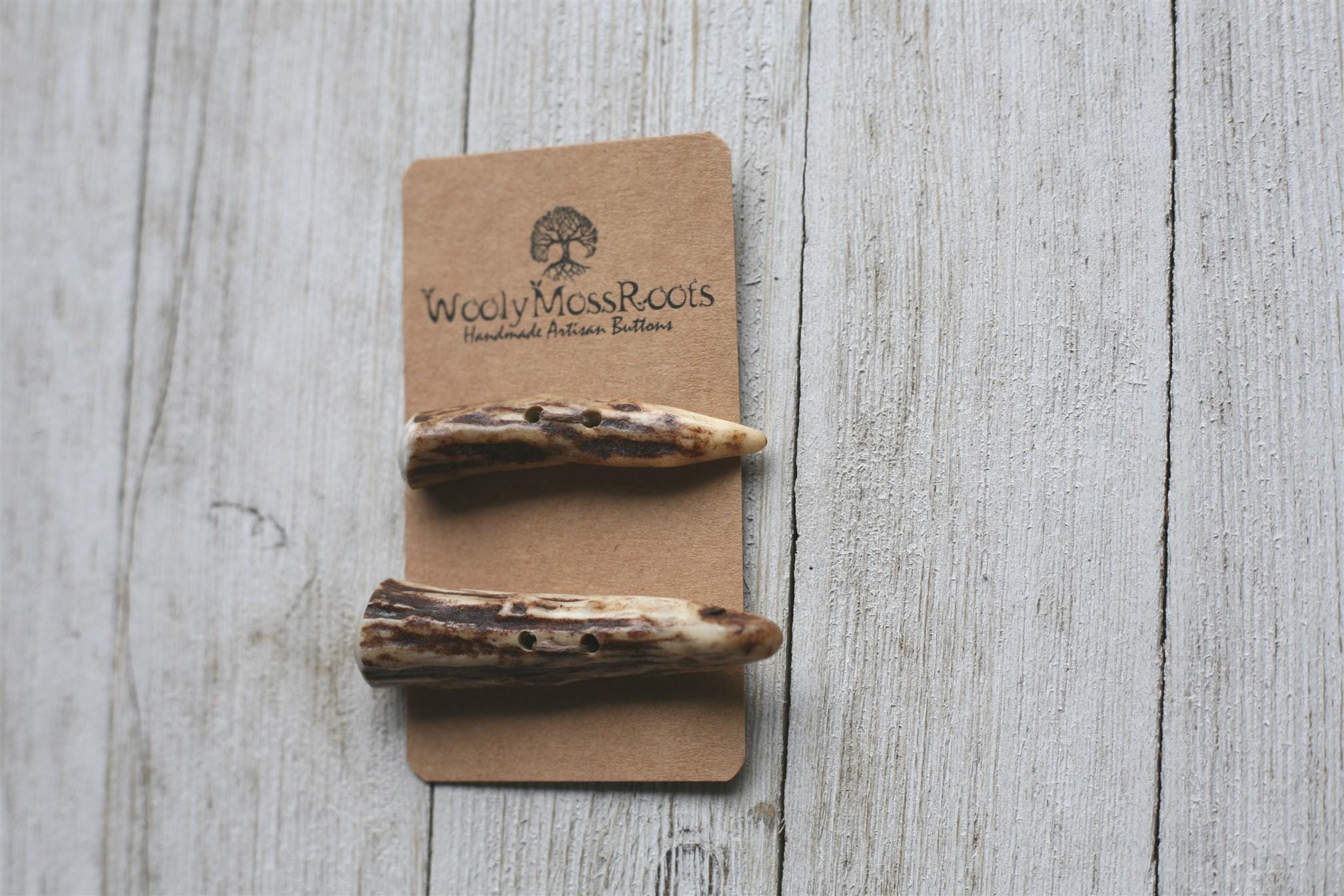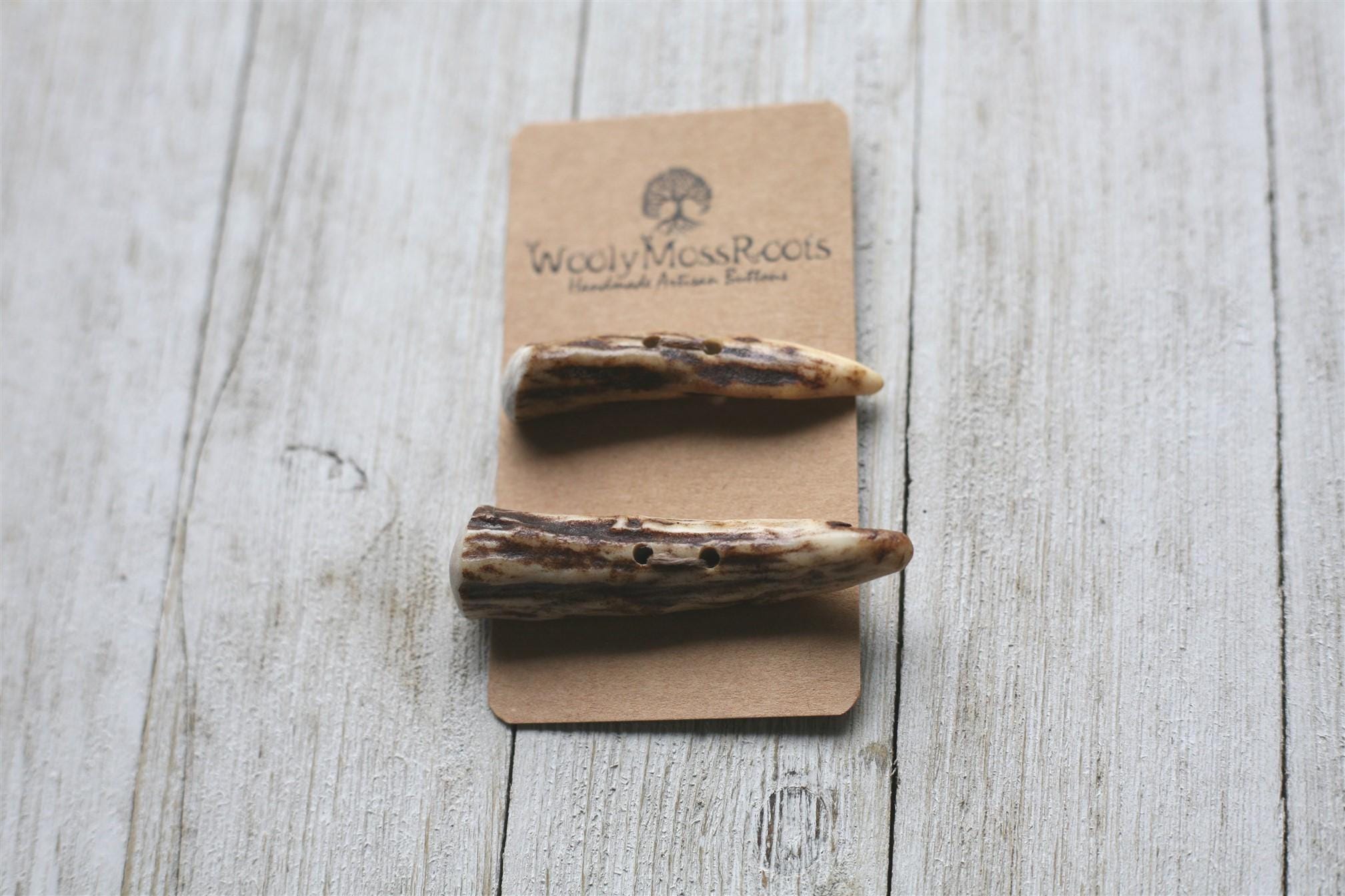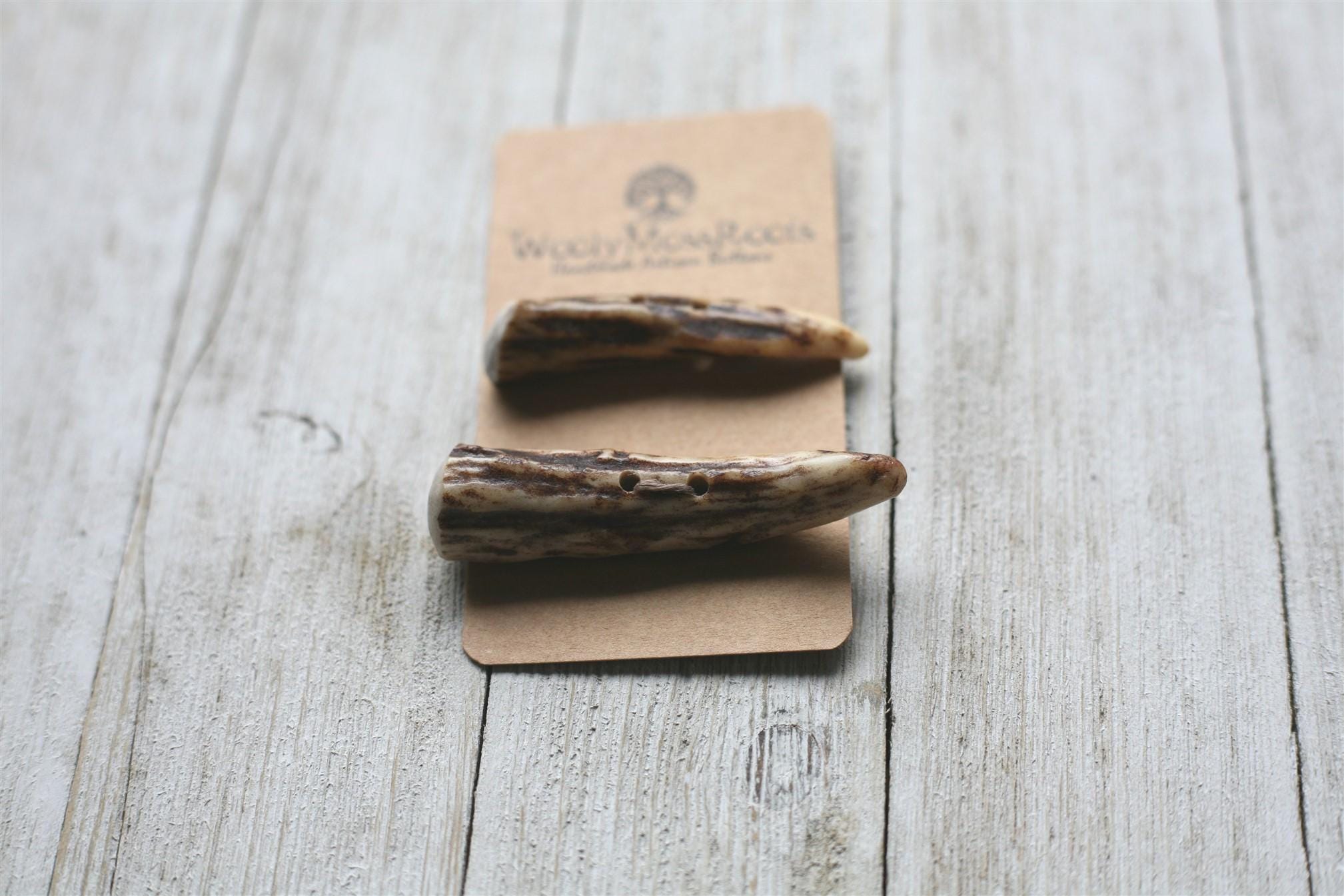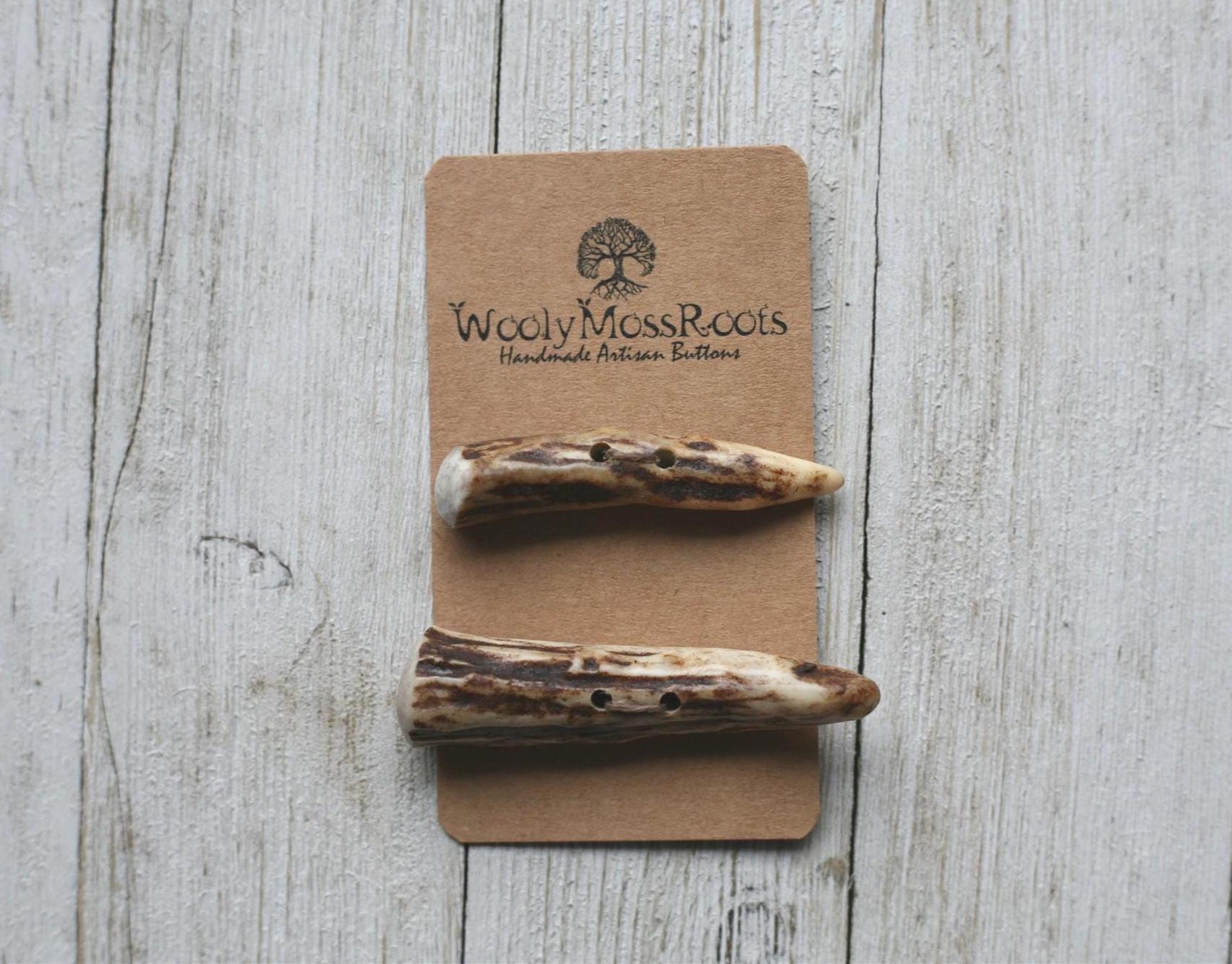 We absolutely love the antler toggle buttons we offer! My husband Jeff and I (Taryn) create these toggles together in shed deer antler. Male deer shed their antlers once a year and grow back new ones. The antlers make incredible buttons, not only for how well they hold up, but also for how beautiful they are.
