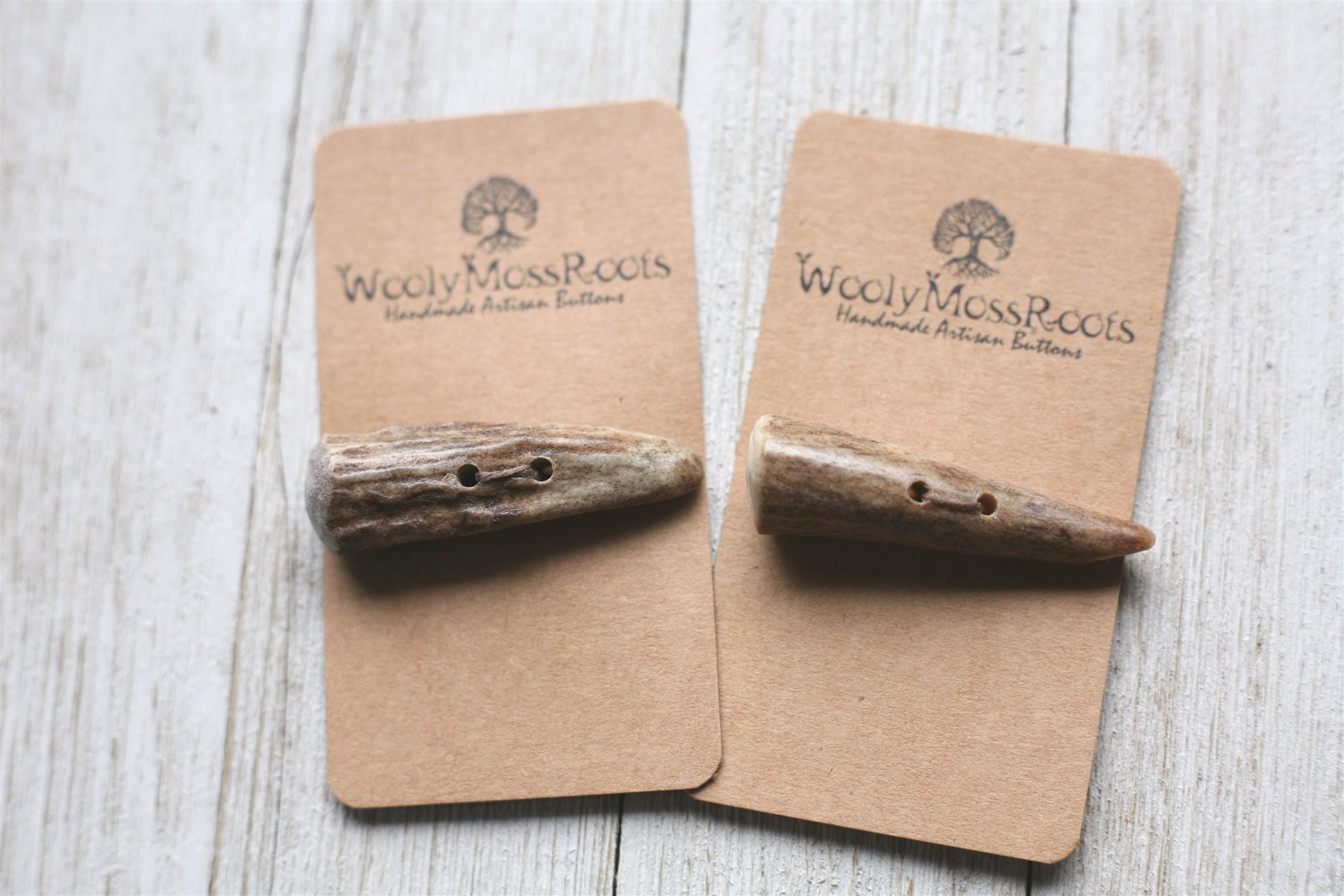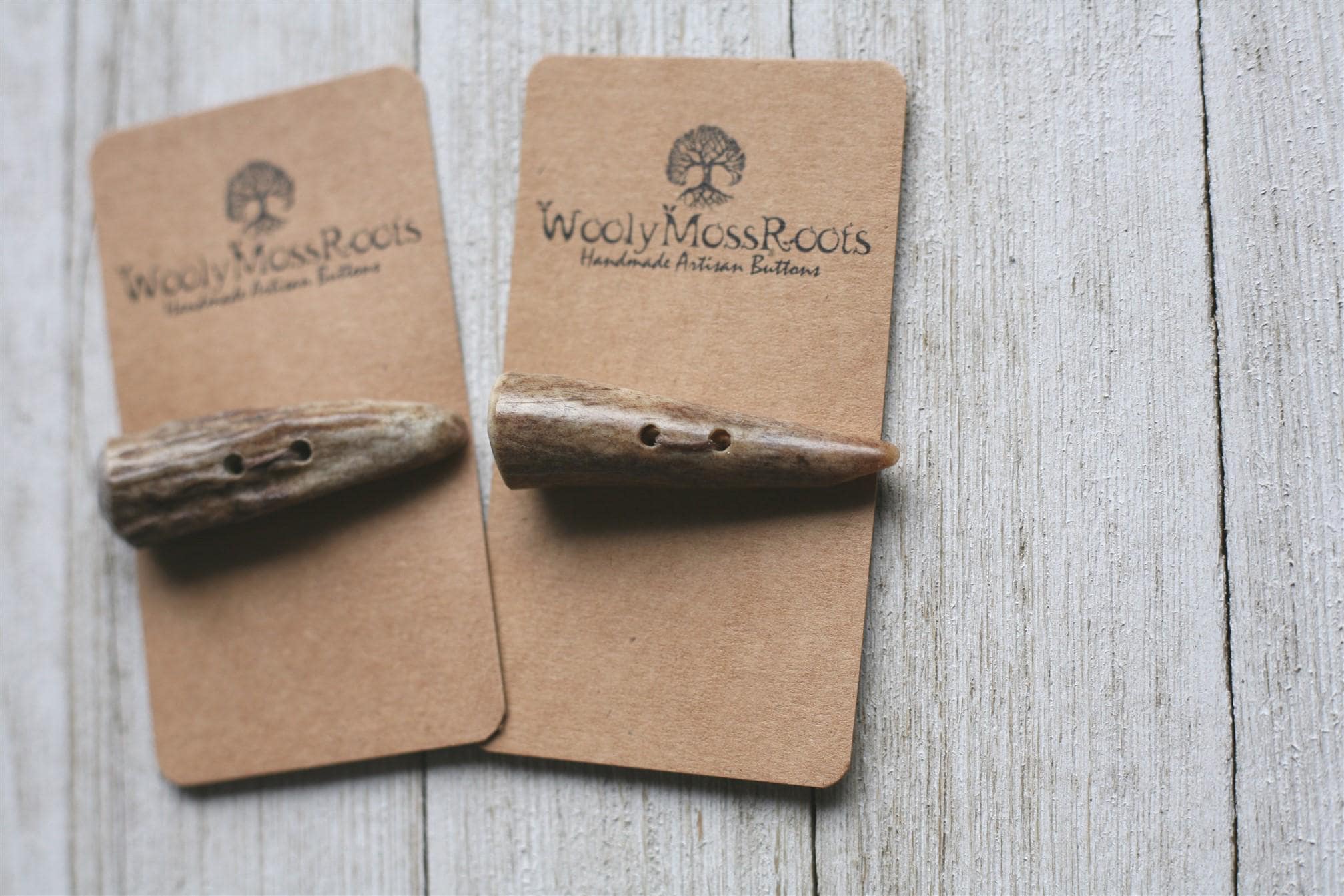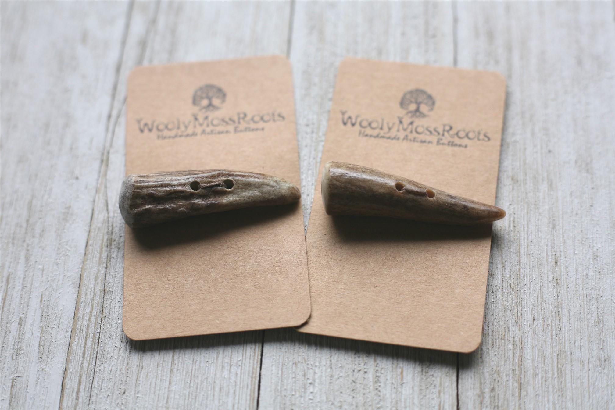 We absolutely love the antler toggle buttons we offer! My husband Jeff and I (Taryn) create these toggles together in shed deer antler. Male deer shed their antlers once a year and grow back new ones. The antlers make incredible buttons, not only for how well they hold up, but also for how beautiful they are.
