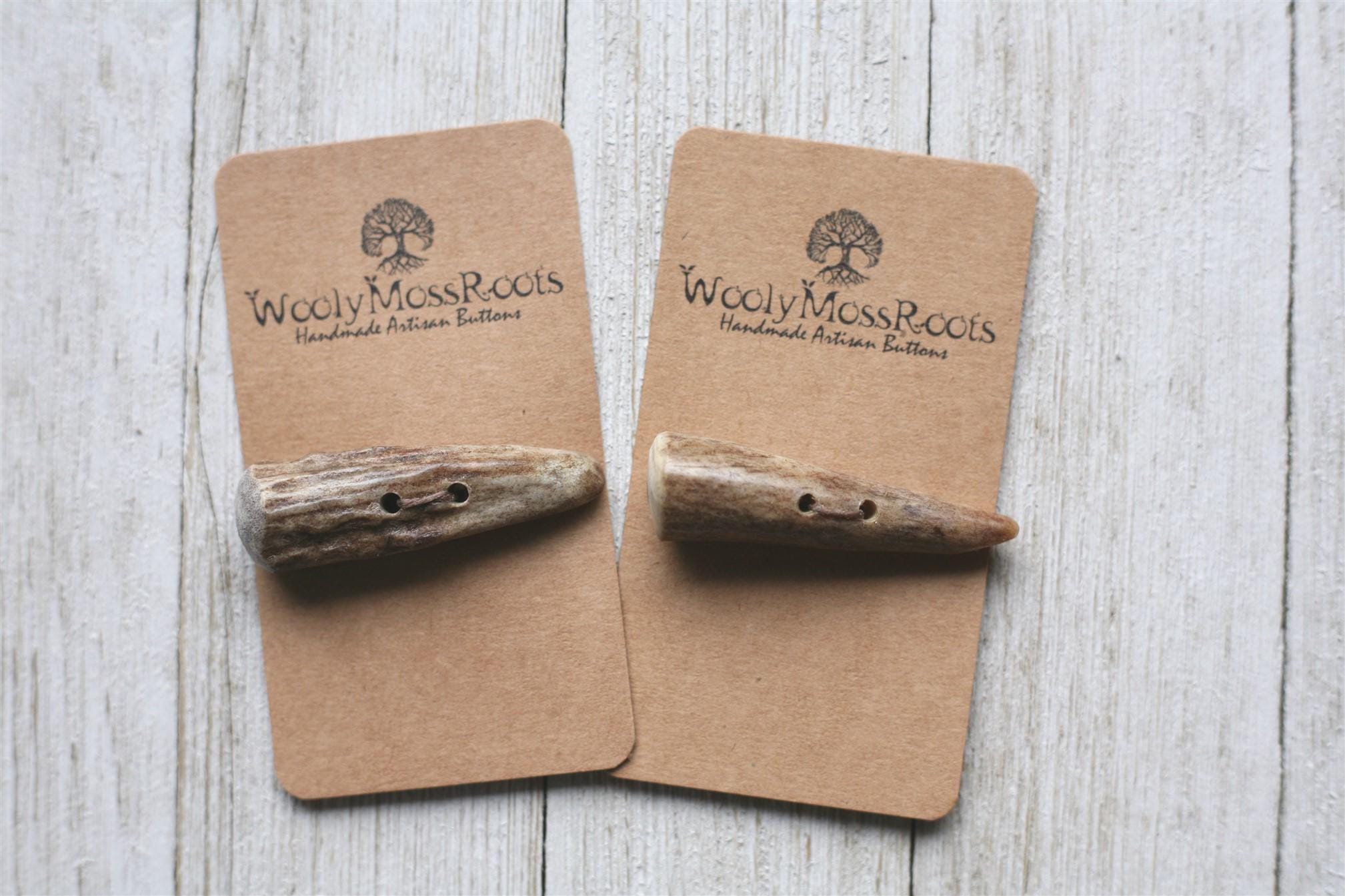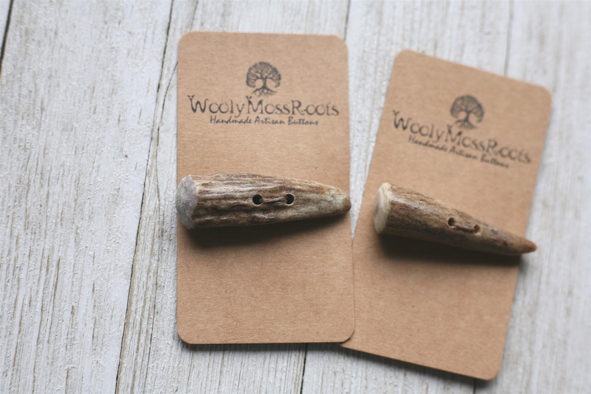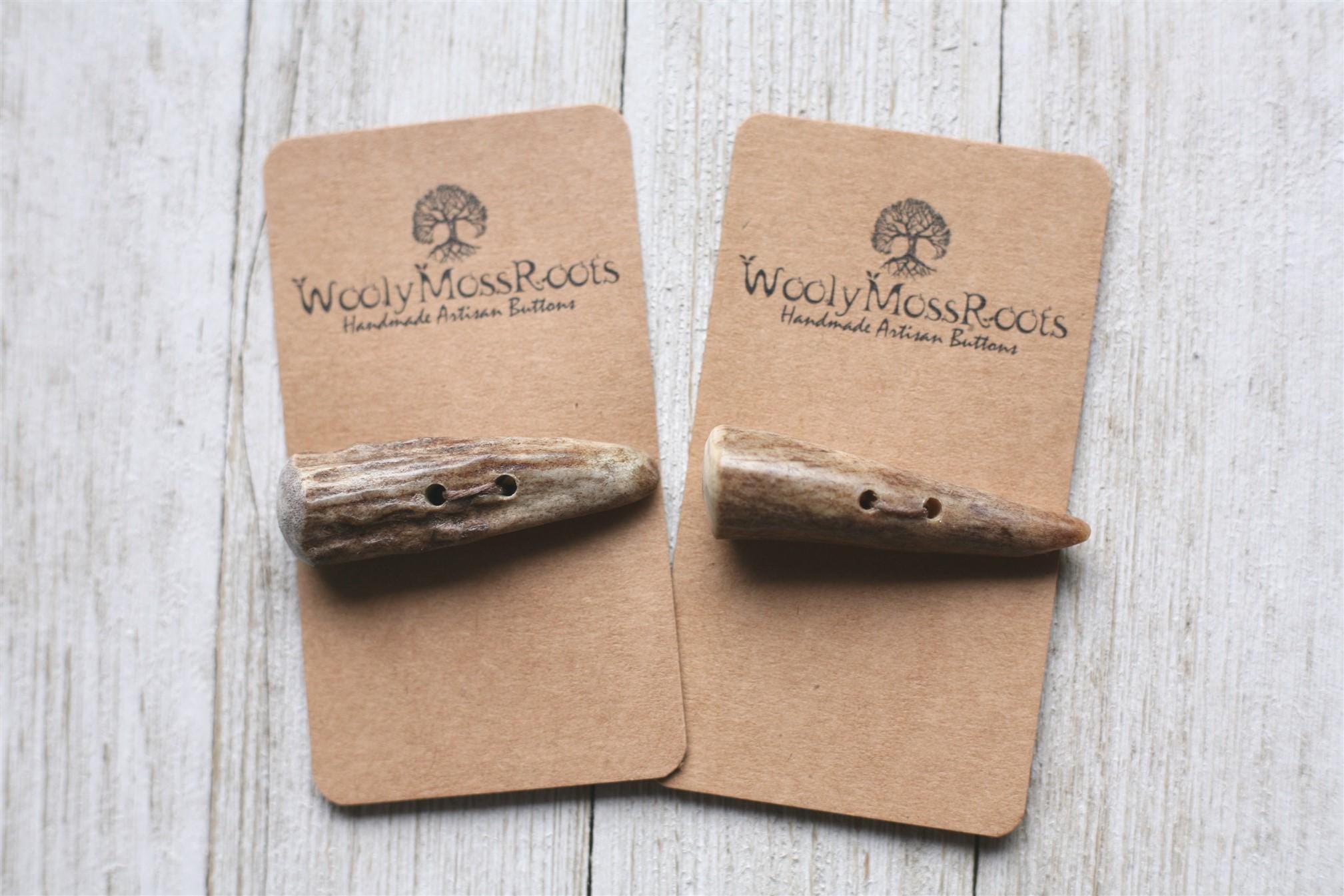 We absolutely love the antler toggle buttons we offer! My husband Jeff and I (Taryn) create these toggles together in shed deer antler. Male deer shed their antlers once a year and grow back new ones. The antlers make incredible buttons, not only for how well they hold up, but also for how beautiful they are.
