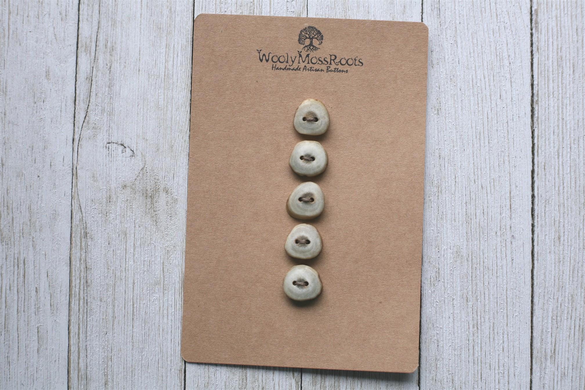 We absolutely love the antler buttons we offer! These buttons were created by my husband Jeff and I (Taryn) in shed deer antler. Male deer shed their antlers once a year and grow back new ones. The antlers make incredible buttons, not only for how well they hold up, but also for how beautiful they are.