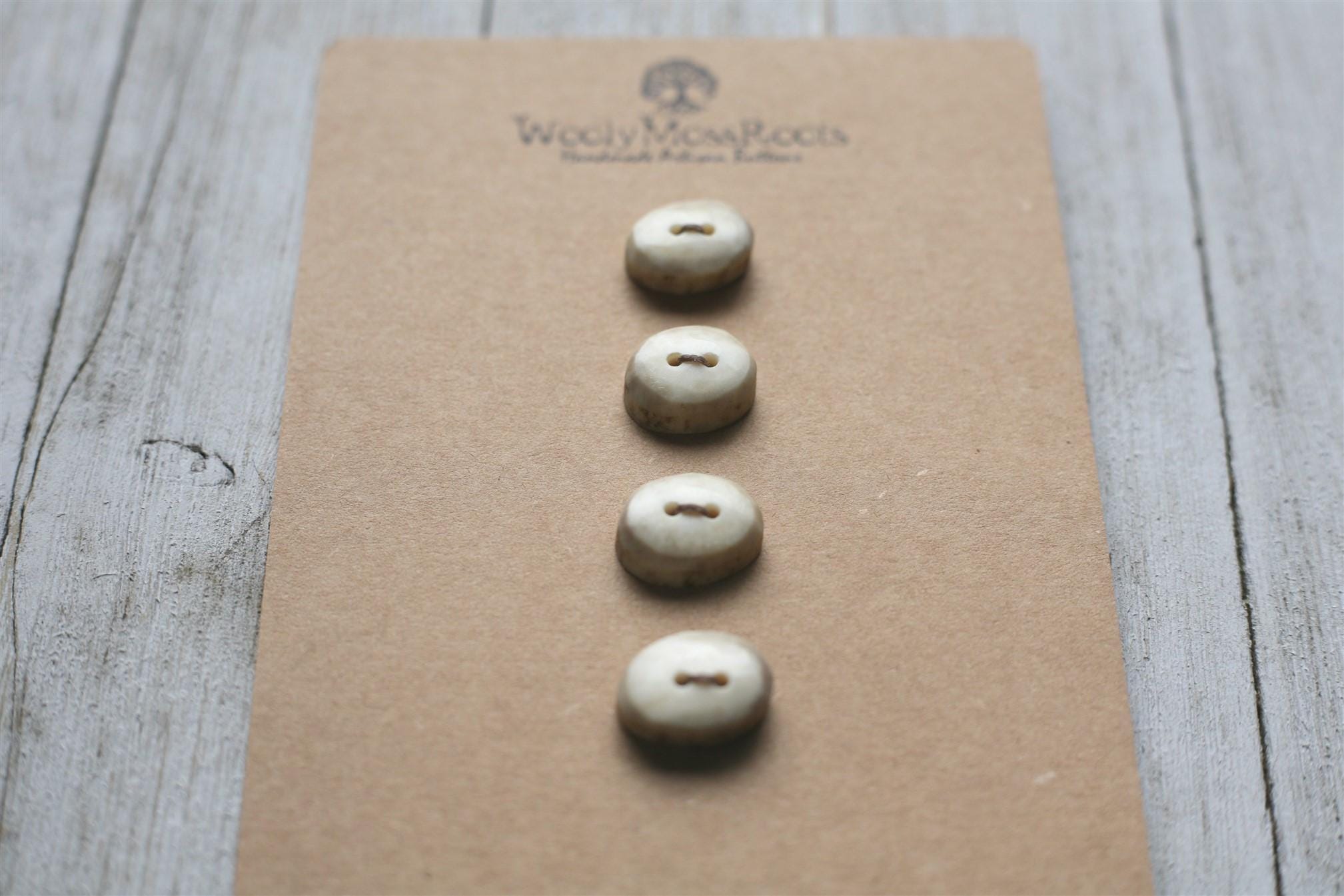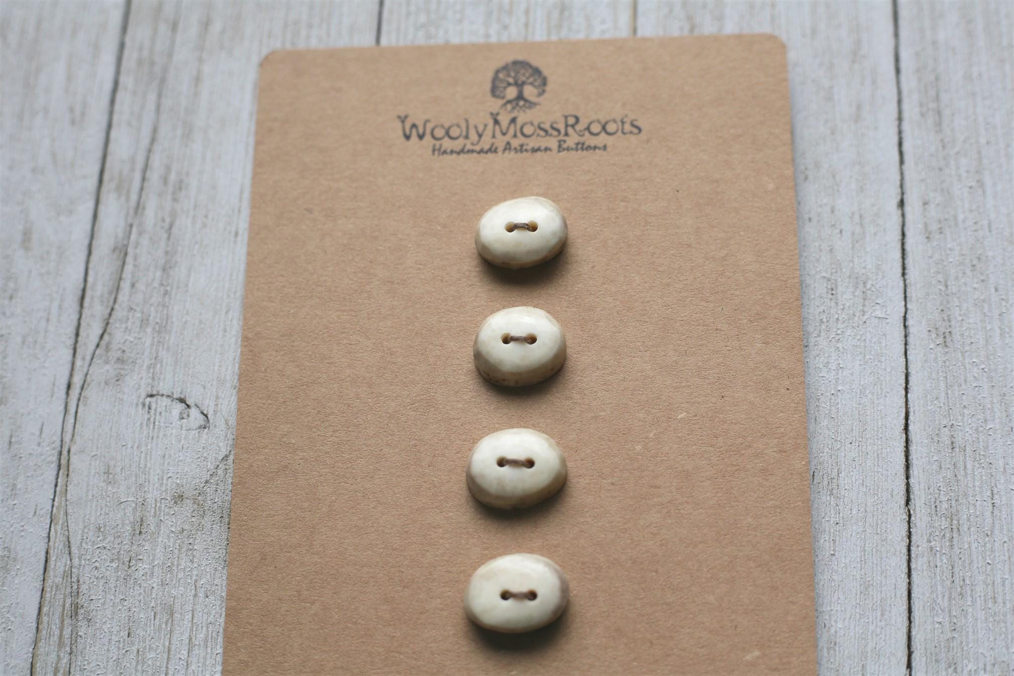 We absolutely love the antler buttons we offer! These buttons were created by my husband Jeff and I (Taryn) in shed deer antler. Male deer shed their antlers once a year and grow back new ones. The antlers make incredible buttons, not only for how well they hold up, but also for how beautiful they are.