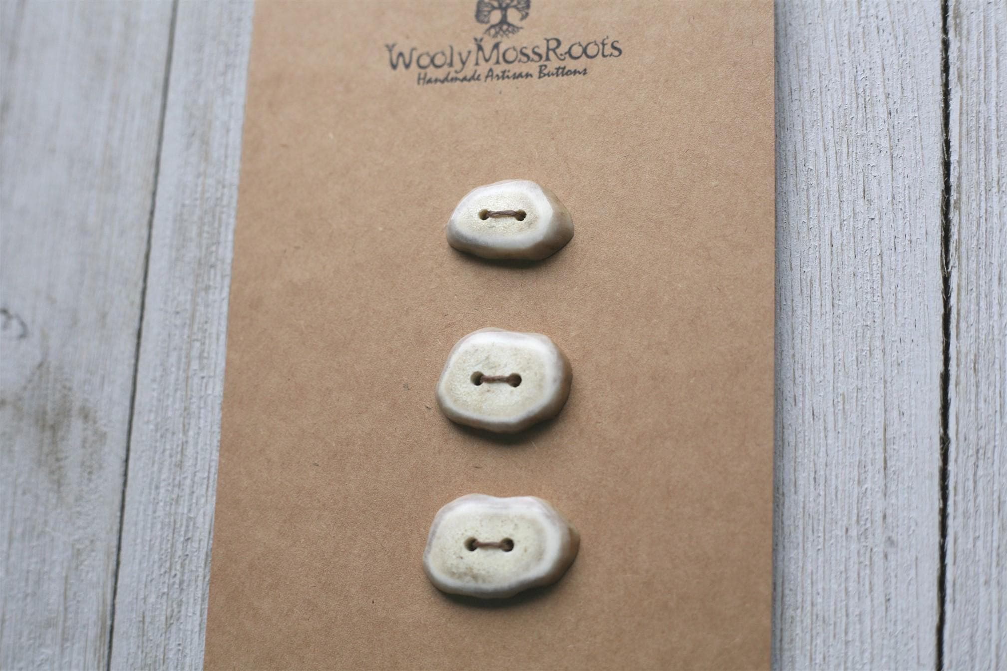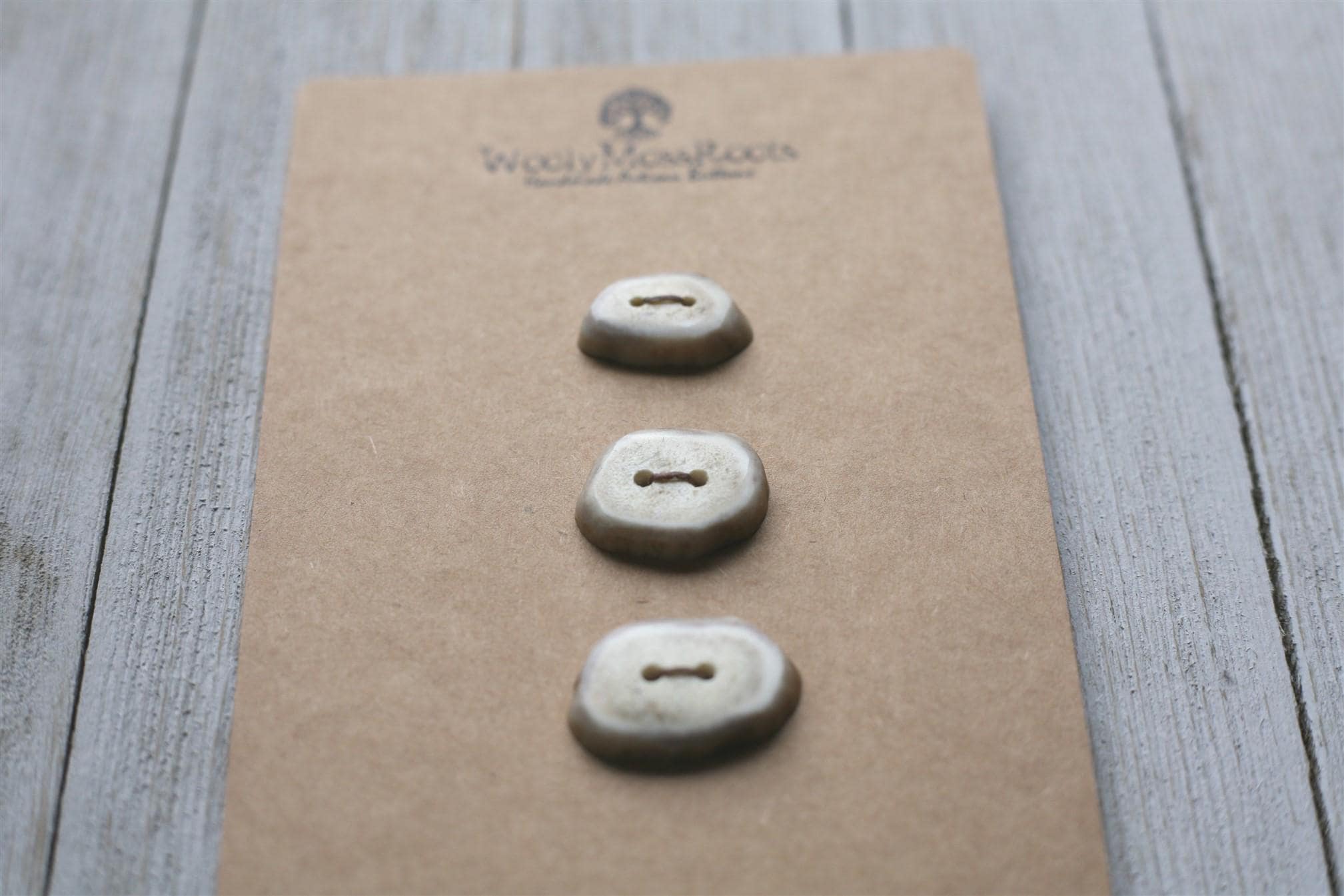 We absolutely love the antler buttons we offer! These buttons were created by my husband Jeff and I (Taryn) in shed deer antler. Male deer shed their antlers once a year and grow back new ones. The antlers make incredible buttons, not only for how well they hold up, but also for how beautiful they are.