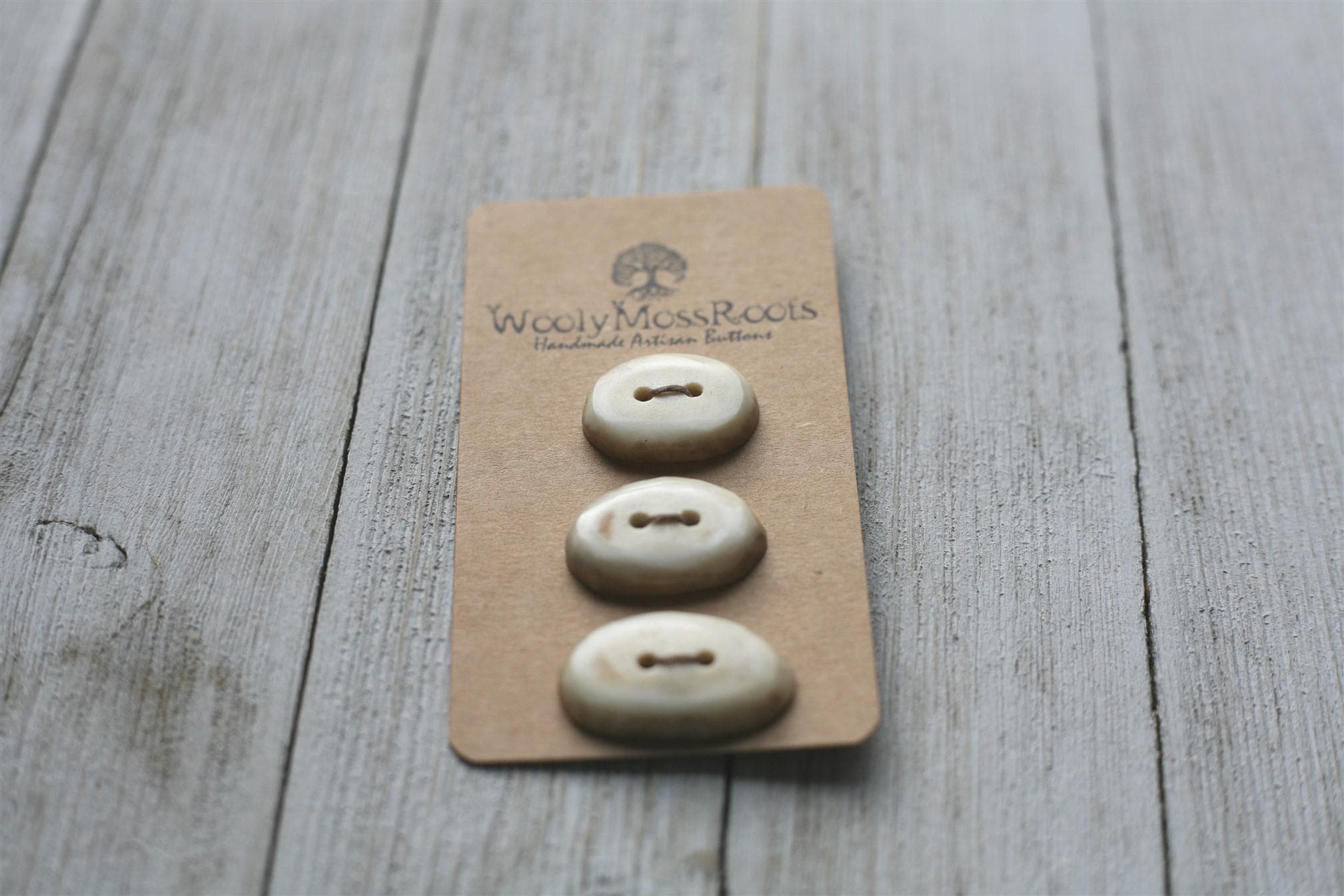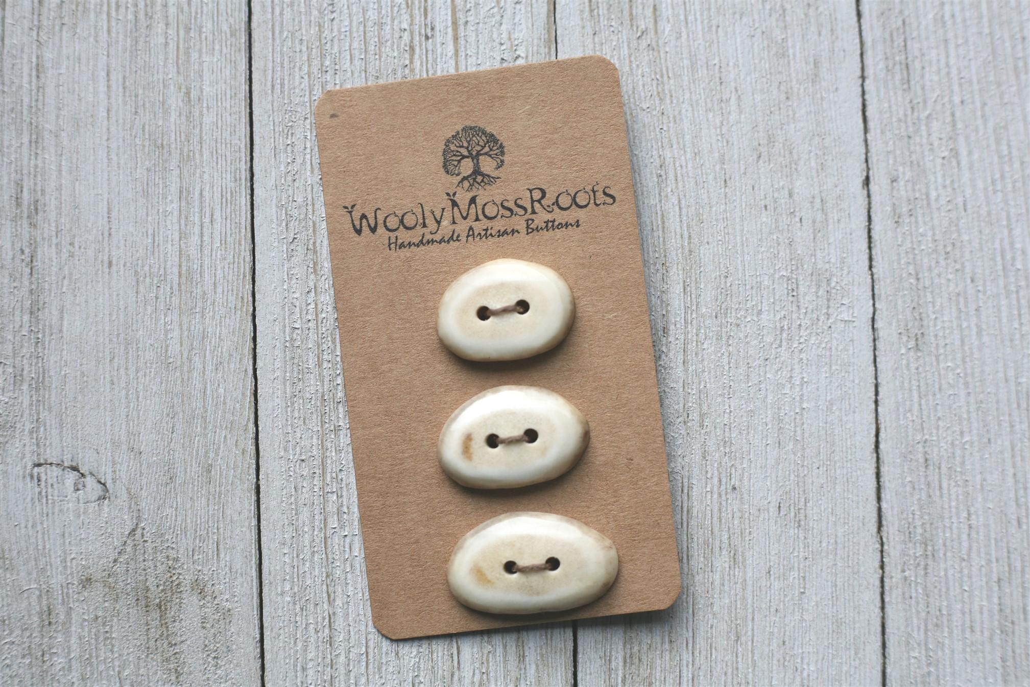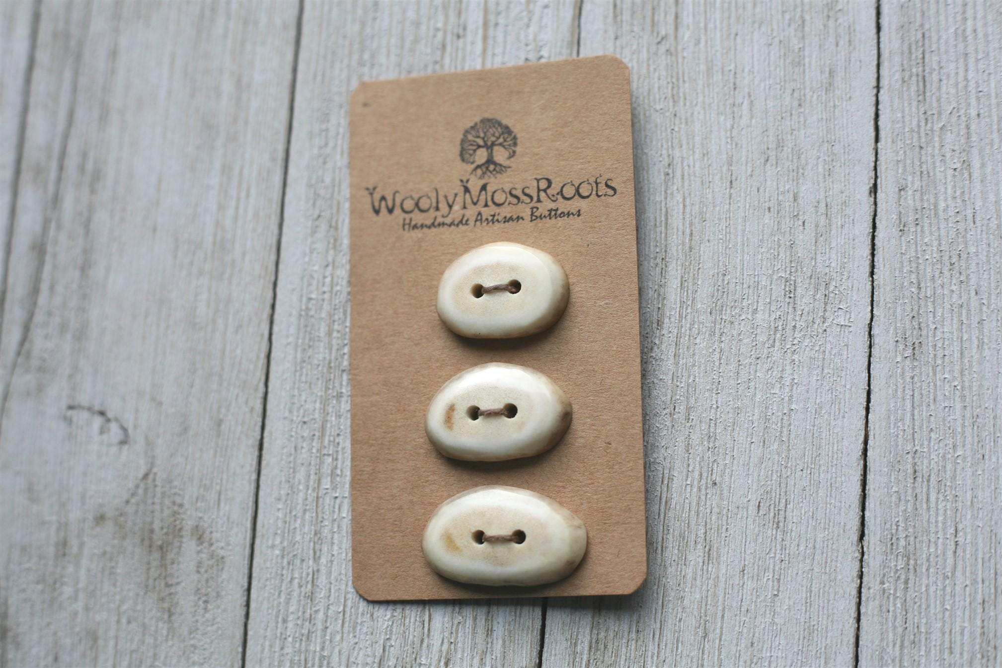 We absolutely love the antler buttons we offer! These buttons were created by my husband Jeff and I (Taryn) in shed deer antler. Male deer shed their antlers once a year and grow back new ones. The antlers make incredible buttons, not only for how well they hold up, but also for how beautiful they are.