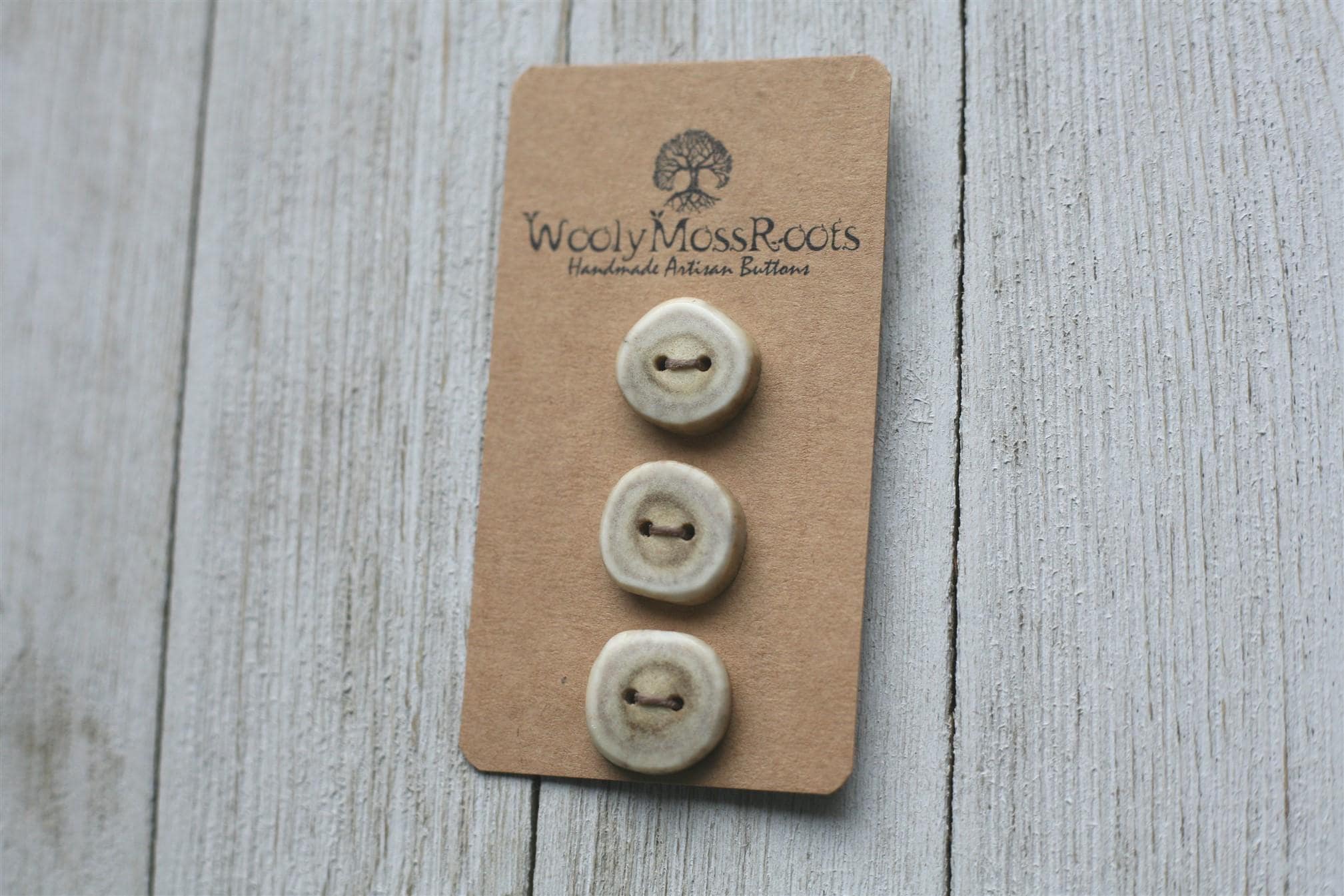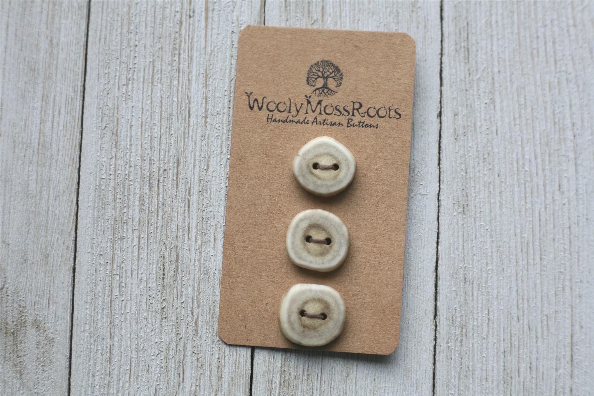 We absolutely love the antler buttons we offer! These buttons were created by my husband Jeff and I (Taryn) in shed deer antler. Male deer shed their antlers once a year and grow back new ones. The antlers make incredible buttons, not only for how well they hold up, but also for how beautiful they are.
