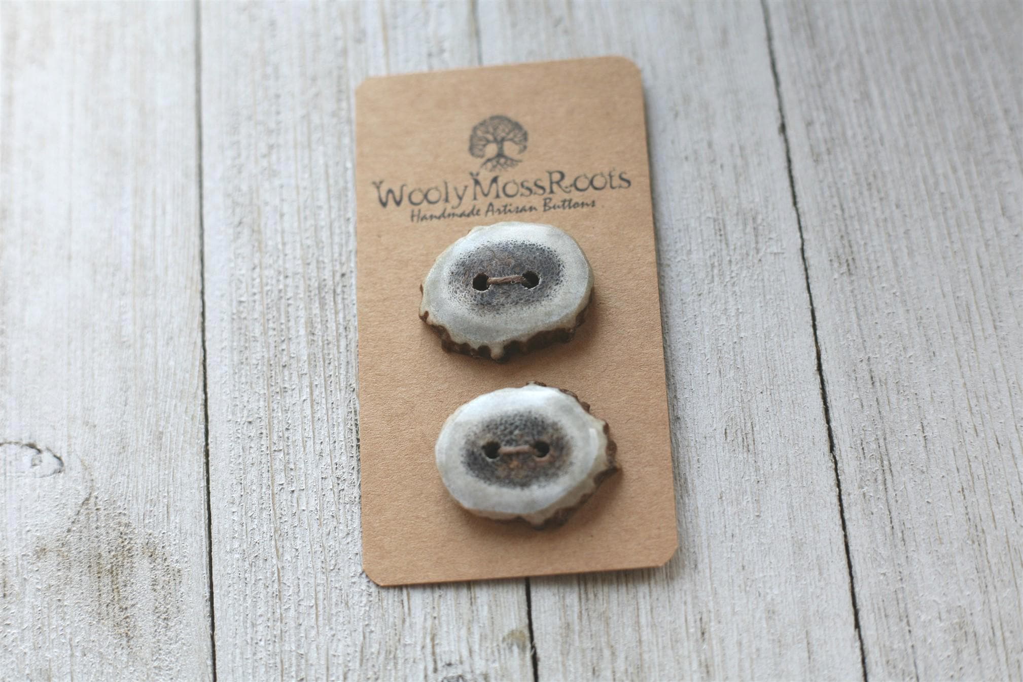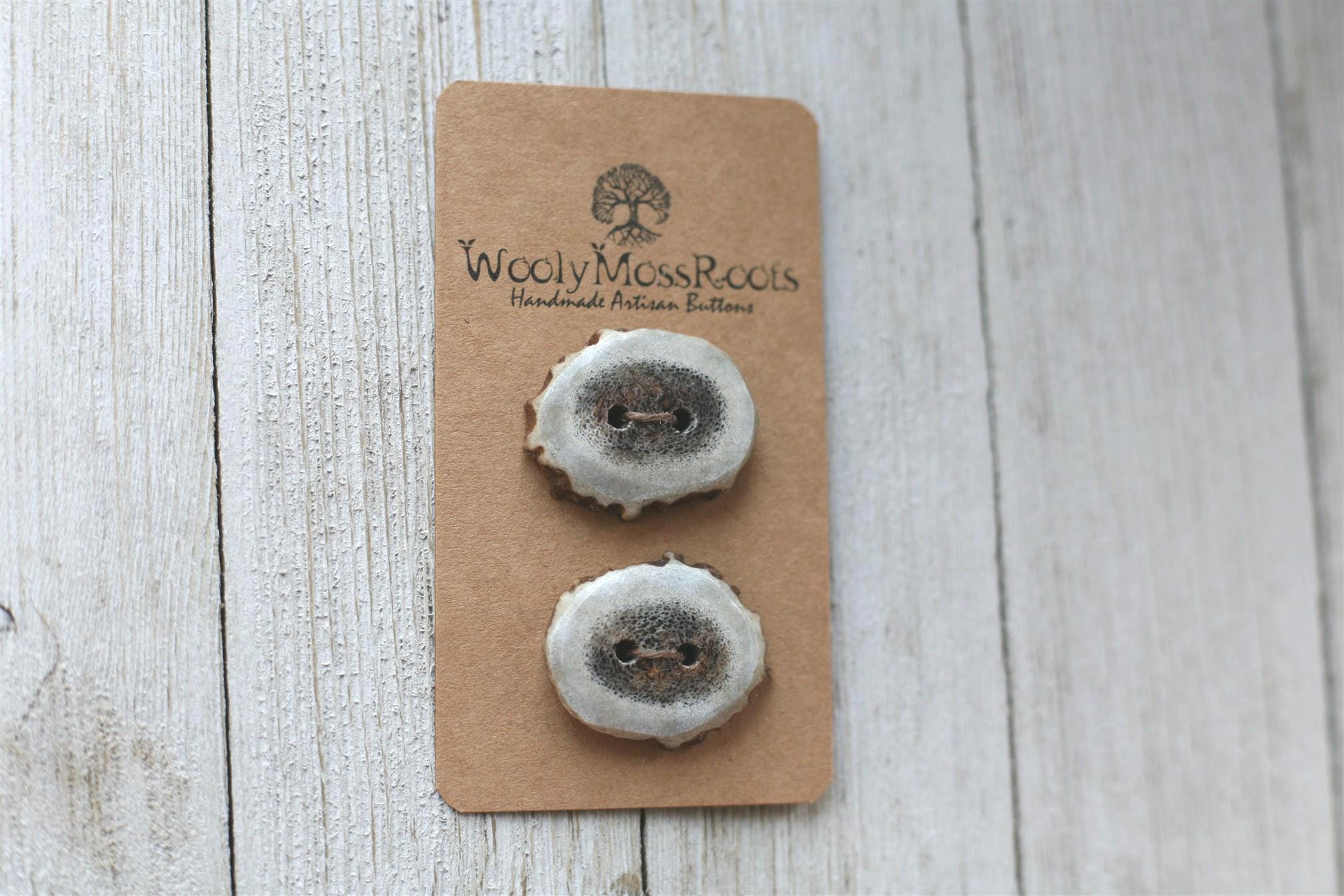 We absolutely love the antler buttons we offer! These buttons were created by my husband Jeff and I (Taryn) in shed deer antler. Male deer shed their antlers once a year and grow back new ones. The antlers make incredible buttons, not only for how well they hold up, but also for how beautiful they are.