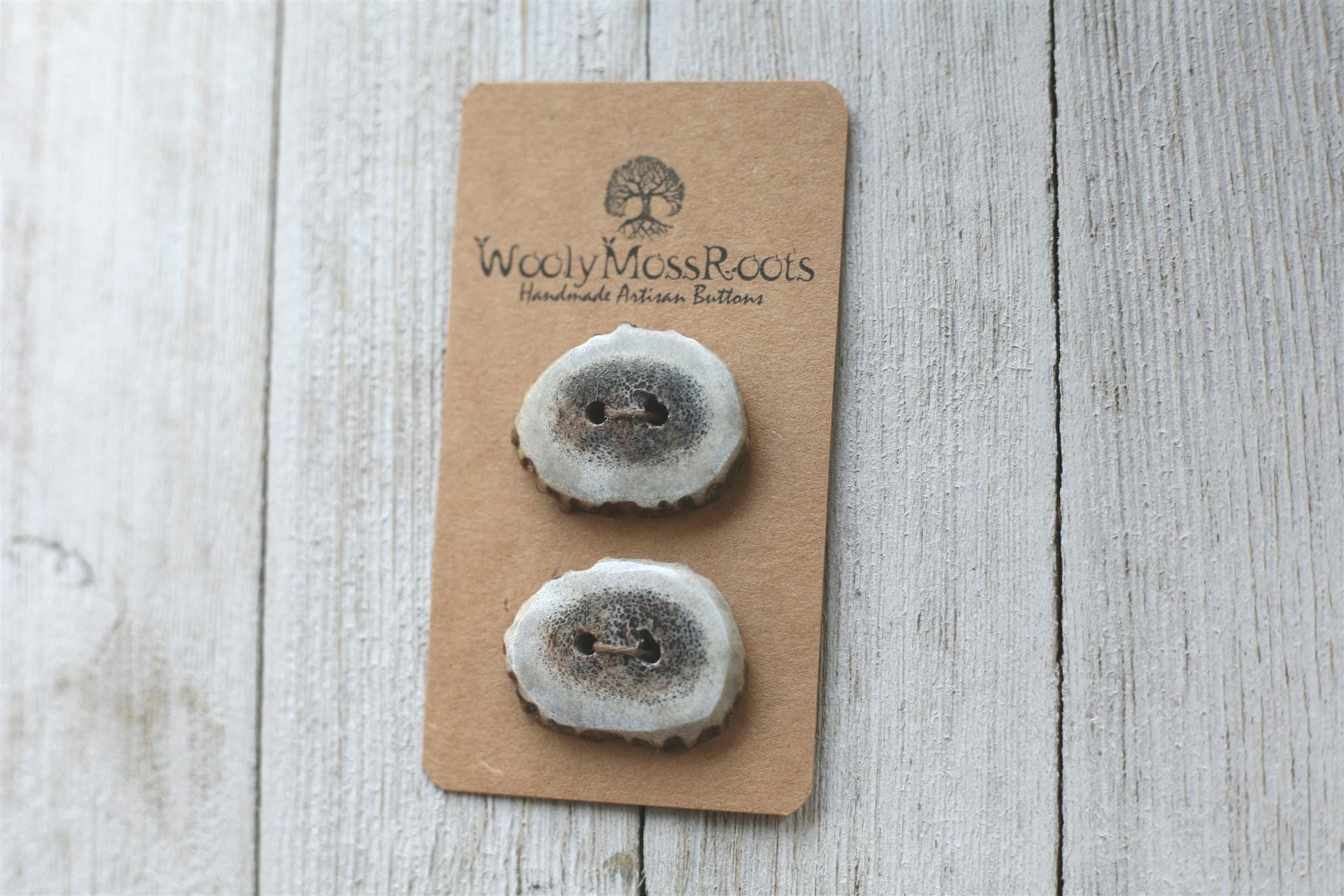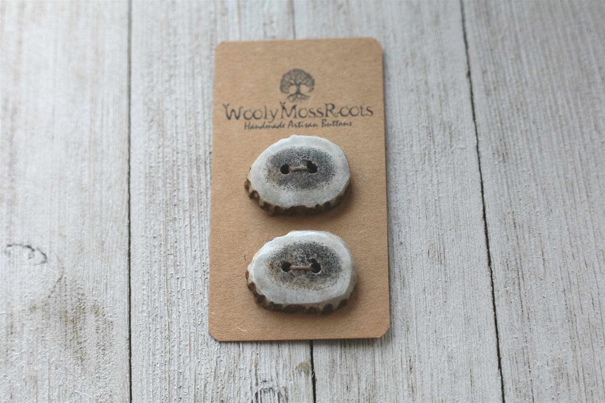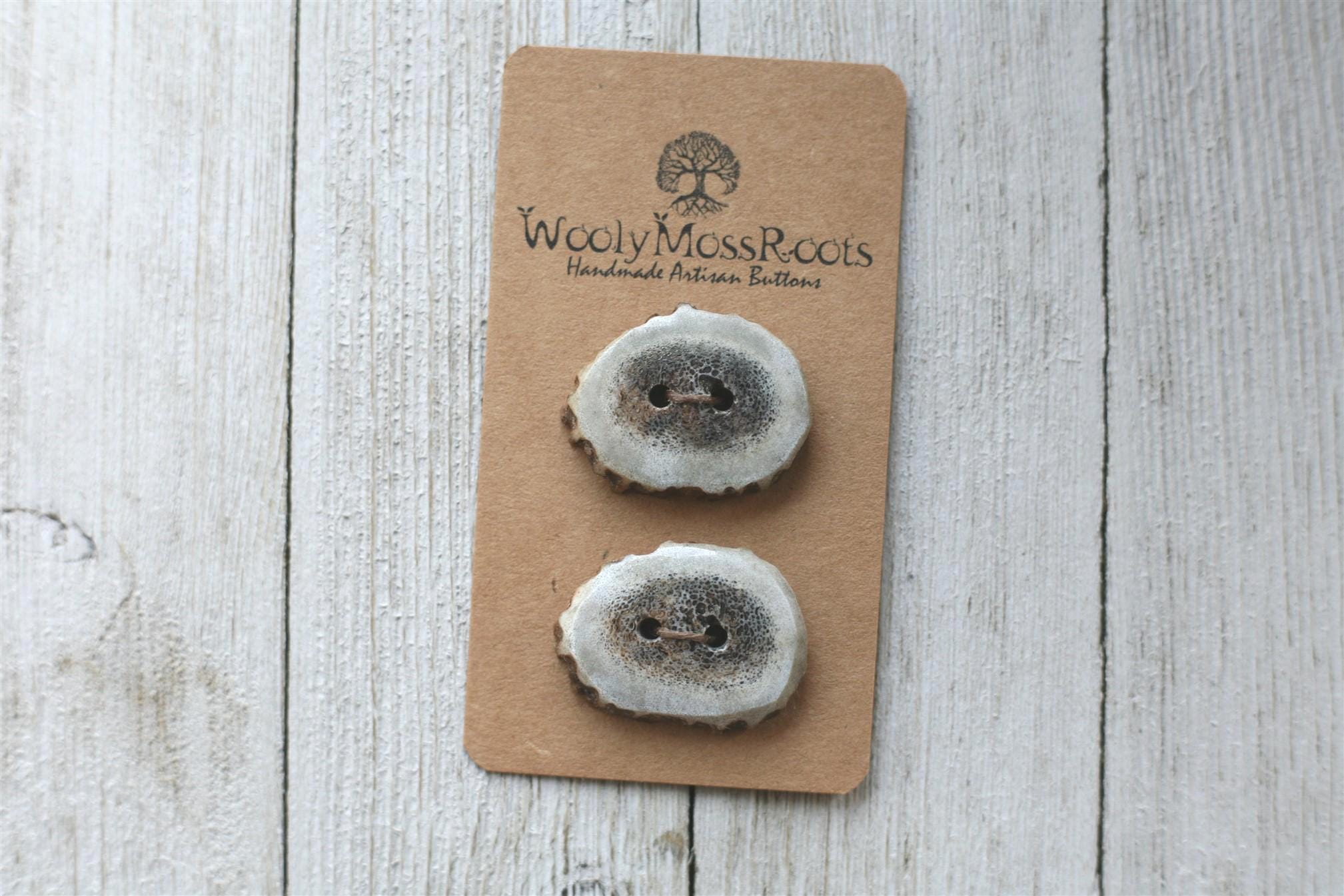 We absolutely love the antler buttons we offer! These buttons were created by my husband Jeff and I (Taryn) in shed deer antler. Male deer shed their antlers once a year and grow back new ones. The antlers make incredible buttons, not only for how well they hold up, but also for how beautiful they are.