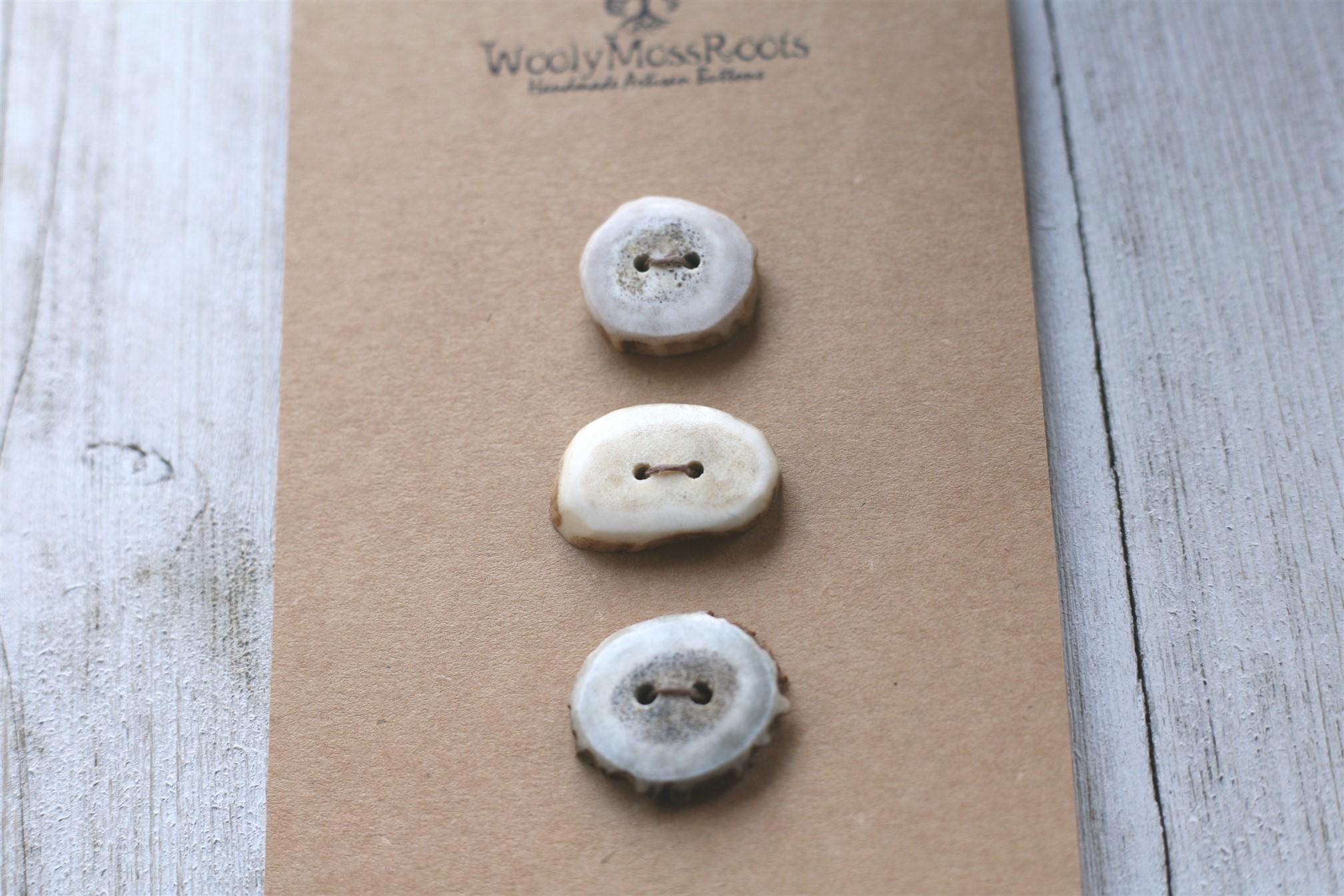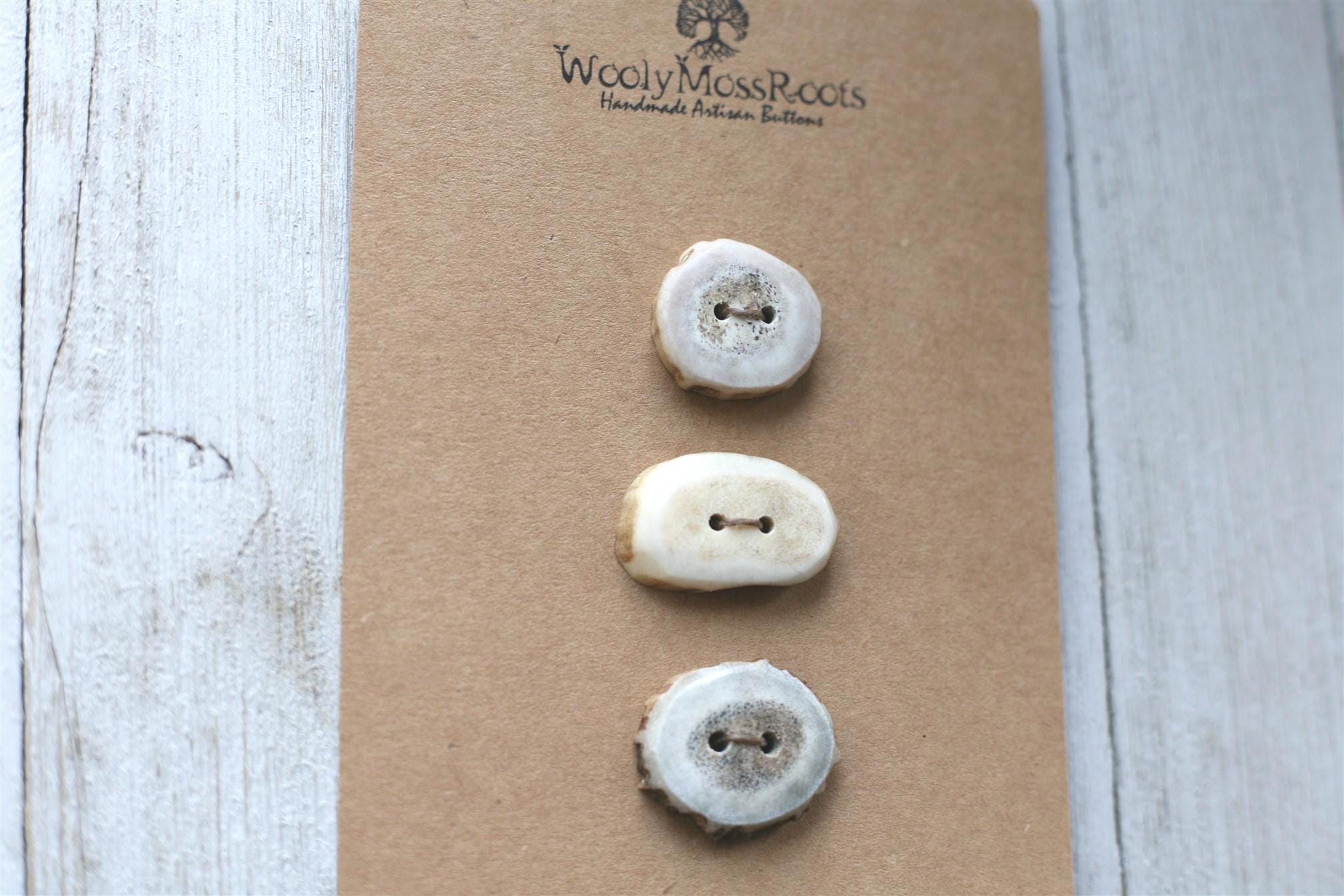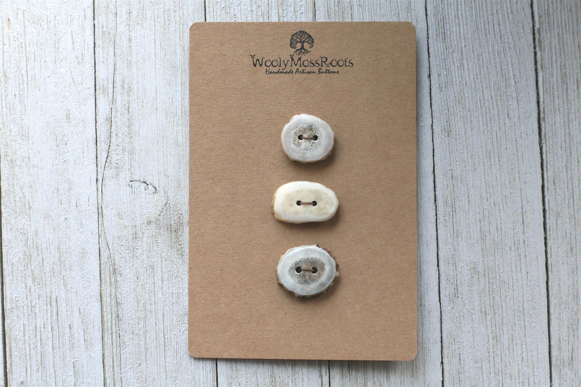 We absolutely love the antler buttons we offer! These buttons were created by my husband Jeff and I (Taryn) in shed deer antler. Male deer shed their antlers once a year and grow back new ones. The antlers make incredible buttons, not only for how well they hold up, but also for how beautiful they are.