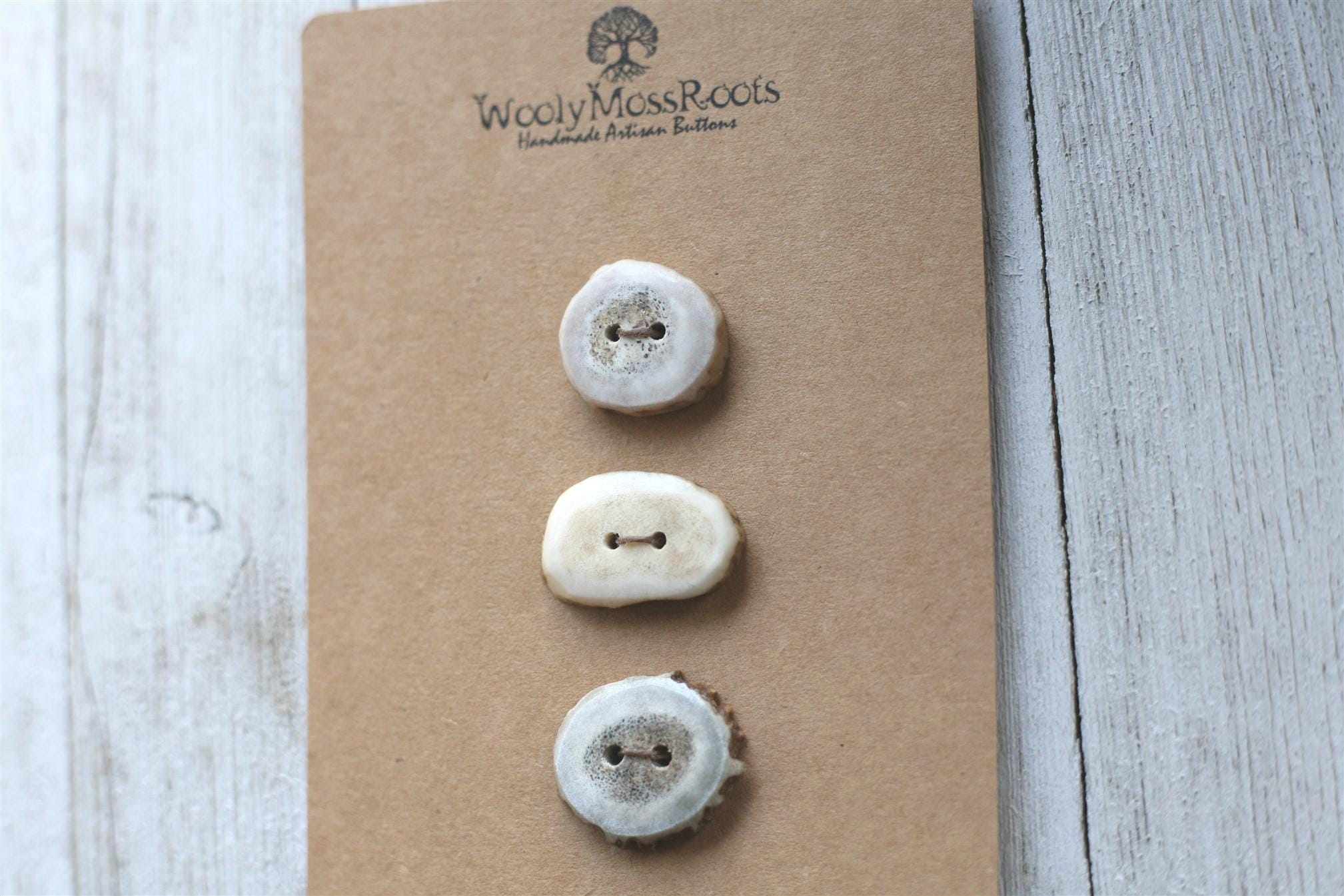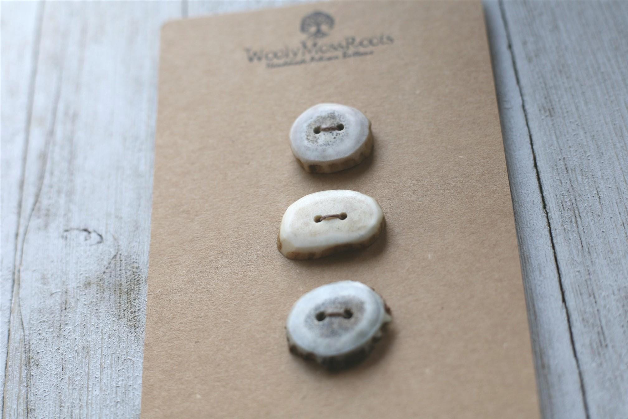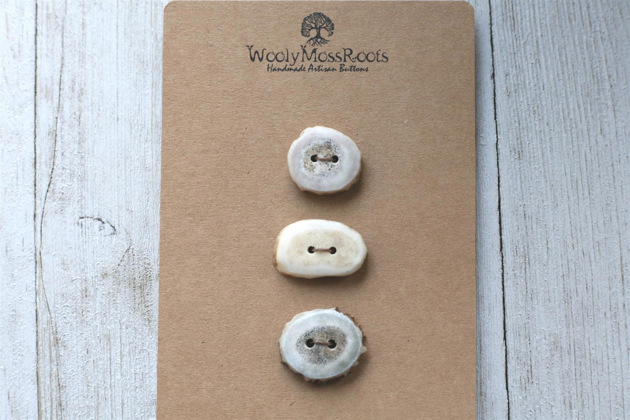 We absolutely love the antler buttons we offer! These buttons were created by my husband Jeff and I (Taryn) in shed deer antler. Male deer shed their antlers once a year and grow back new ones. The antlers make incredible buttons, not only for how well they hold up, but also for how beautiful they are.