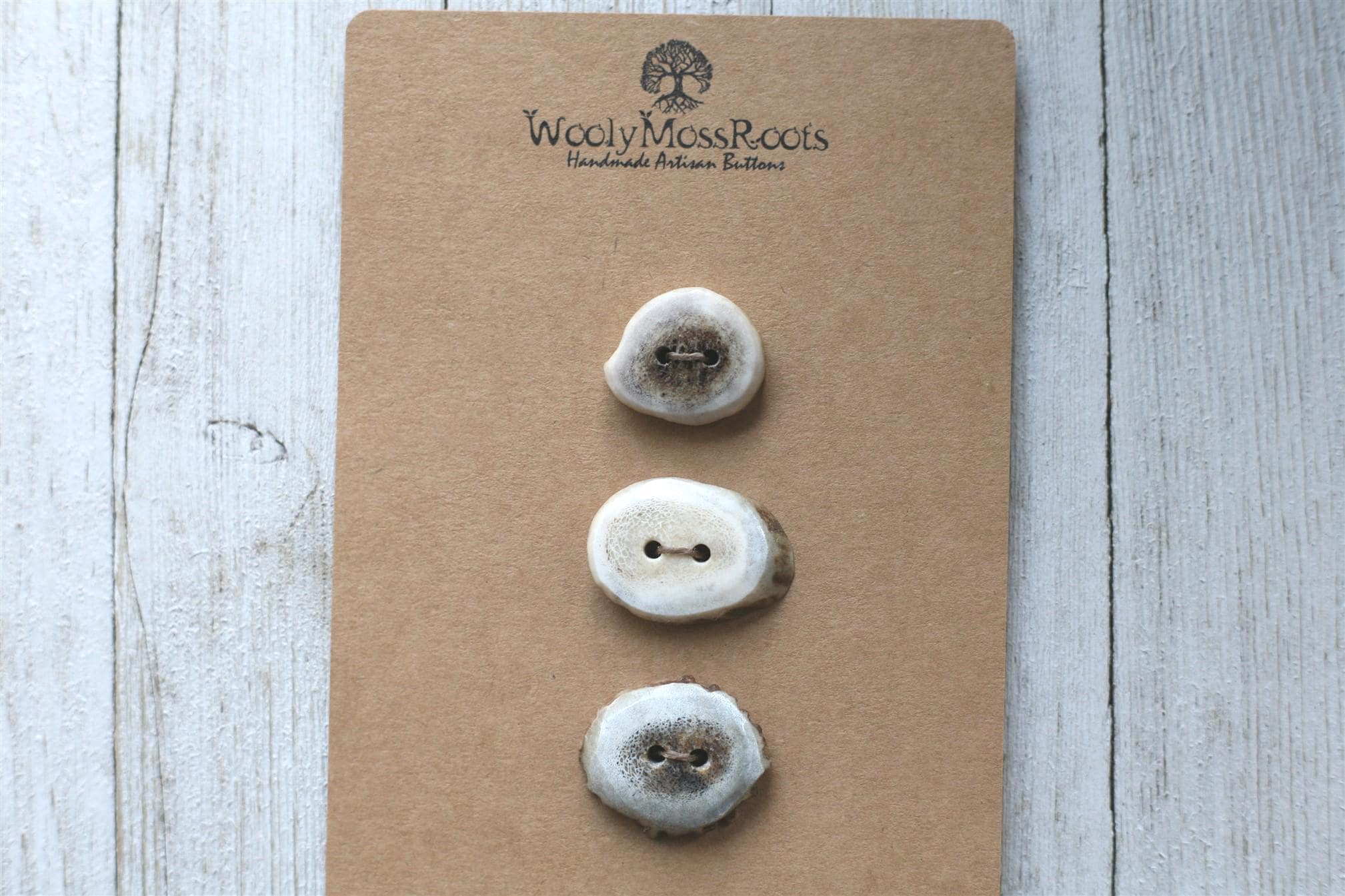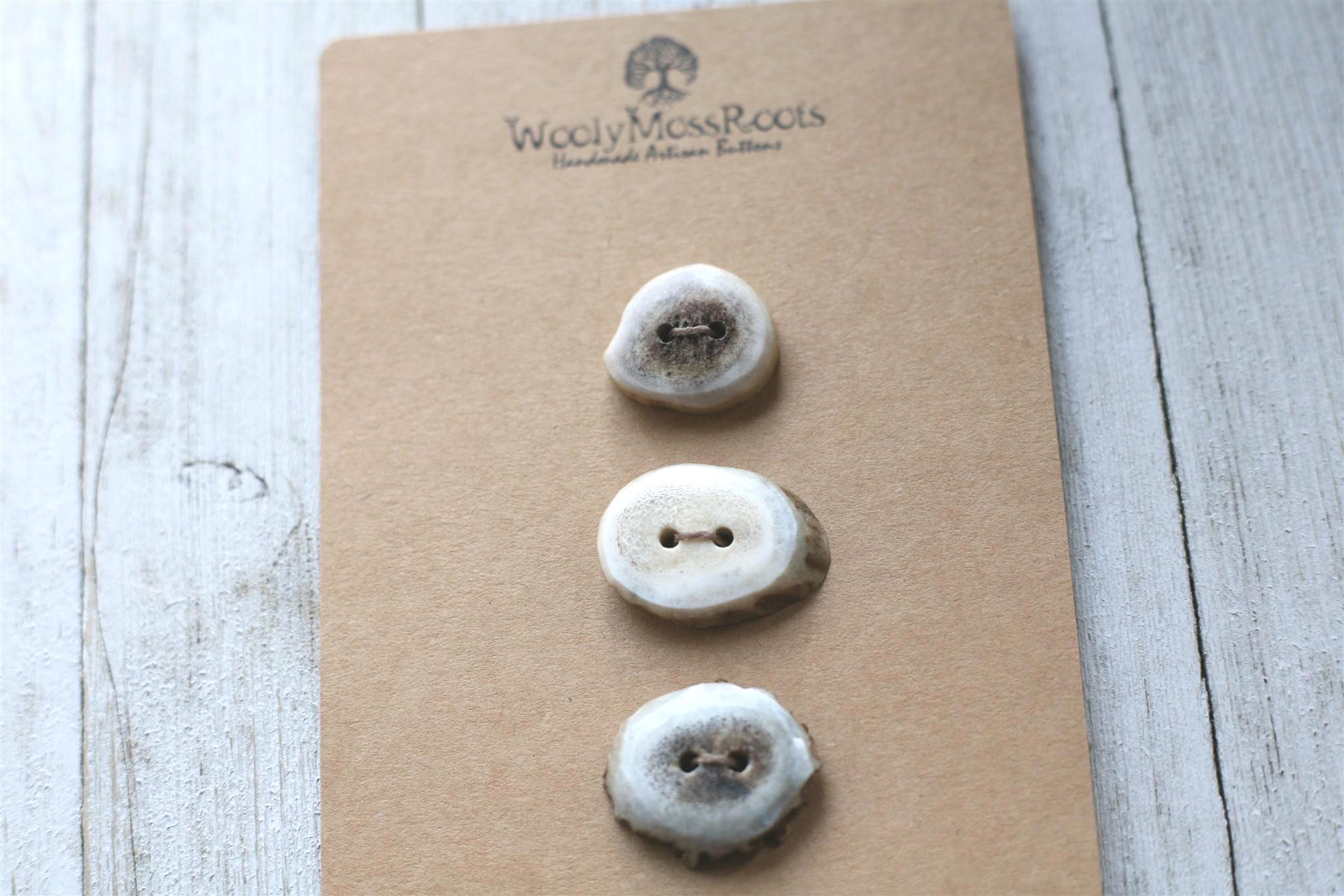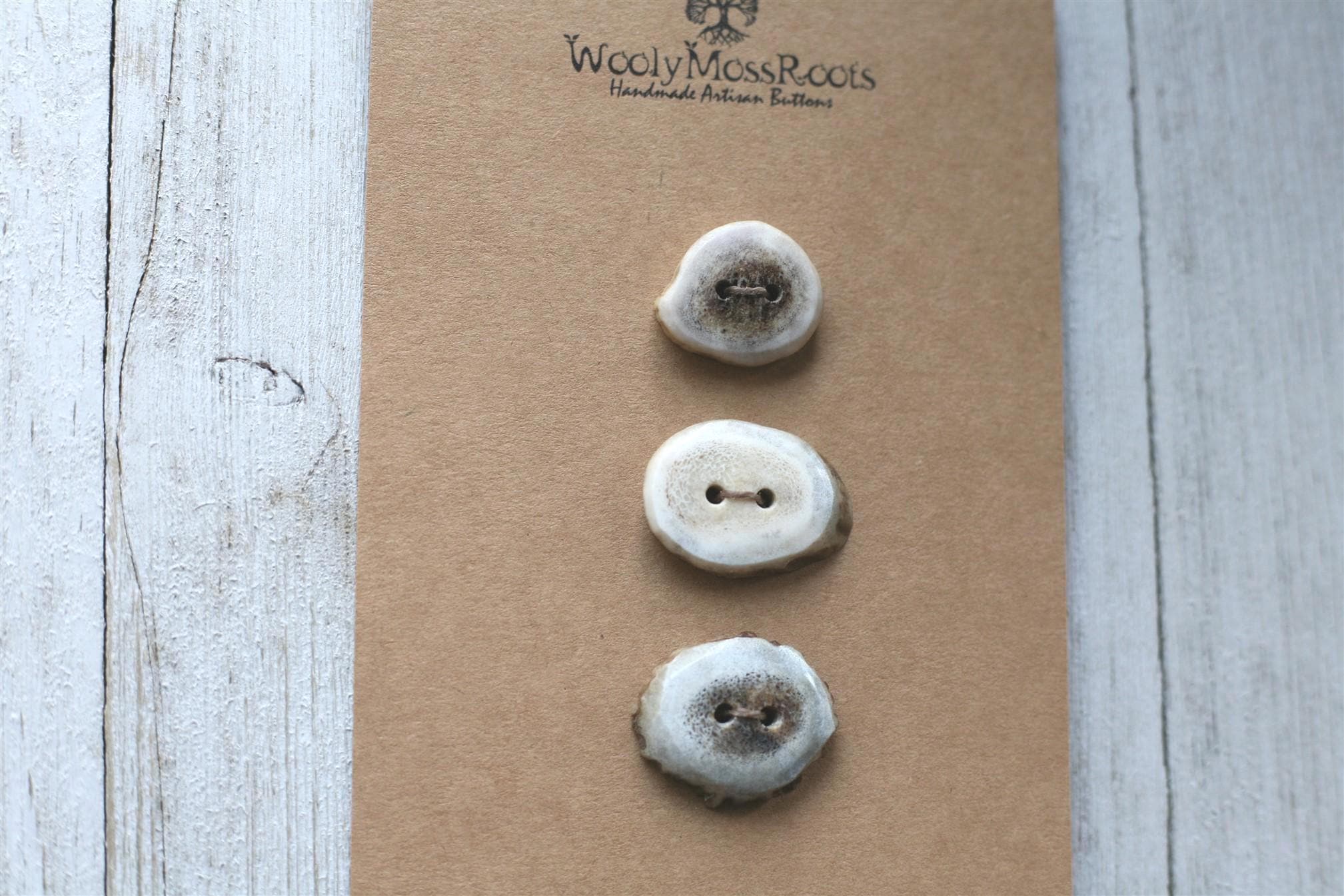 We absolutely love the antler buttons we offer! These buttons were created by my husband Jeff and I (Taryn) in shed deer antler. Male deer shed their antlers once a year and grow back new ones. The antlers make incredible buttons, not only for how well they hold up, but also for how beautiful they are.