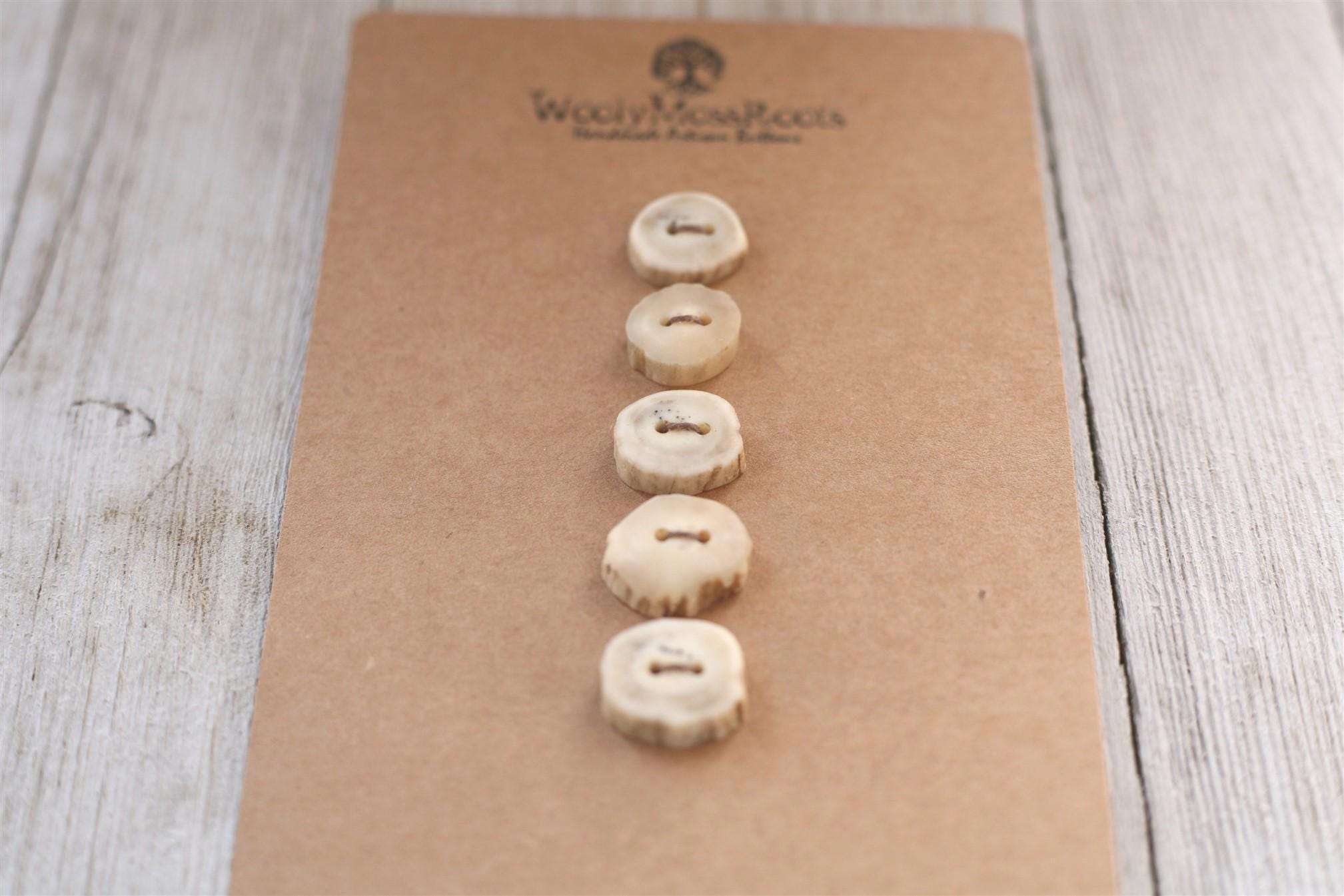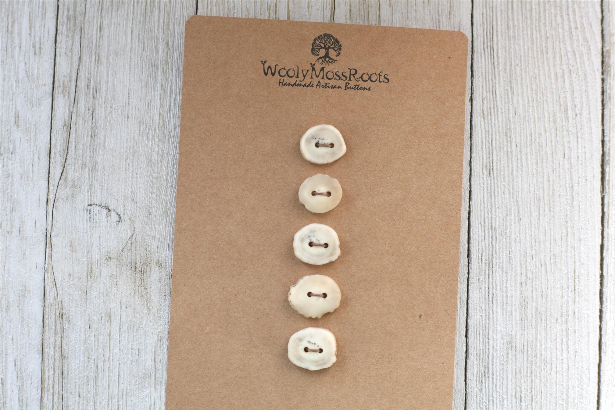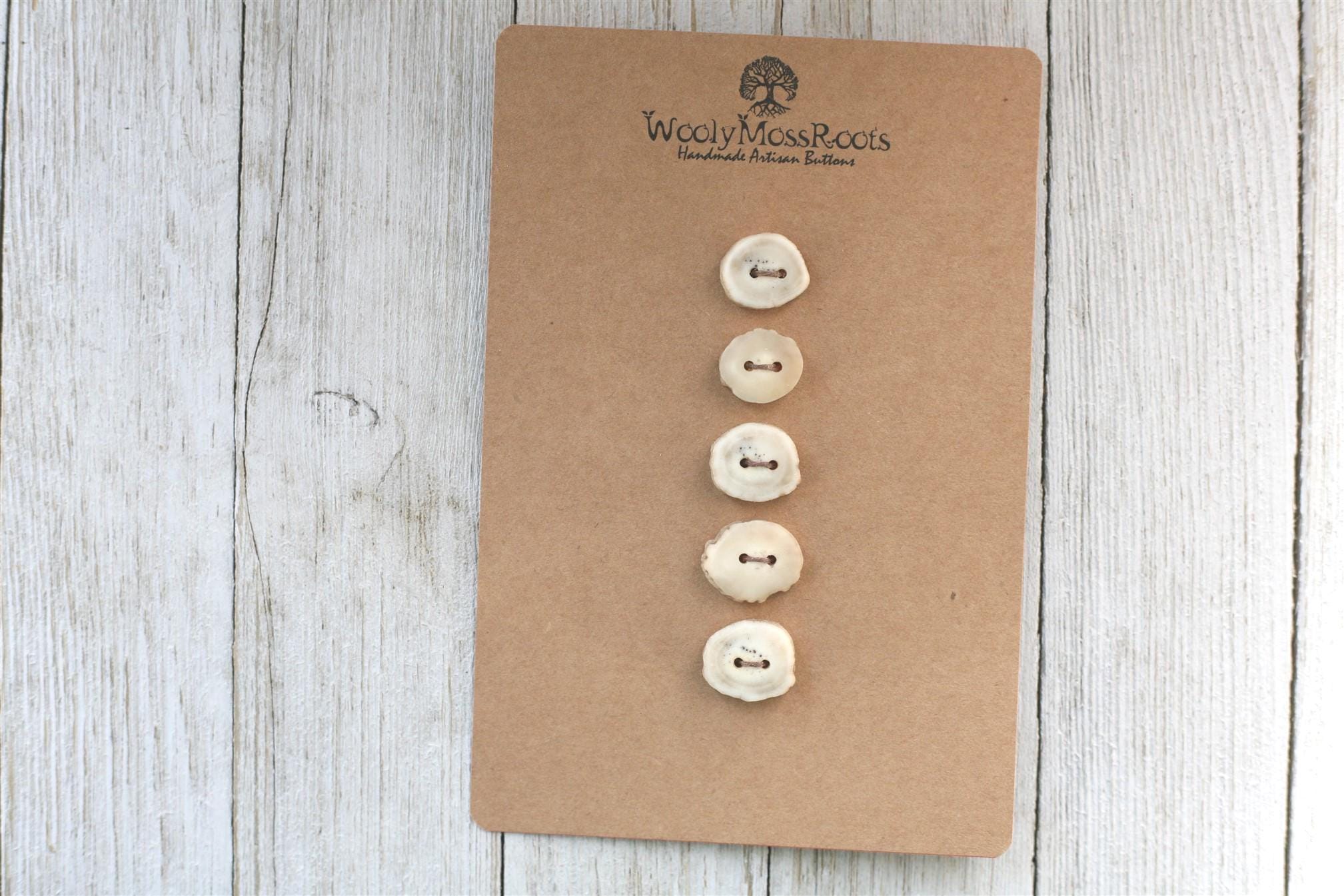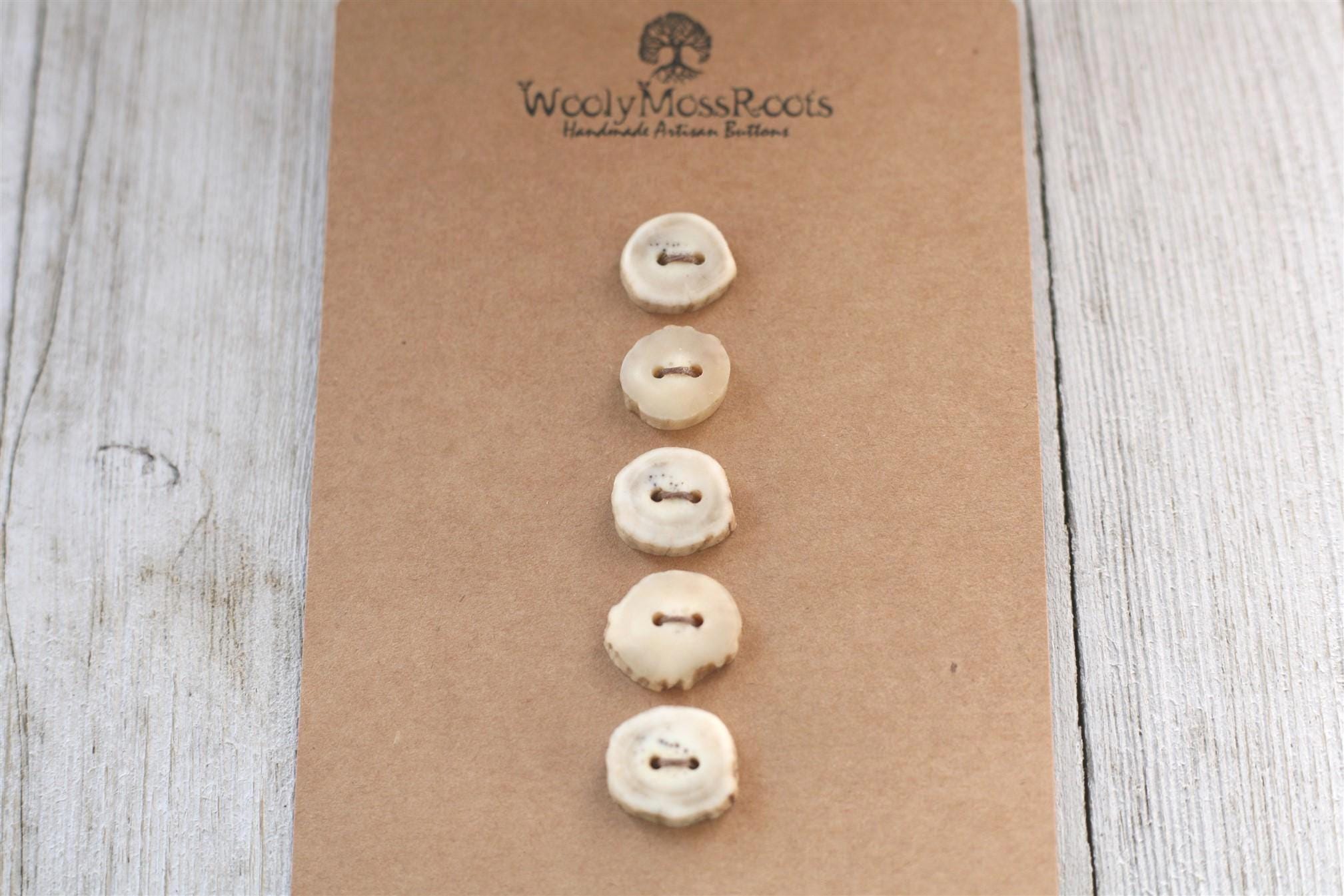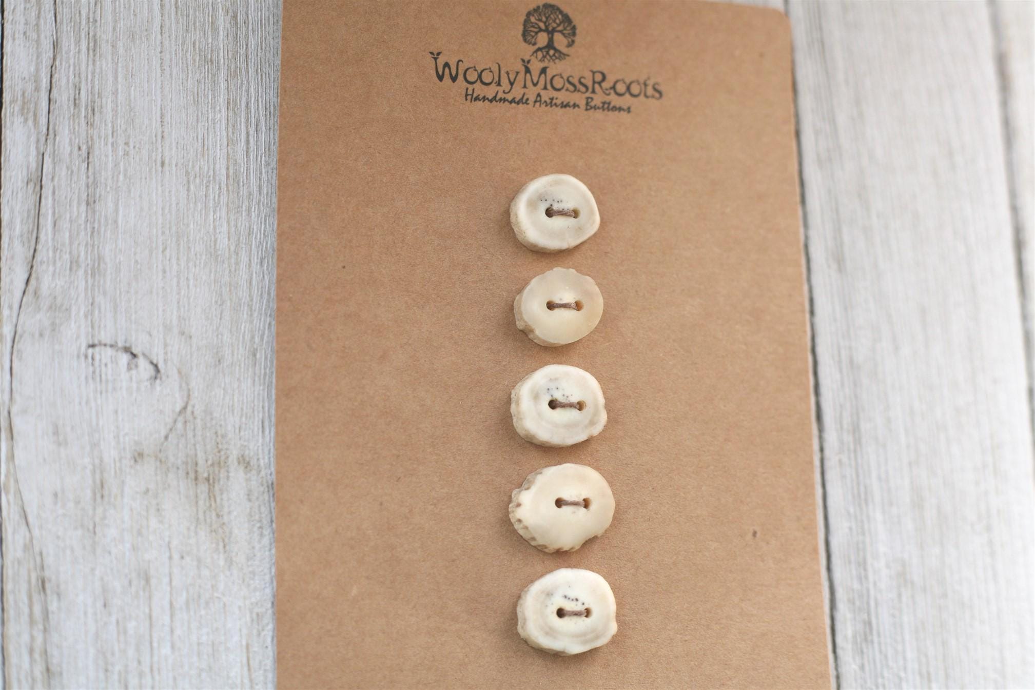 We absolutely love the antler buttons we offer! These buttons were created by my husband Jeff and I (Taryn) in shed deer antler. Male deer shed their antlers once a year and grow back new ones. The antlers make incredible buttons, not only for how well they hold up, but also for how beautiful they are.