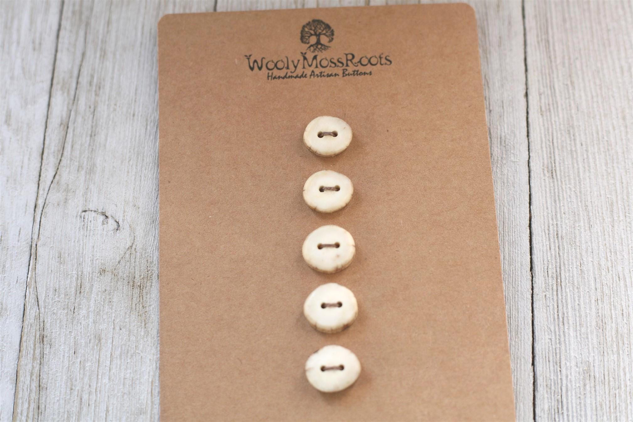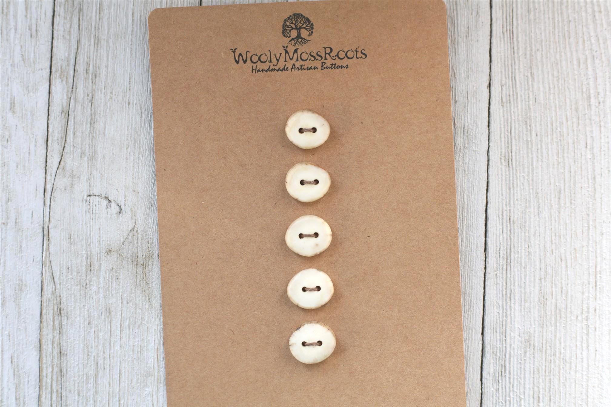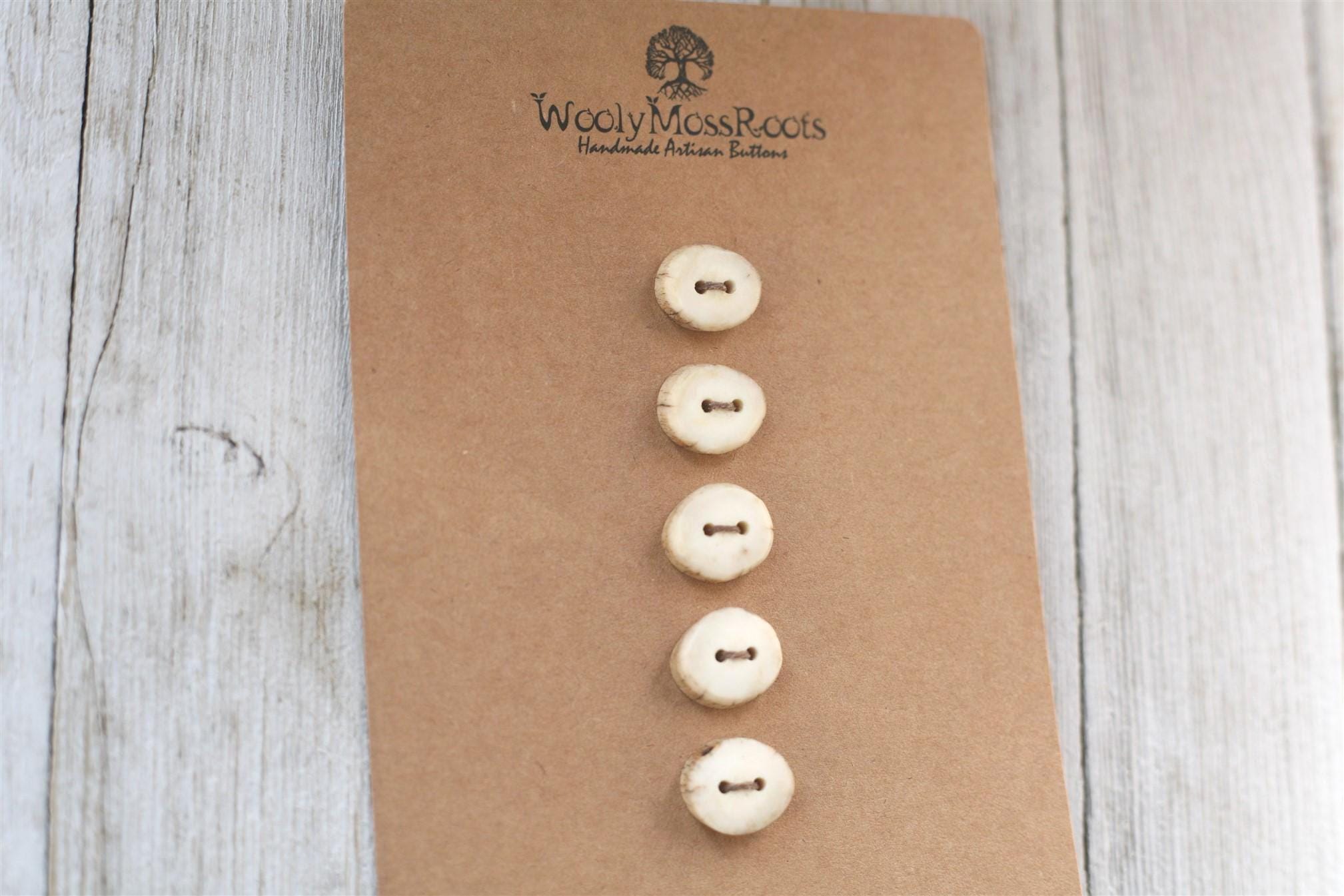 We absolutely love the antler buttons we offer! These buttons were created by my husband Jeff and I (Taryn) in shed deer antler. Male deer shed their antlers once a year and grow back new ones. The antlers make incredible buttons, not only for how well they hold up, but also for how beautiful they are.