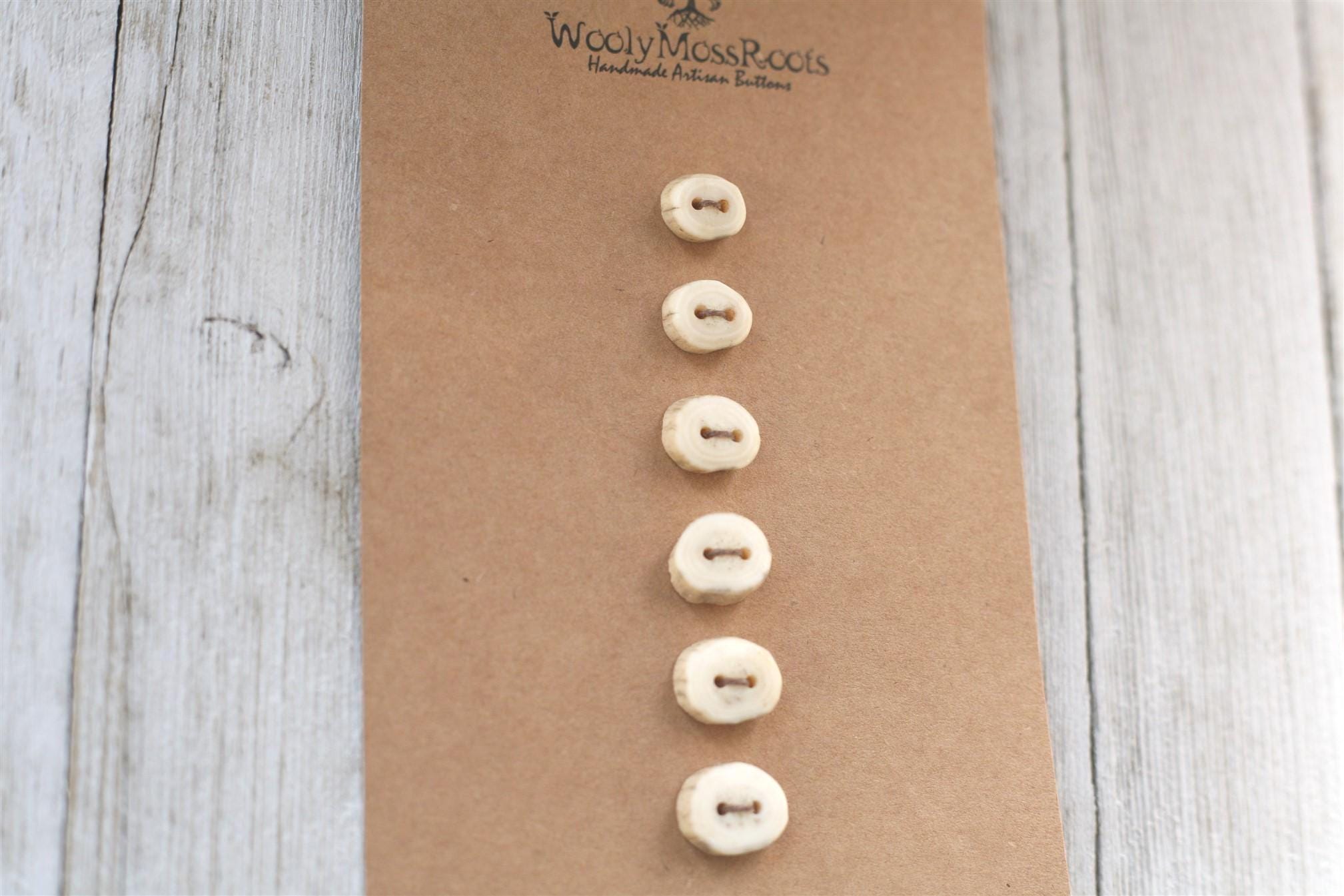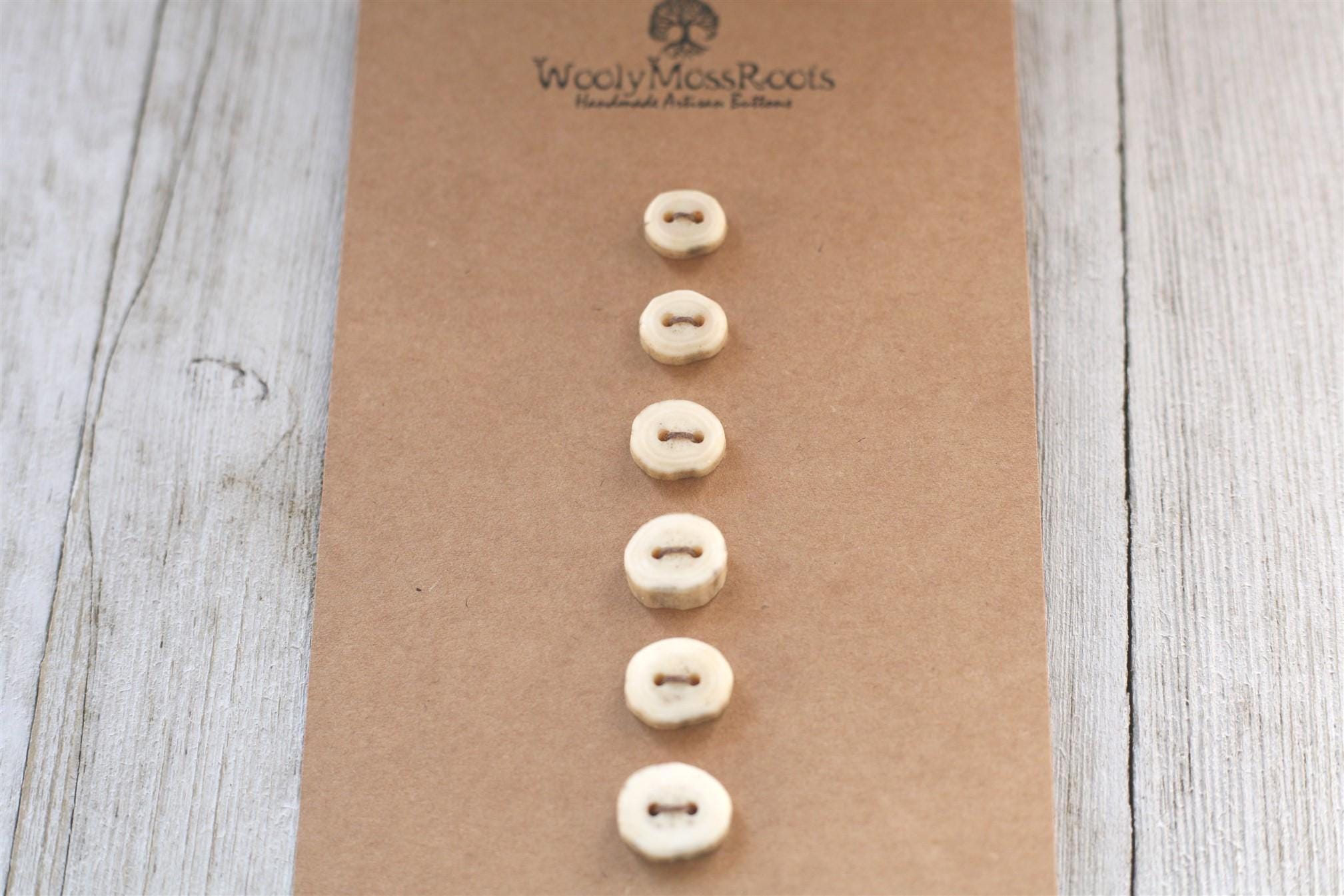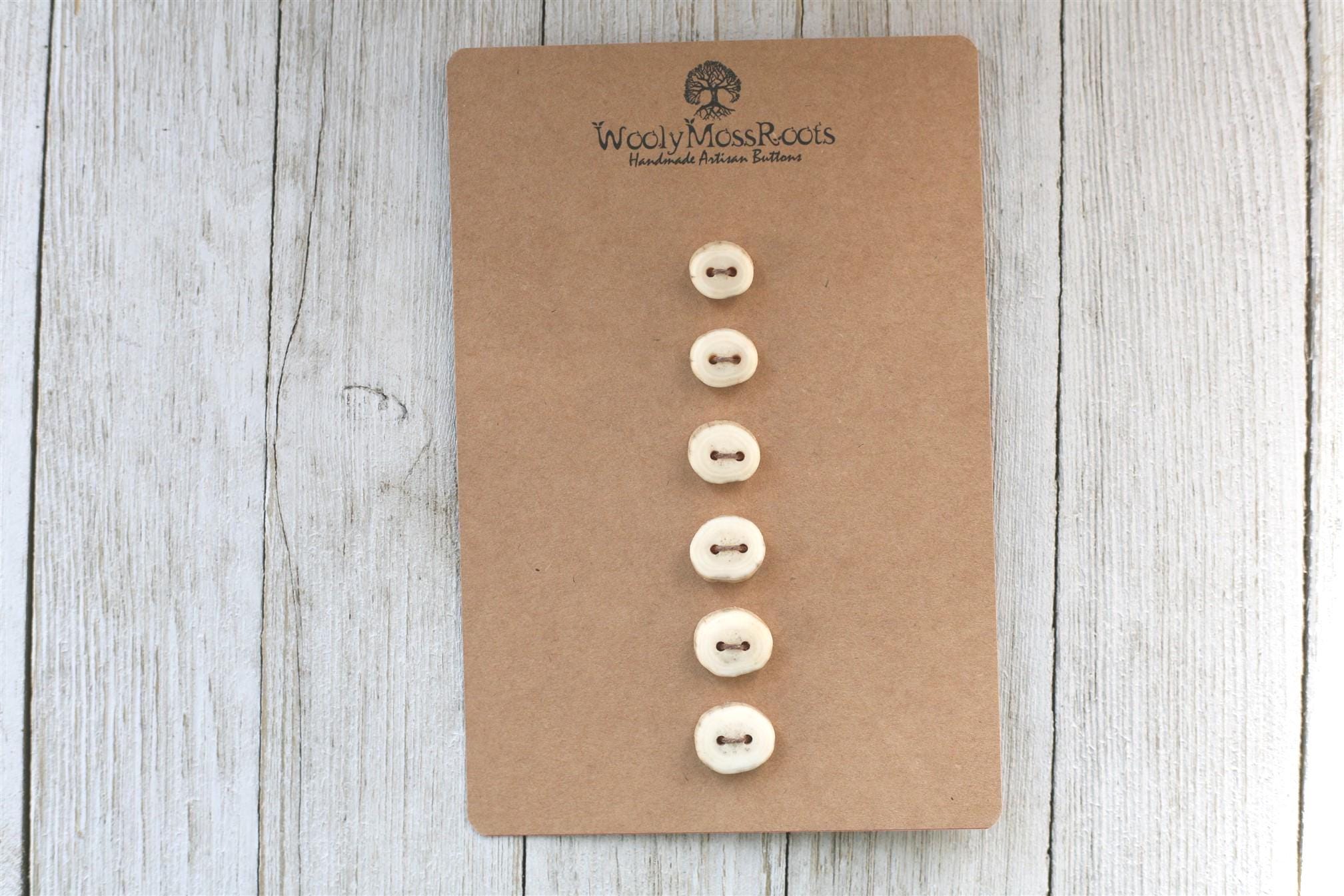 The deer antler can change size quickly, making it more challenging to get many buttons in the same size to make a matching set. The sets feel like a treasure! The sizes do vary in this particular set so keep that in mind for your project. I like to refer to sets like this as "cascading sizes"~ the button sizes go with the natural graduation of the antler~ and it gives such a cool look. One of my favorite things about this set? There are some rings in the antler that reminds me of rings of growth in trees.