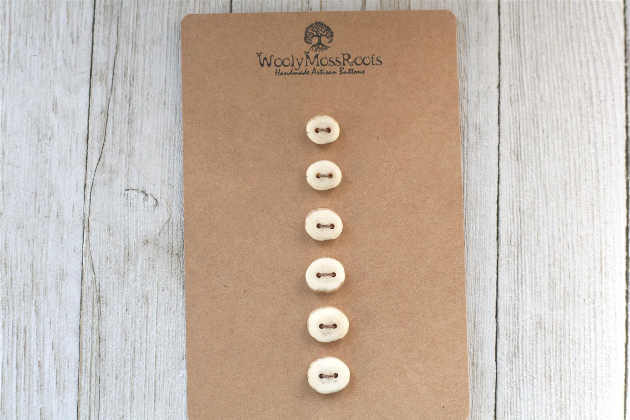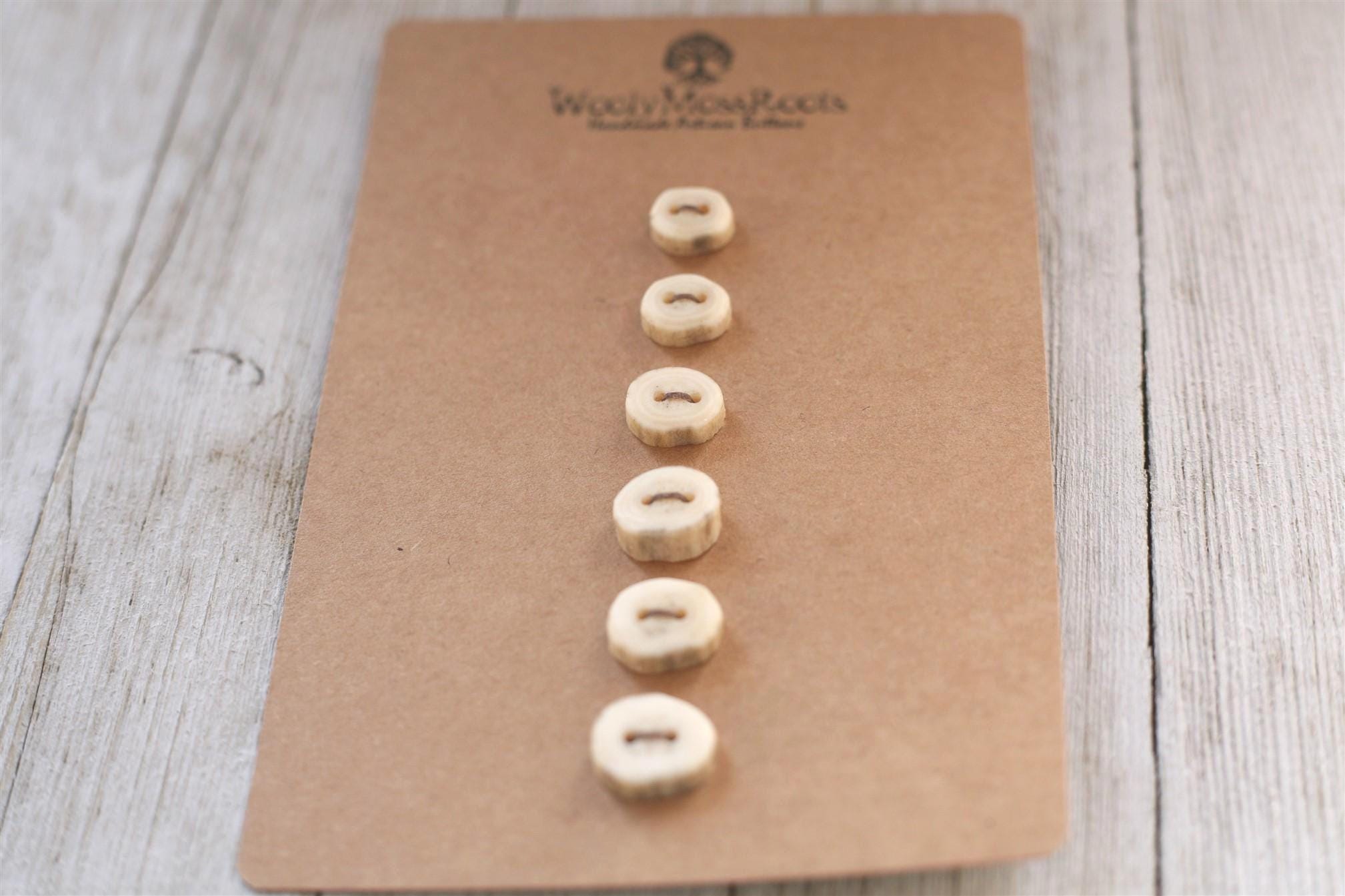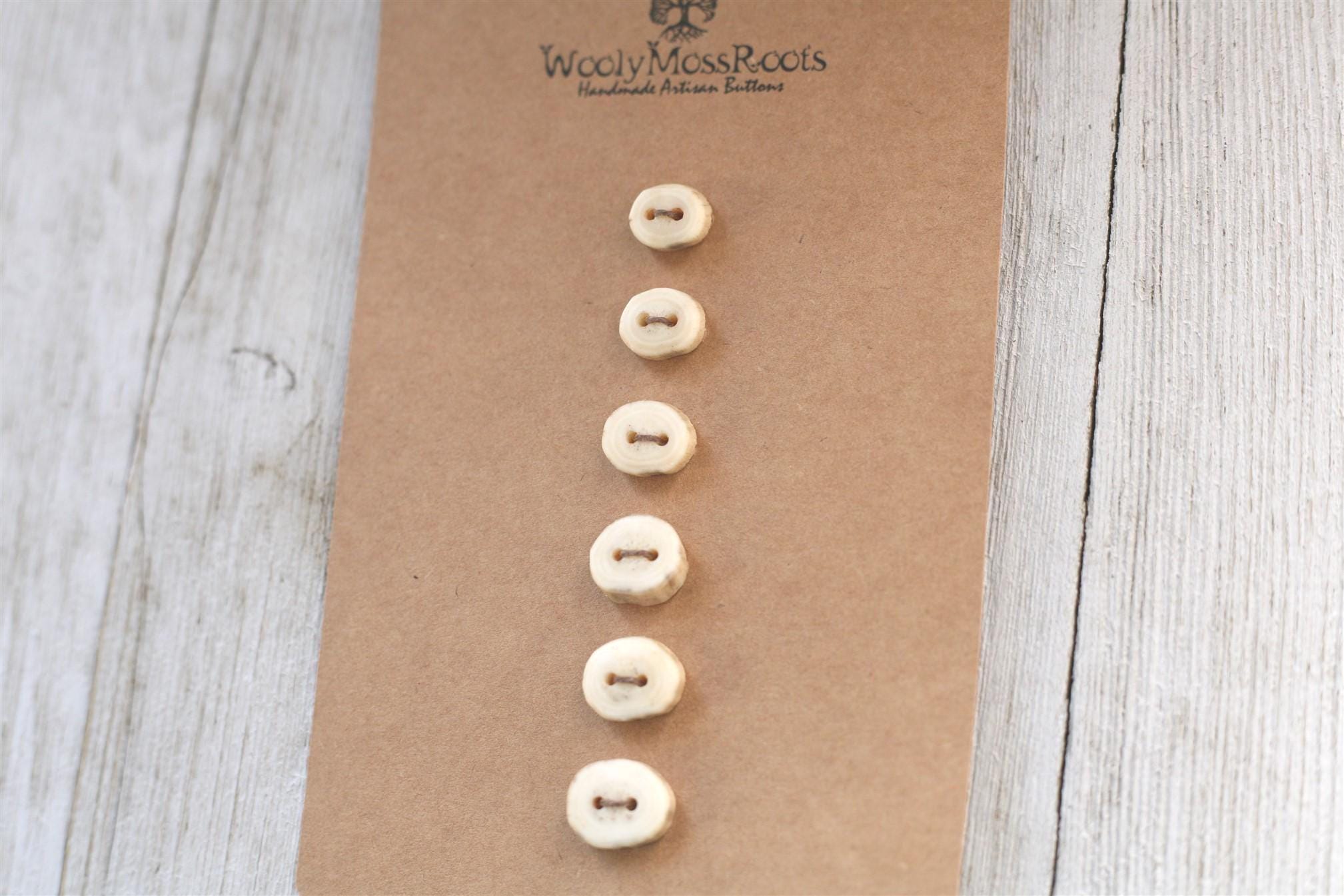 The deer antler can change size quickly, making it more challenging to get many buttons in the same size to make a matching set. The sets feel like a treasure! The sizes do vary in this particular set so keep that in mind for your project. I like to refer to sets like this as "cascading sizes"~ the button sizes go with the natural graduation of the antler~ and it gives such a cool look. One of my favorite things about this set? There are some rings in the antler that reminds me of rings of growth in trees.