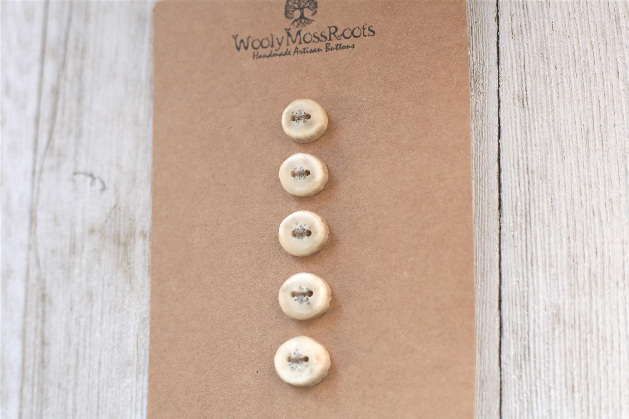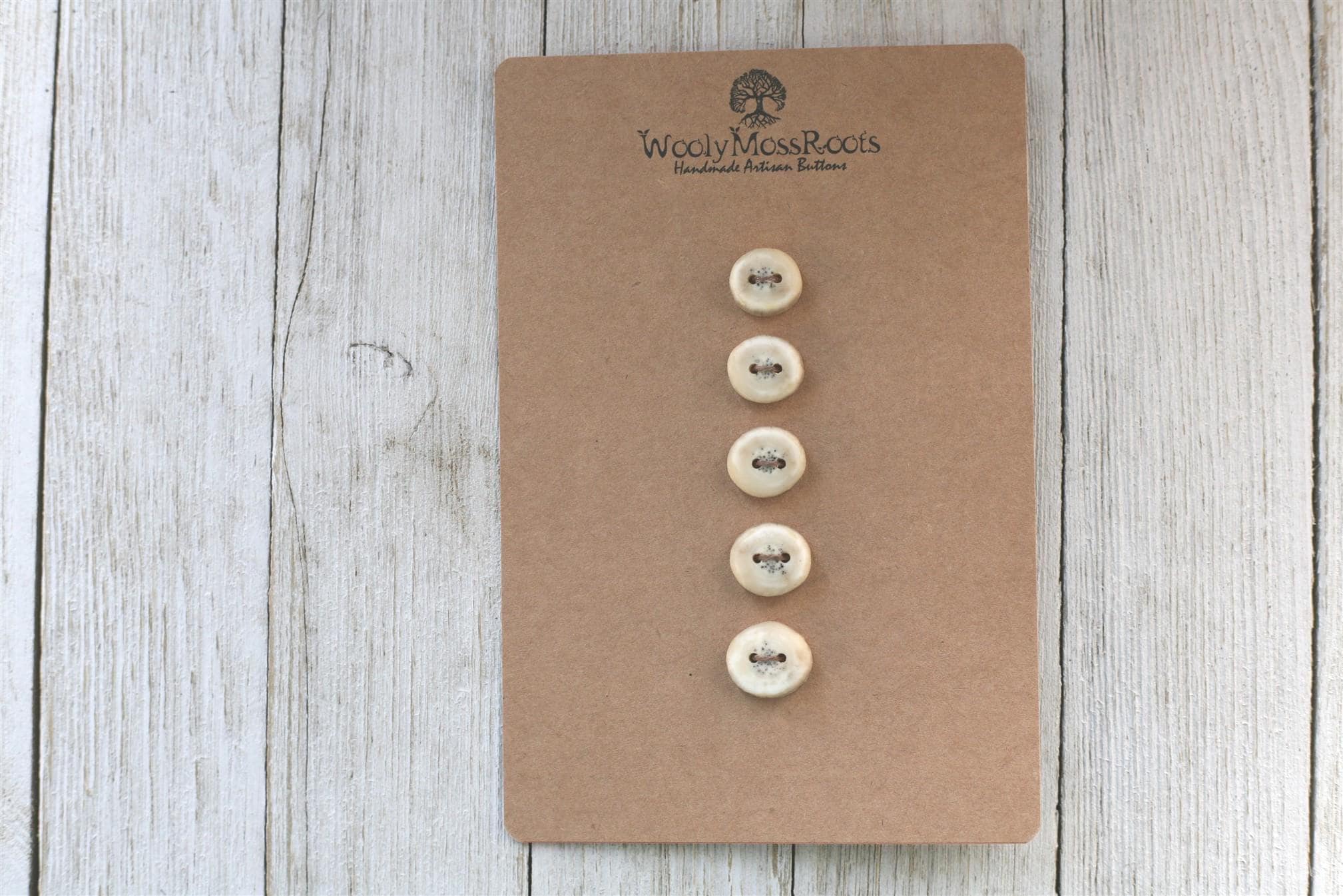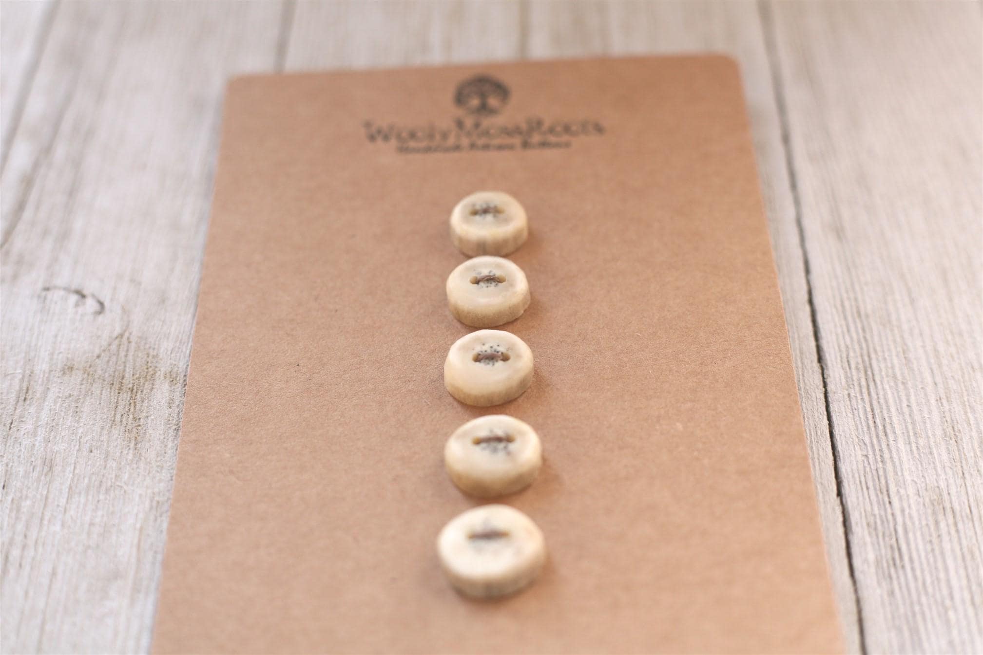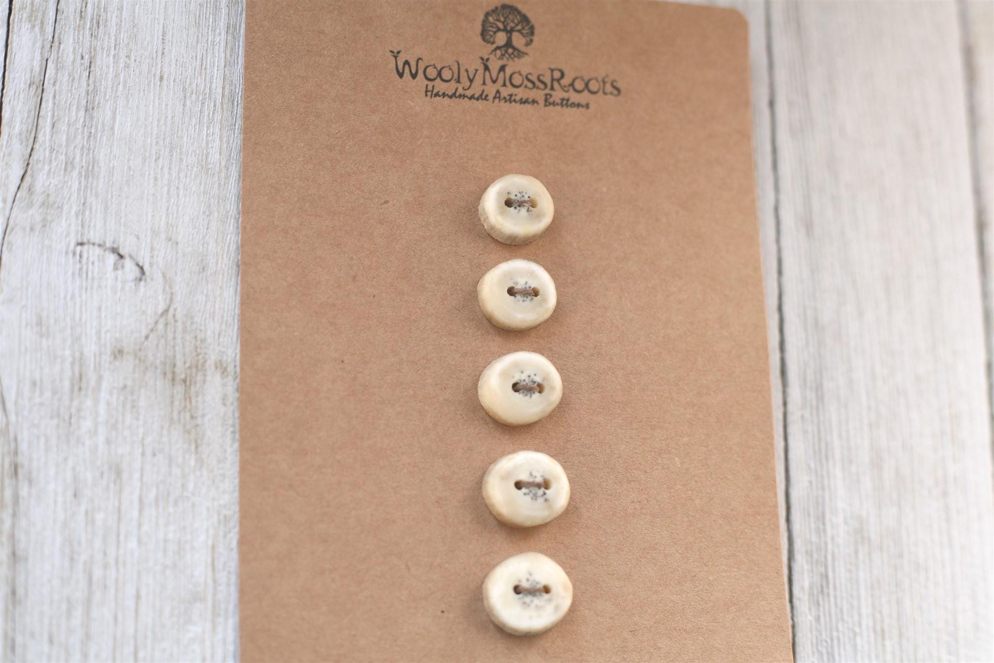 We absolutely love the antler buttons we offer! These buttons were created by my husband Jeff and I (Taryn) in shed deer antler. Male deer shed their antlers once a year and grow back new ones. The antlers make incredible buttons, not only for how well they hold up, but also for how beautiful they are.