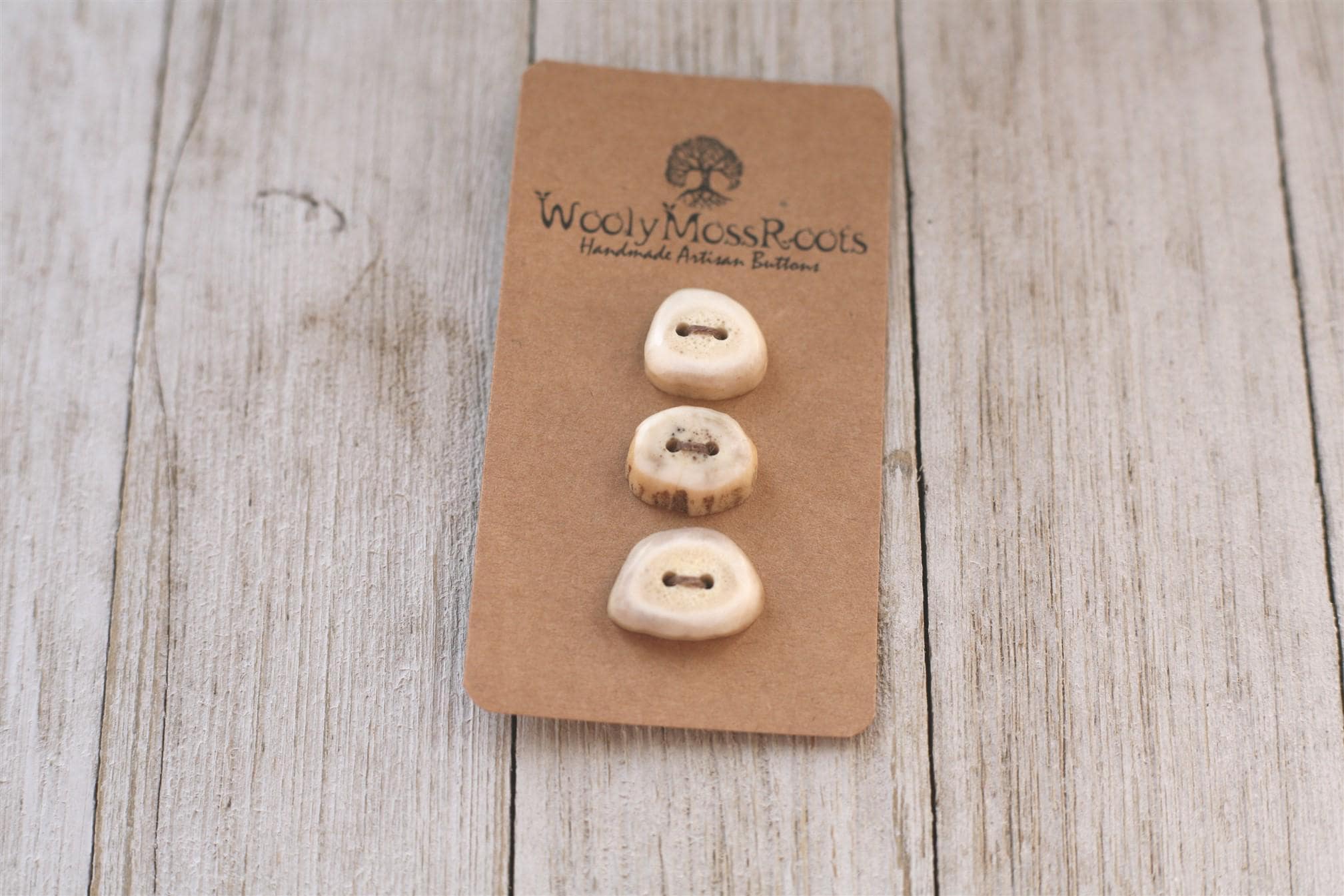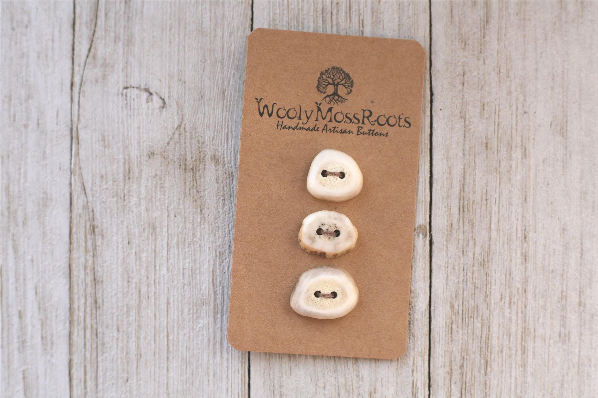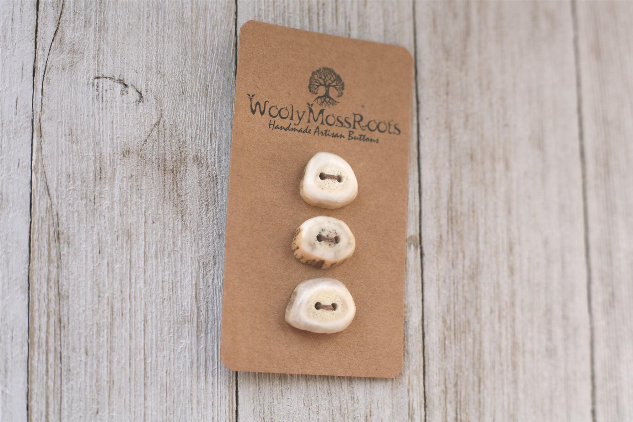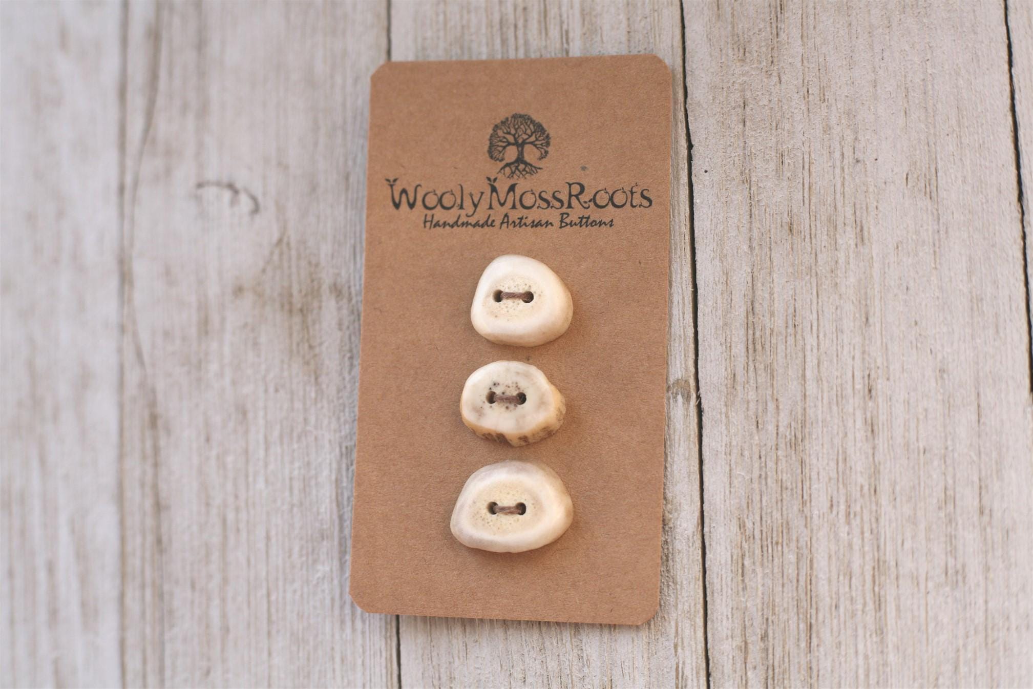 We absolutely love the antler buttons we offer! These buttons were created by my husband Jeff and I (Taryn) in shed deer antler. Male deer shed their antlers once a year and grow back new ones. The antlers make incredible buttons, not only for how well they hold up, but also for how beautiful they are.
