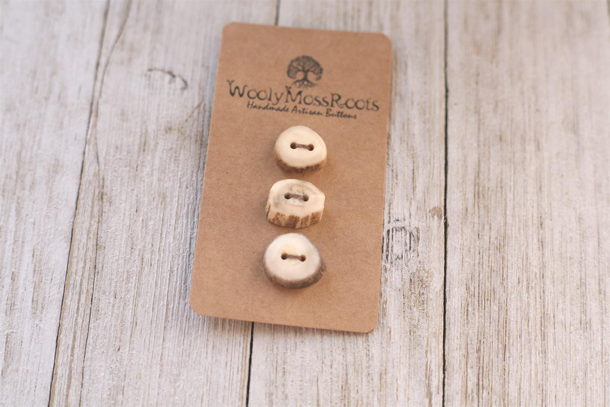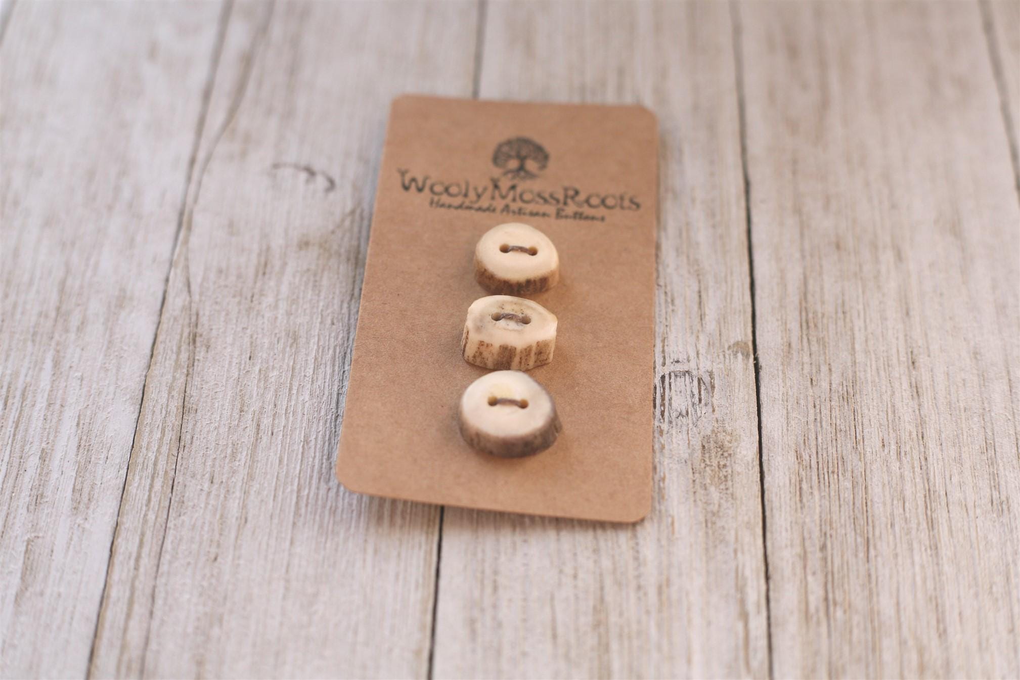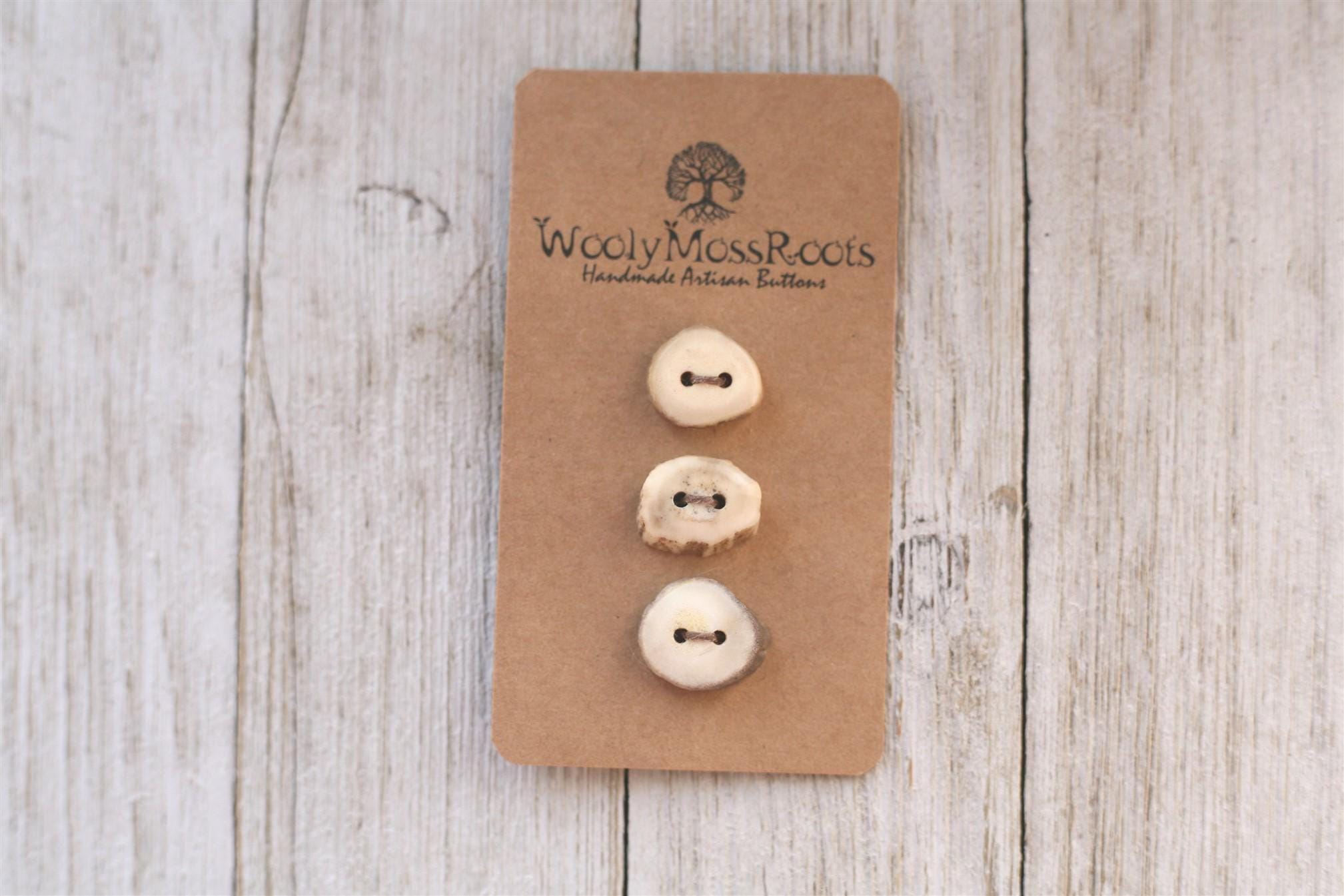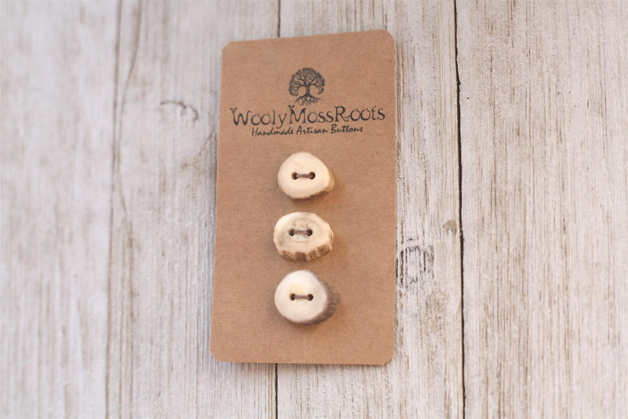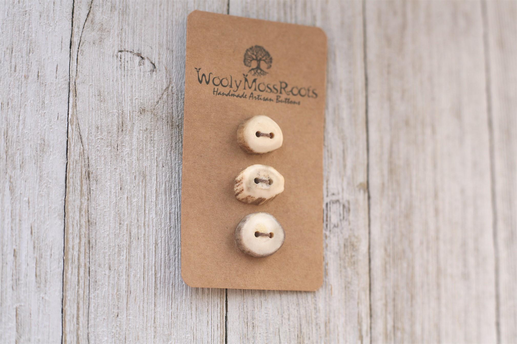 We absolutely love the antler buttons we offer! These buttons were created by my husband Jeff and I (Taryn) in shed deer antler. Male deer shed their antlers once a year and grow back new ones. The antlers make incredible buttons, not only for how well they hold up, but also for how beautiful they are.
